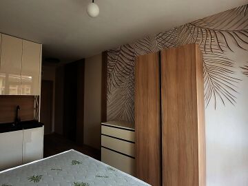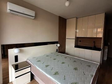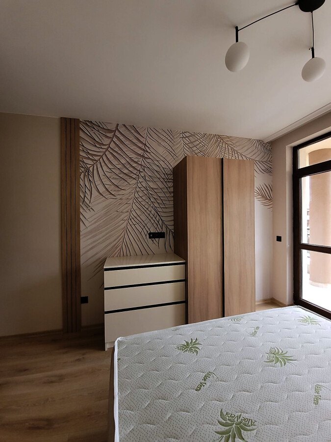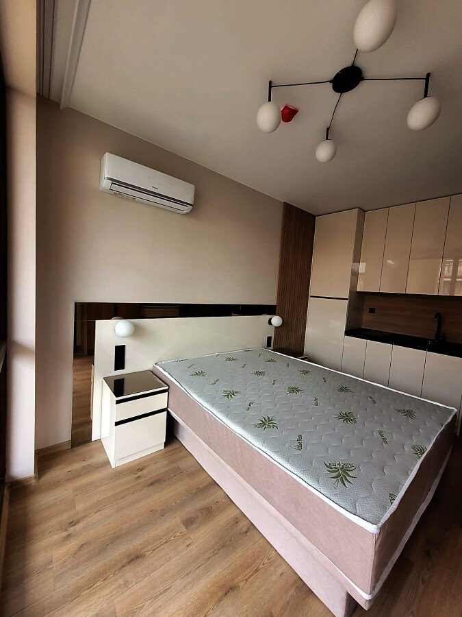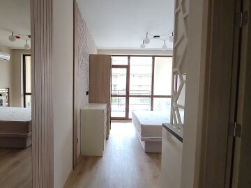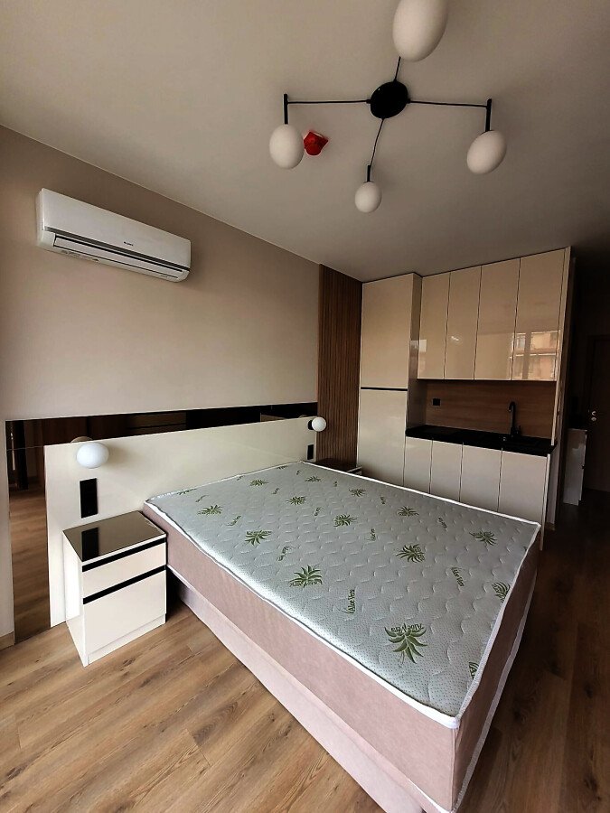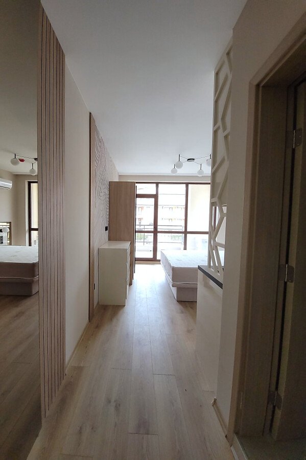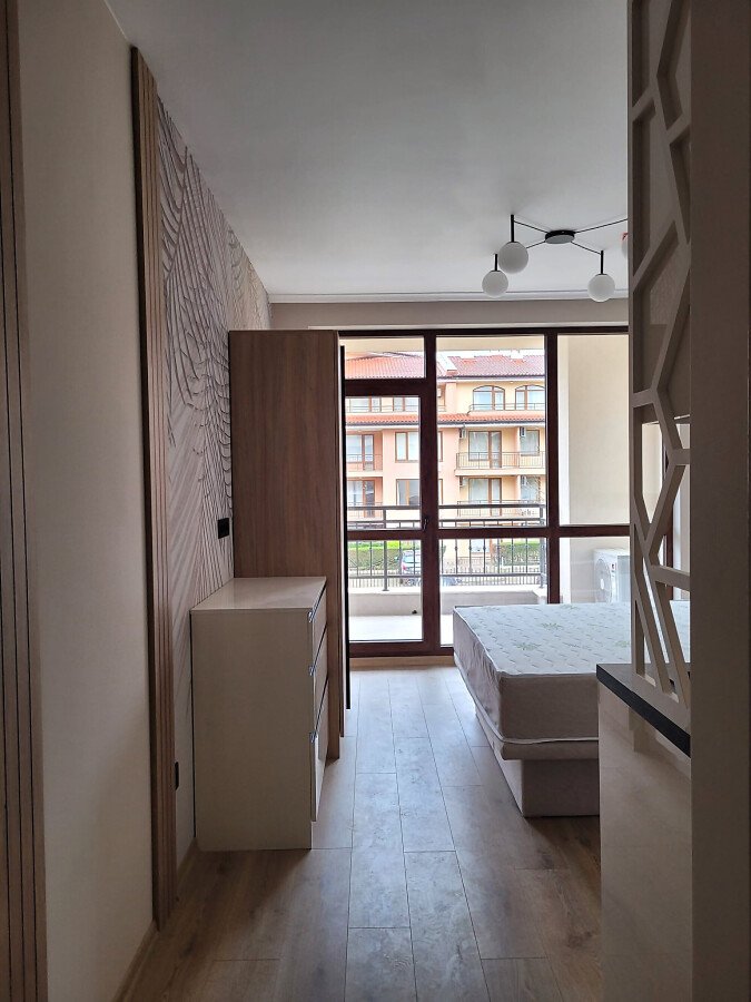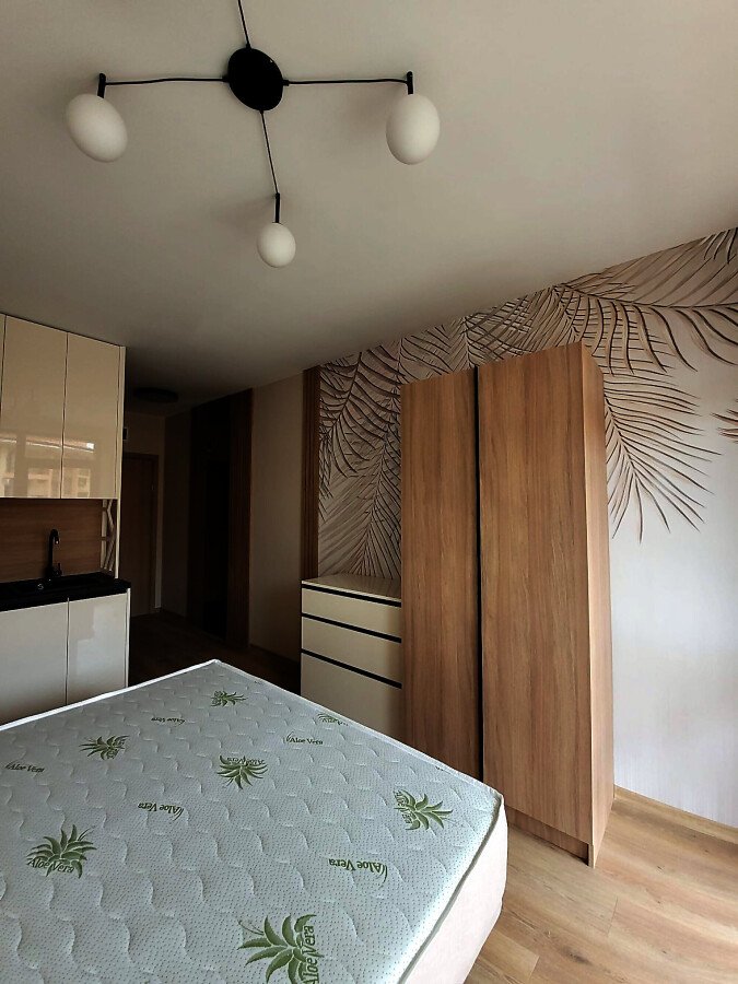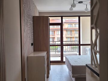 Студиото е на първи жилищен етаж и се продава чисто ново, със стилно обзавеждане и качествено оборудване. Състои се от входно антре, всекидневна с кухненски бокс и спалня, баня с тоалетна и душ кабина, чудесна и просторна тераса.