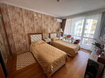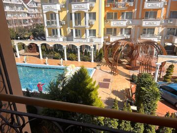 Предлагаме за продажба луксозен тристаен апартамент с гледка към басейна в прекрасния затворен комплекс „Sweet Homes 5”, разположен в тихата част на популярния морски курорт Слънчев бряг, на 650 метра от плажната ивица. Комплексът впечатлява с елегантна архитектура, стилен интериор, висококачествено строителство и многобройни удобства.