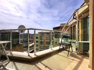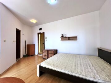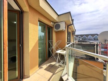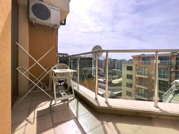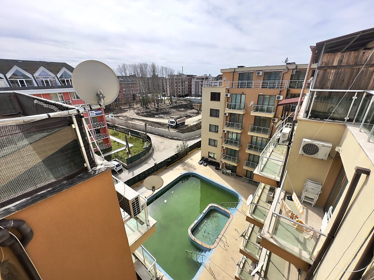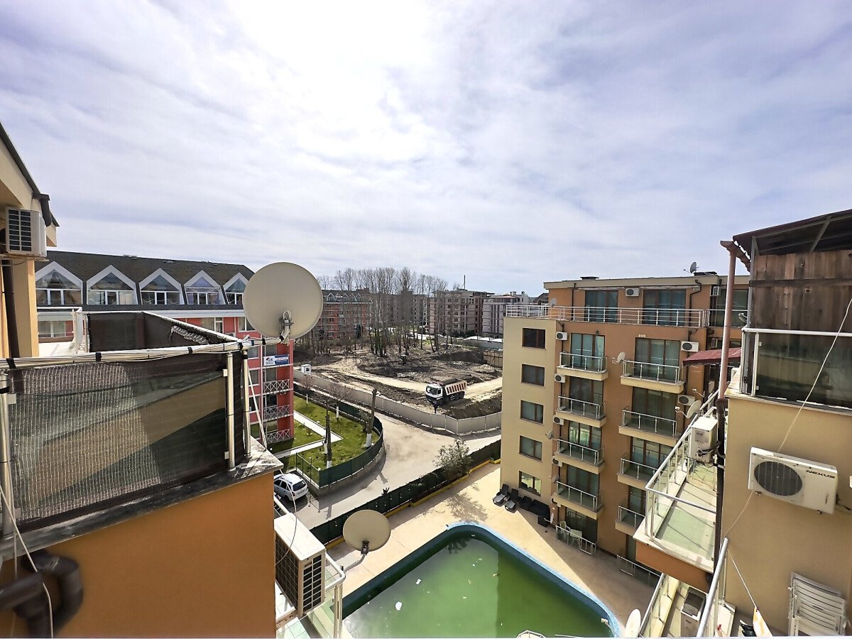 Апартаментът е разположен на шести, последен етаж, в сграда с асансьор и се състои от голяма всекидневна с обособена спалня, зона за хранене и оборудван кухненски бокс, баня с тоалетна, просторен балкон с красива гледка към басейна.