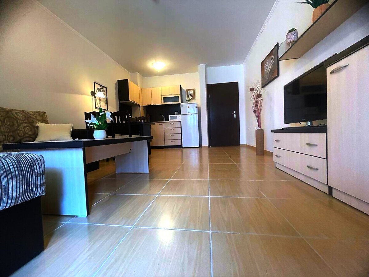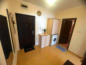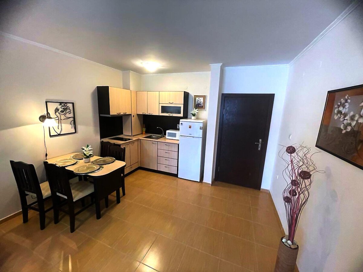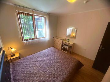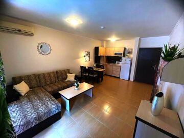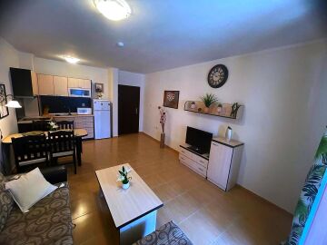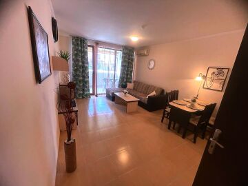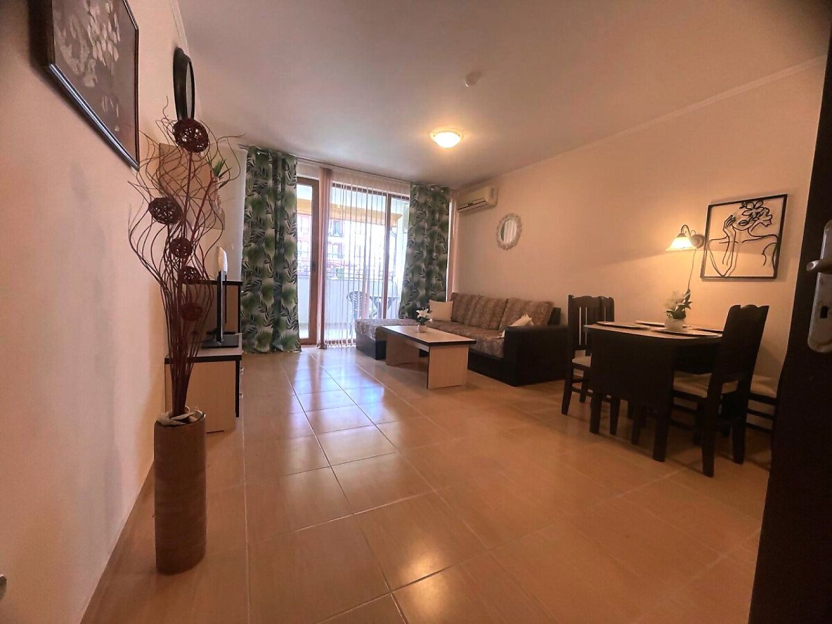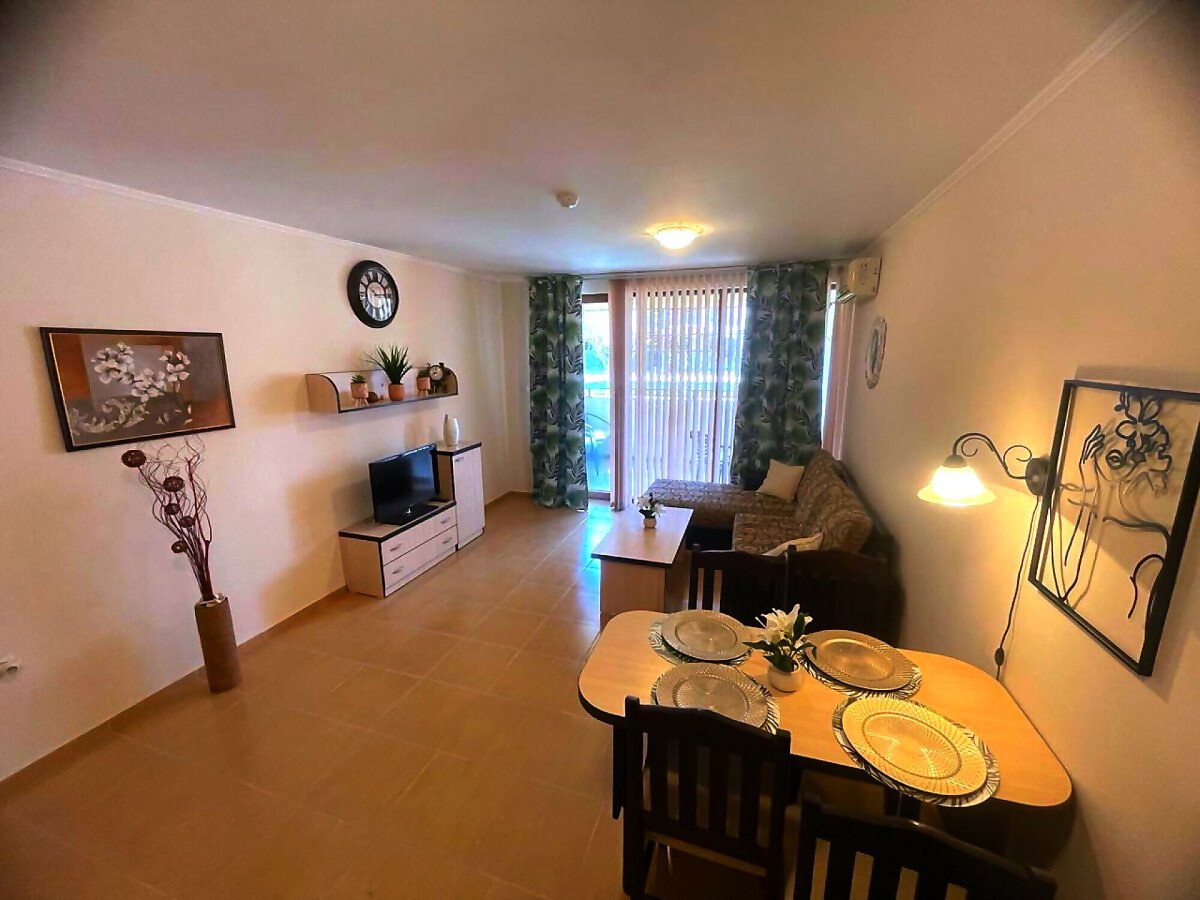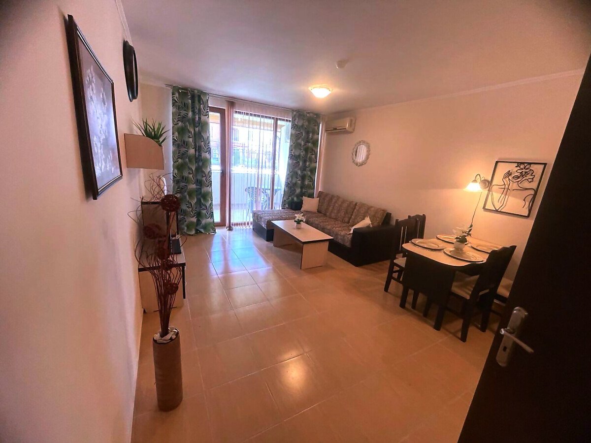 Апартаментът е на партерен етаж и се състои от входно антре, голяма всекидневна с напълно оборудван кухненски бокс и кът за хранене, уютна спалня, баня с тоалетна и вана, просторен балкон с красив изглед към басейна и озеленената градина на комплекса.
