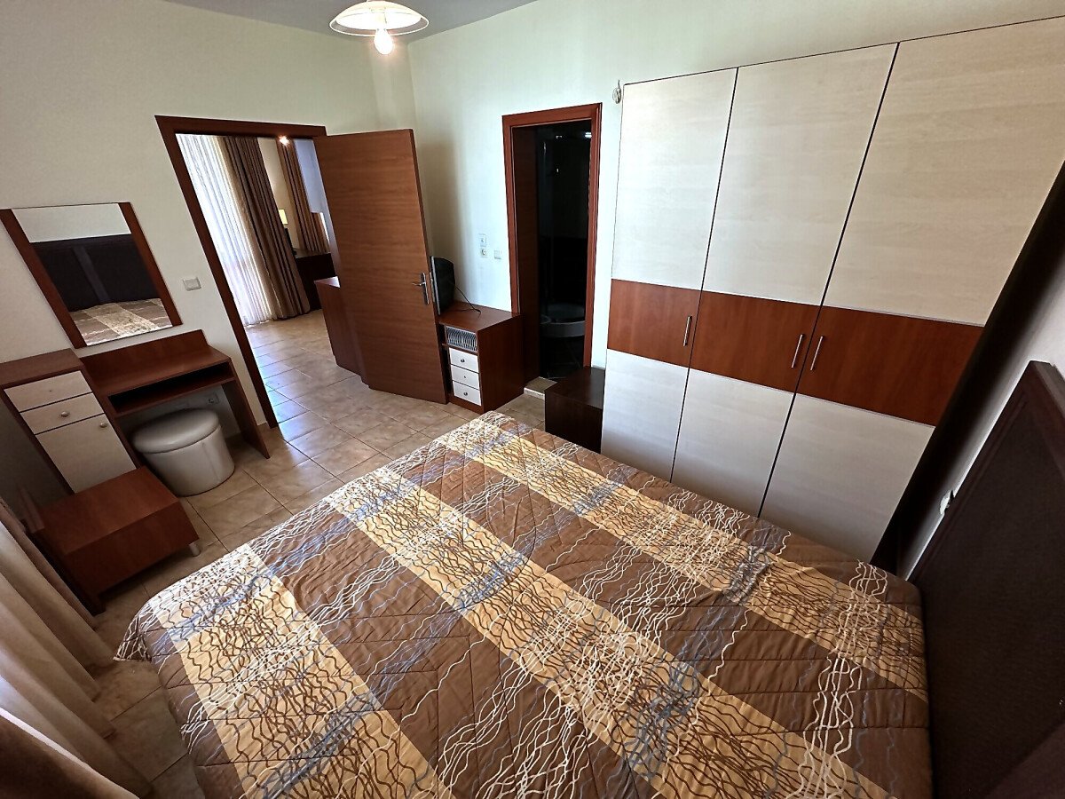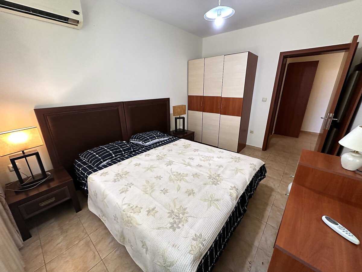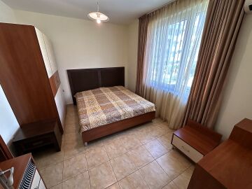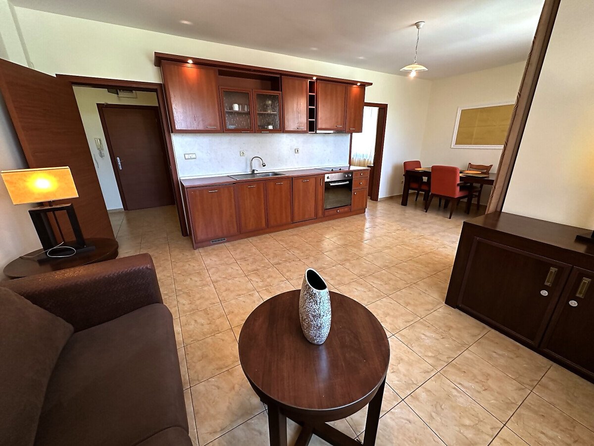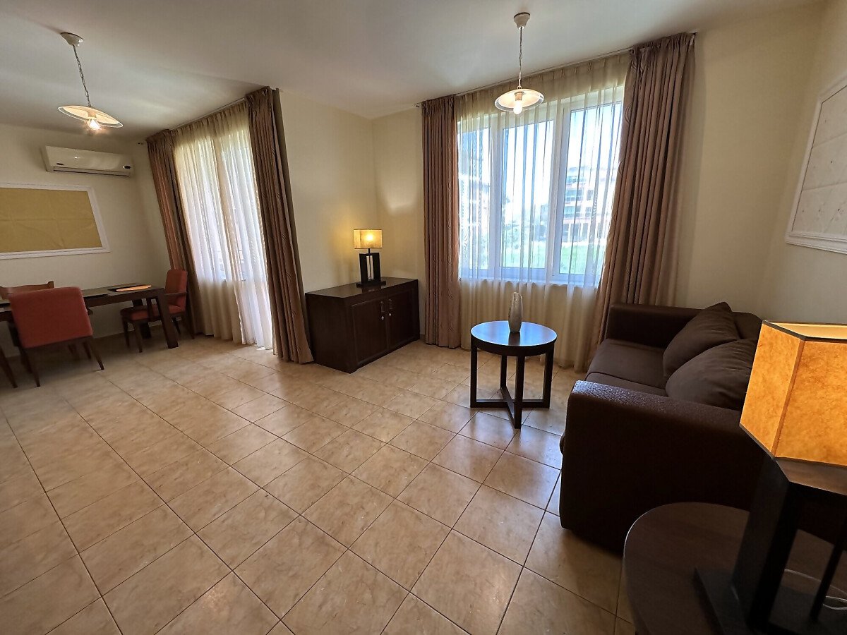 Апартаментът е на втори етаж, обзаведен и оборудван, със следното разпределение – входно антре, голяма всекидневна с трапезария и кухня, две спални, две бани с тоалетна и душ кабина, балкон с хубав изглед към озеленената част на комплекса.