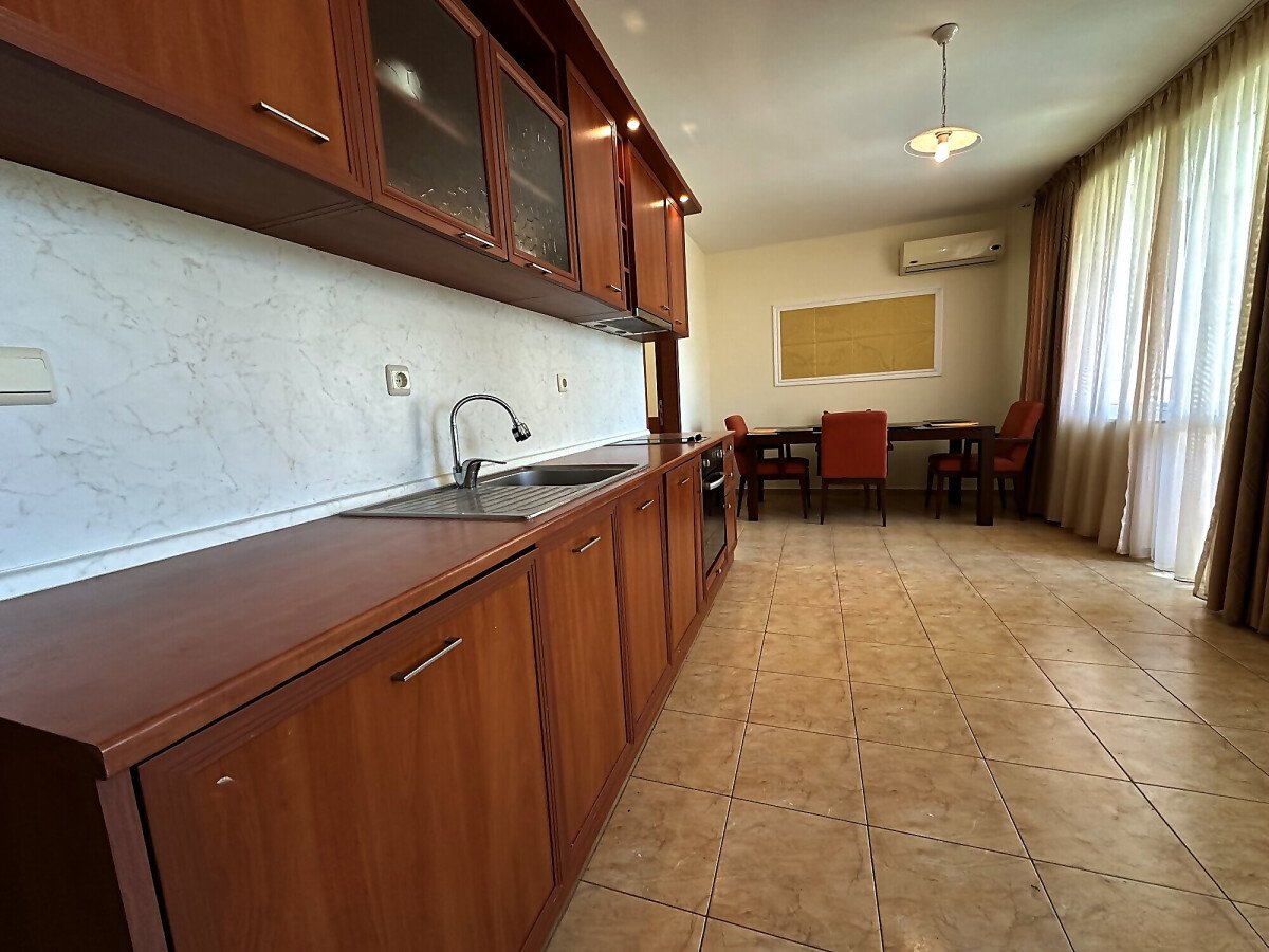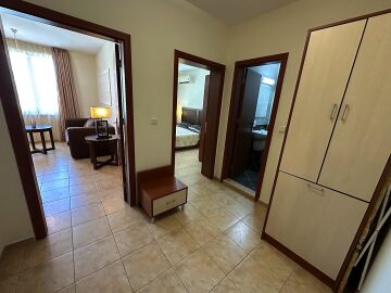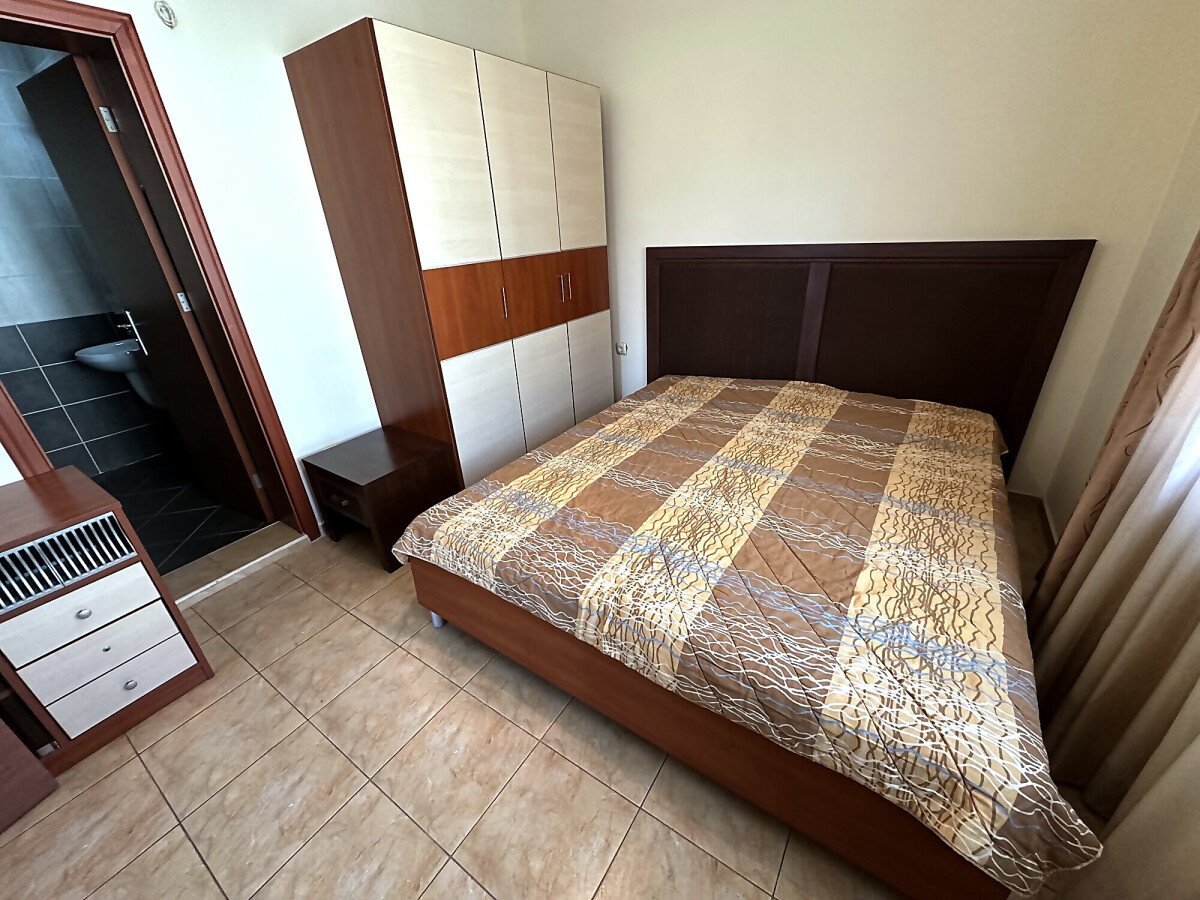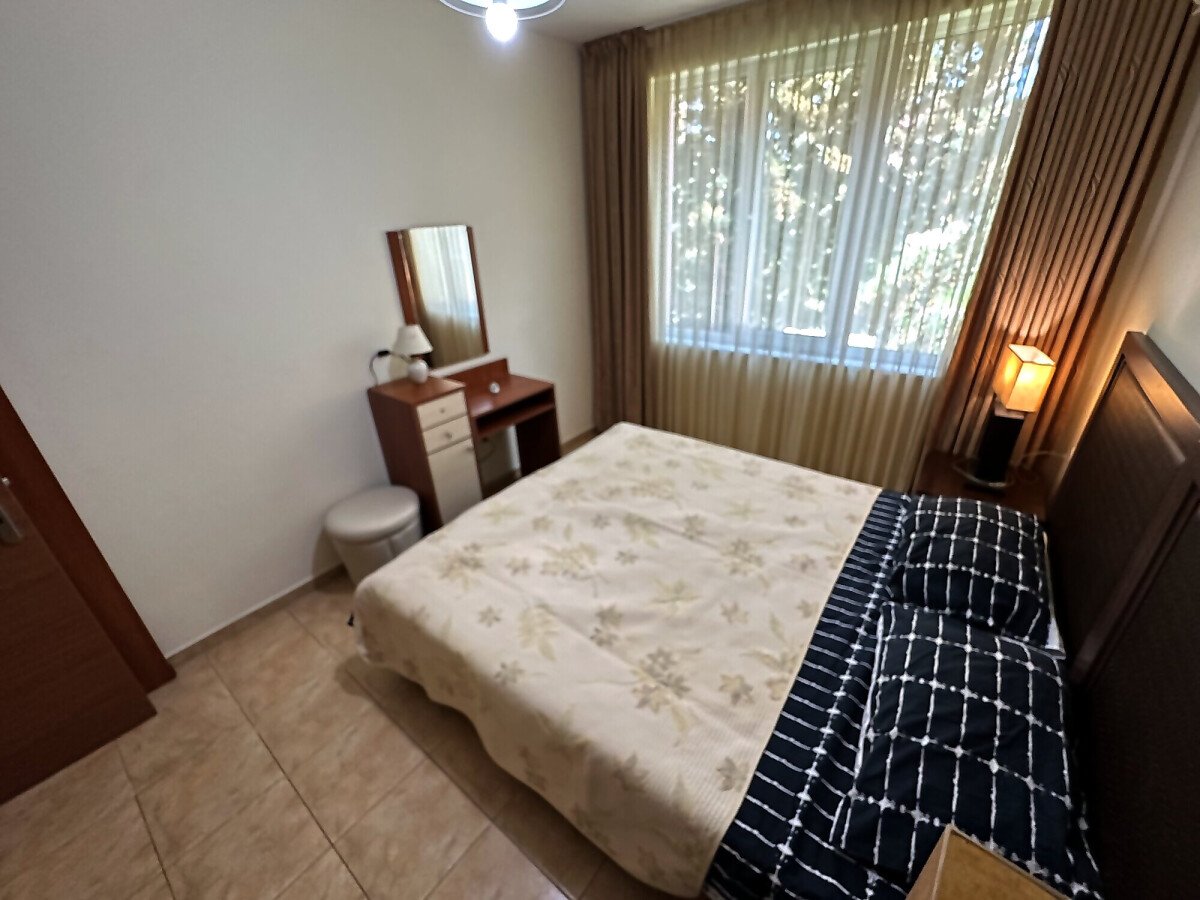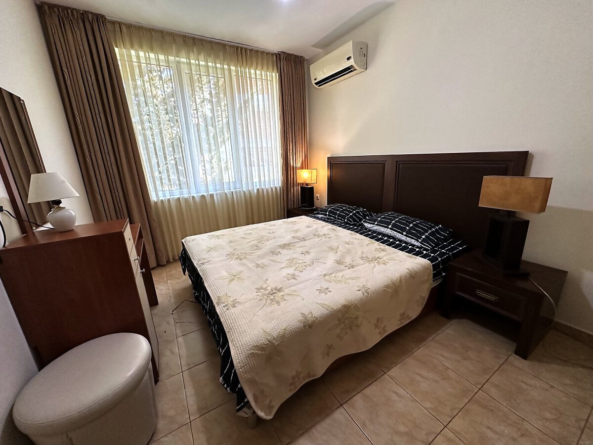 Апартаментът е на втори етаж, обзаведен и оборудван, със следното разпределение – входно антре, голяма всекидневна с трапезария и кухня, две спални, две бани с тоалетна и душ кабина, балкон с хубав изглед към озеленената част на комплекса.