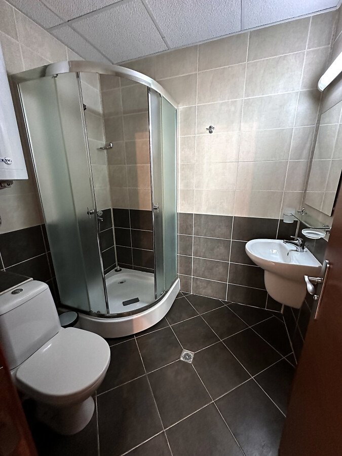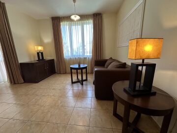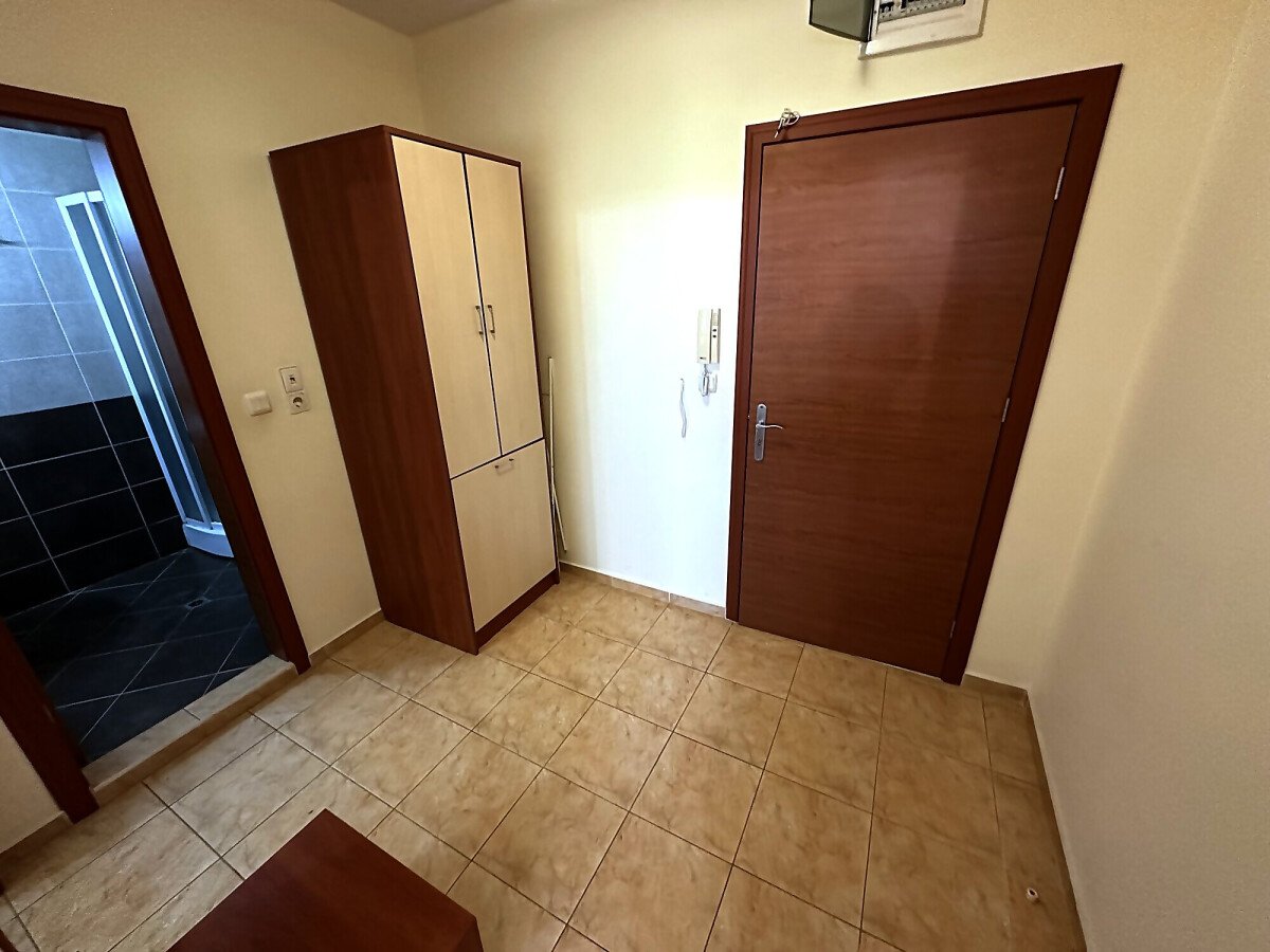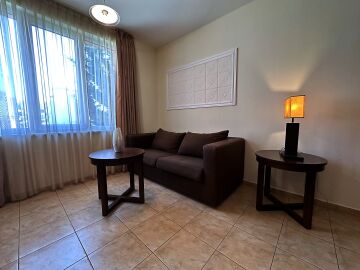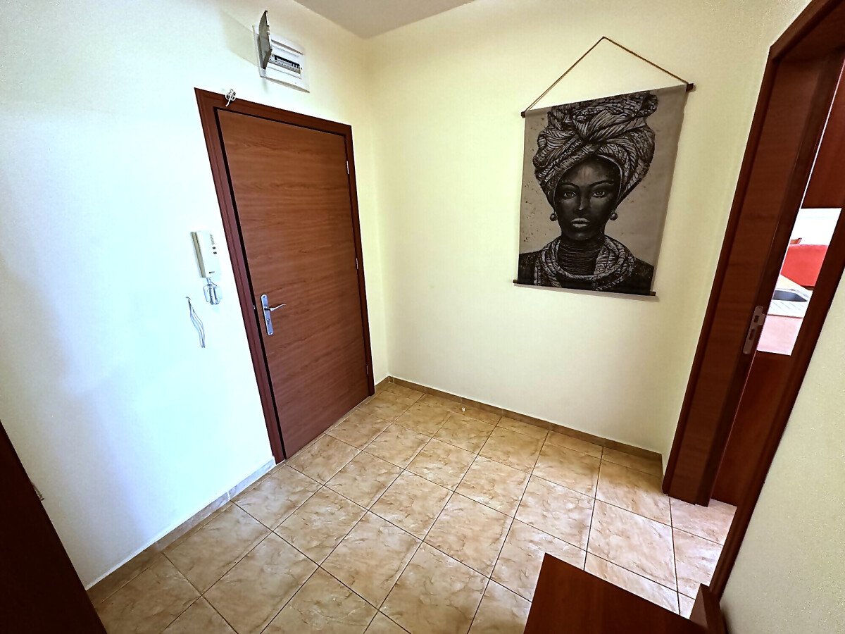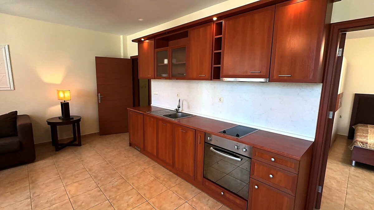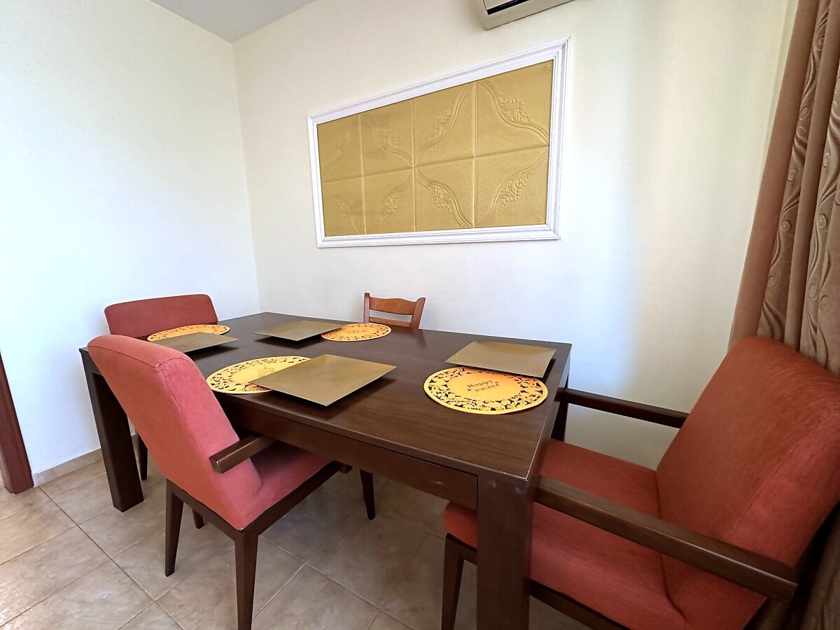Апартаментът е на втори етаж, обзаведен и оборудван, със следното разпределение – входно антре, голяма всекидневна с трапезария и кухня, две спални, две бани с тоалетна и душ кабина, балкон с хубав изглед към озеленената част на комплекса.