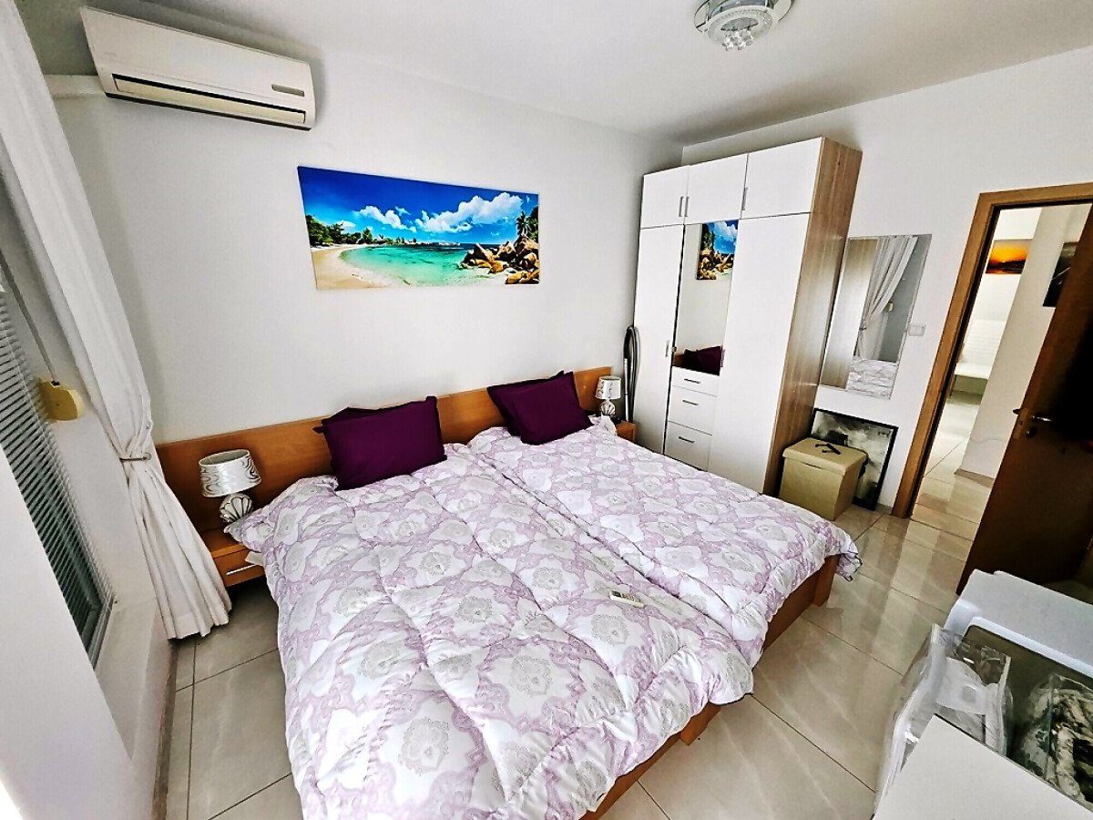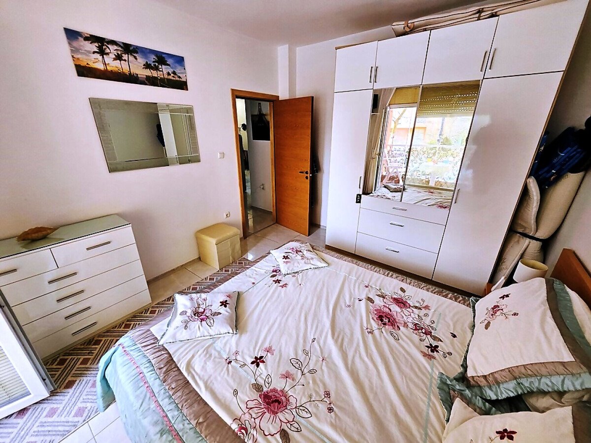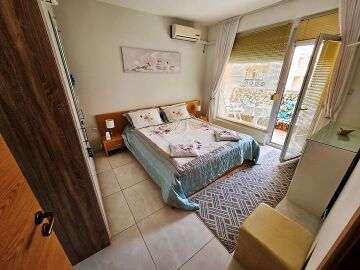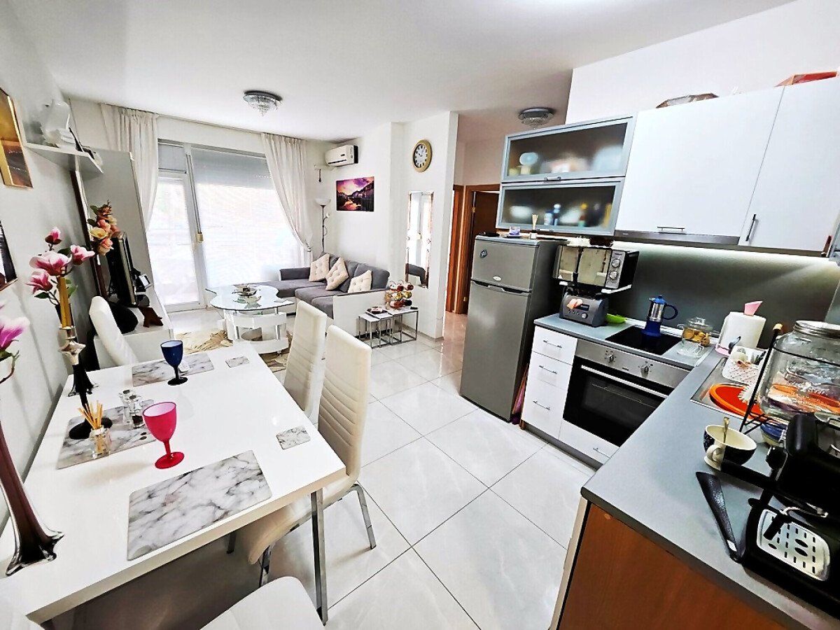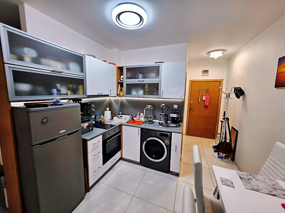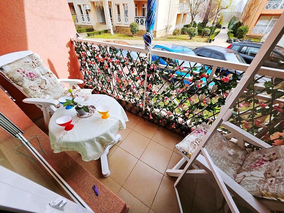 Апартаментът е на първи етаж, обзаведен и оборудван с нови мебели и нова качествена техника, със следното разпределение – входно антре, уютна всекидневна с кът за хранене и кухненски бокс, гардеробна, две спални, баня с тоалетна и душ кабина, балкон с красива гледка към озеленения двор на комплекса.
