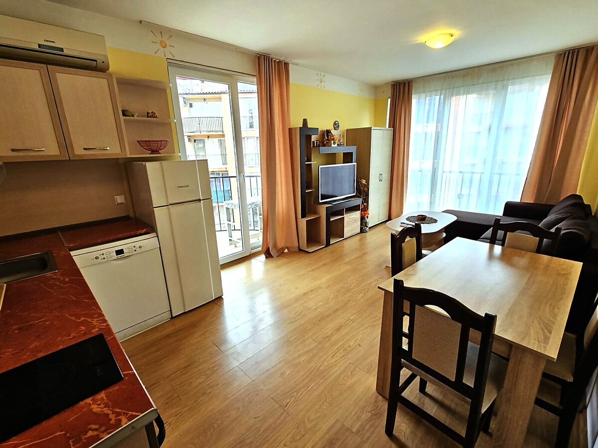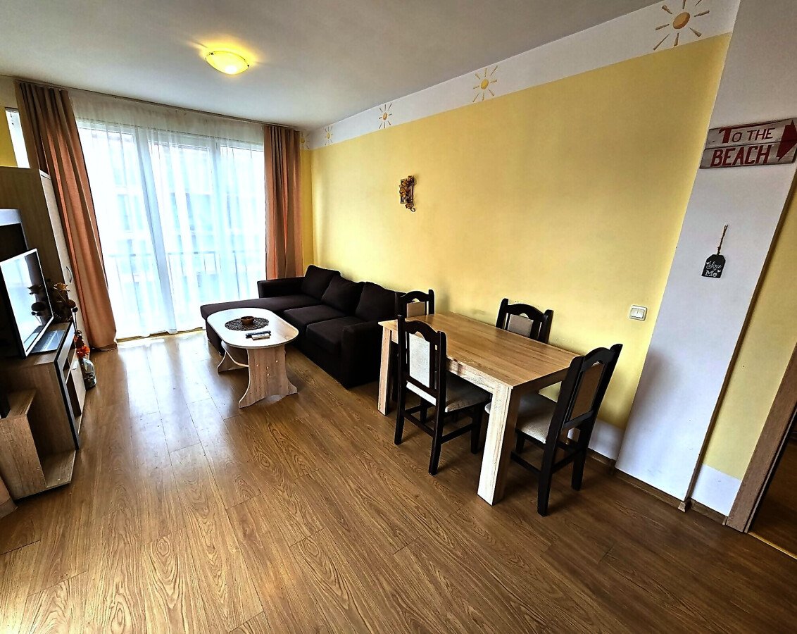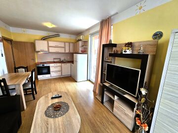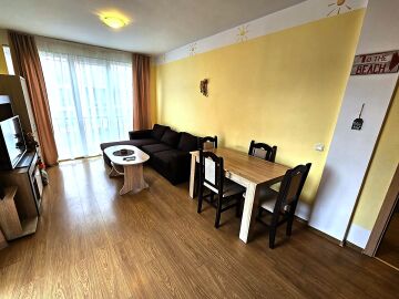 Жилището се продава в отлично състояние, напълно обзаведено и оборудвано, със следното разпределение – входно антре, просторна всекидневна с кът за хранене и обособен кухненски бокс, уютна спалня, баня с тоалетна и душ кабина, удобен балкон с изглед към озеленените площи и към басейна.