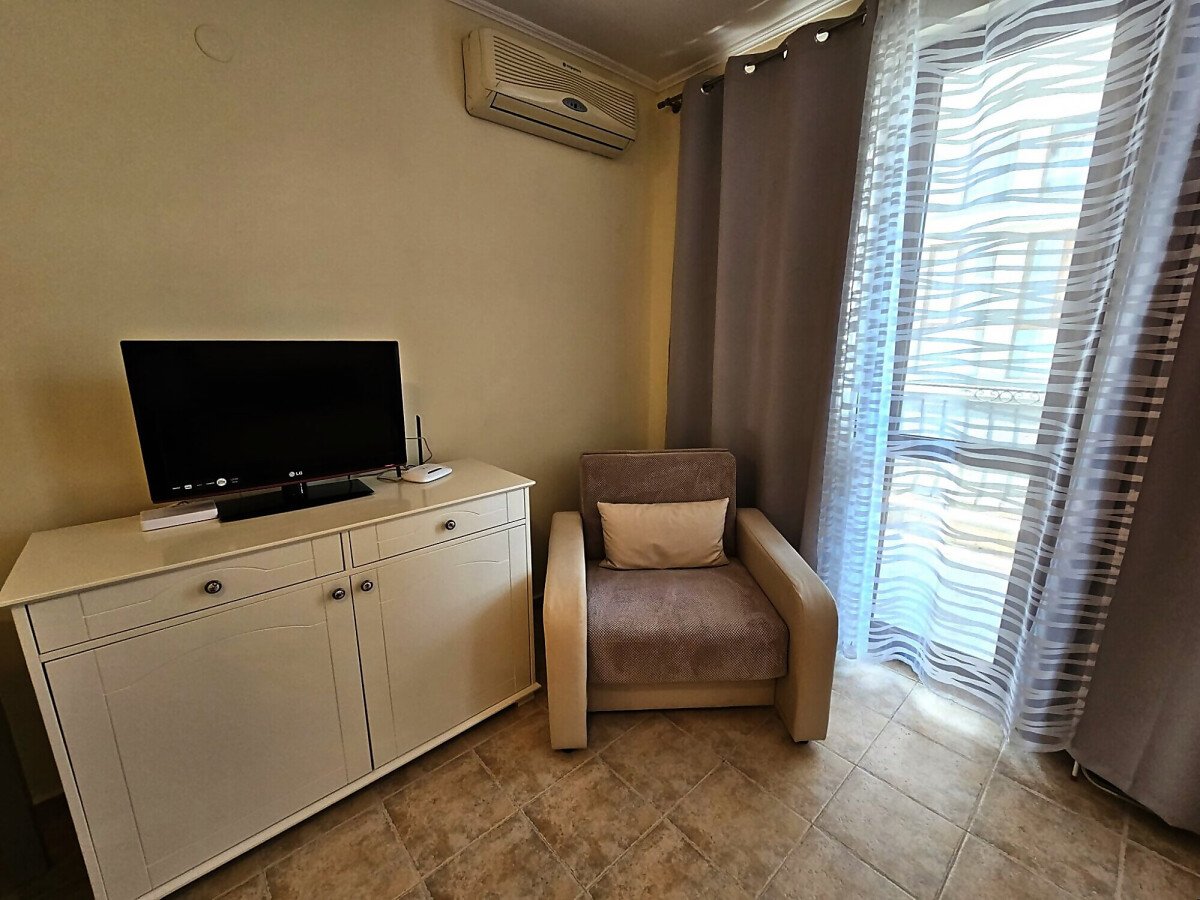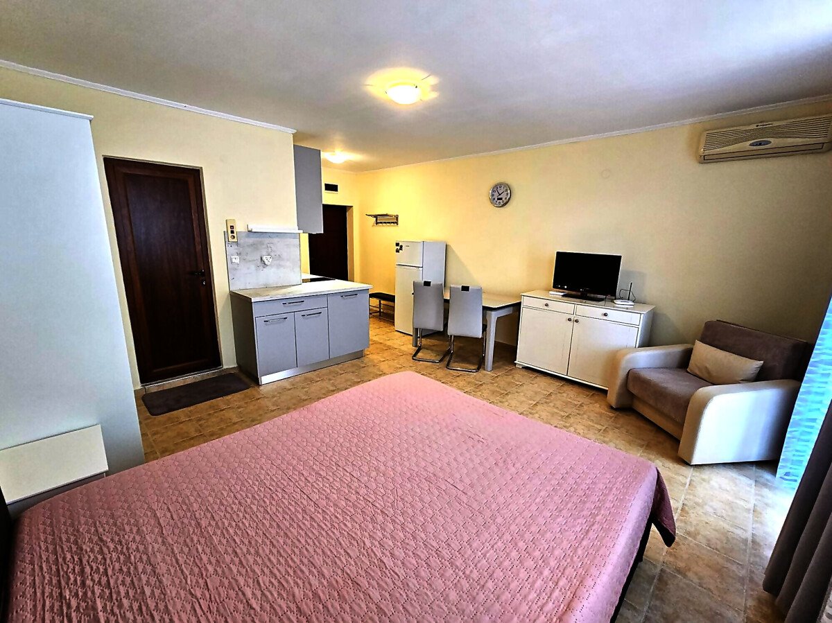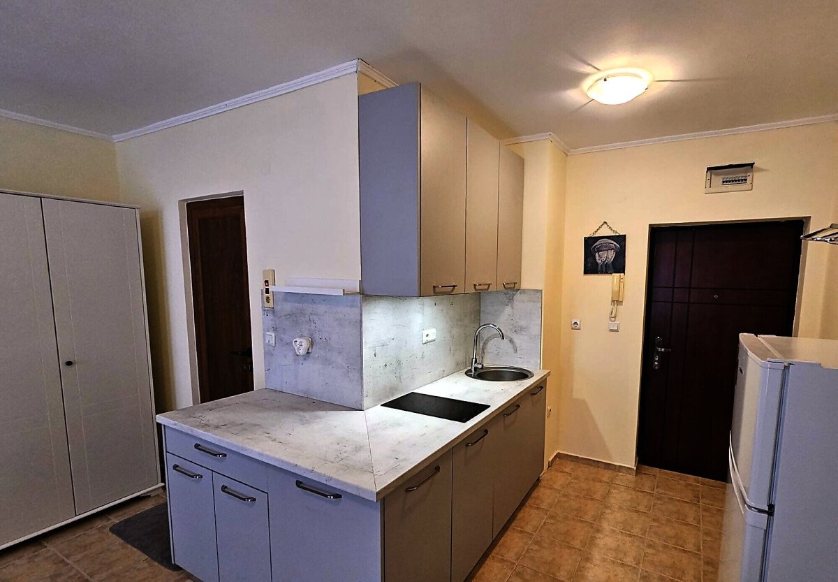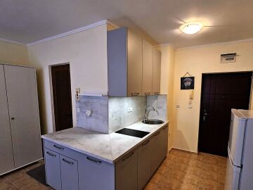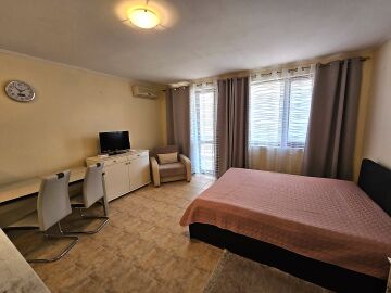 Студиото е на втори етаж и се продава напълно обзаведено и оборудвано, със следното разпределение – входно антре, обособен кухненски бокс, просторна всекидневна със спалня и кът за хранене, баня с тоалетна, удобен балкон с хубав изглед.
