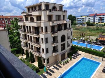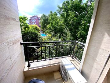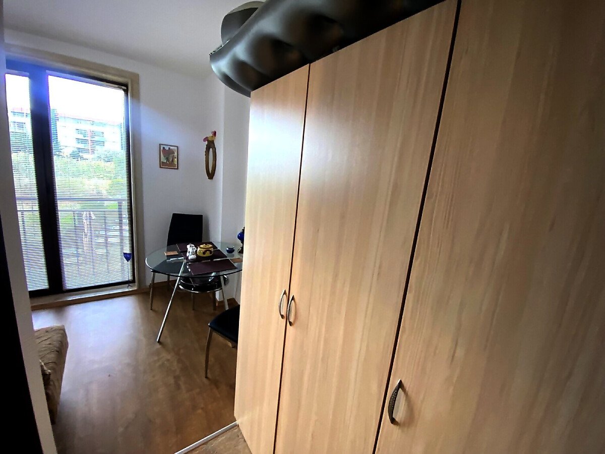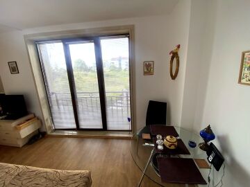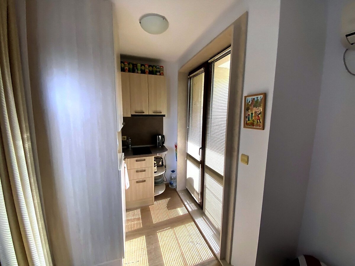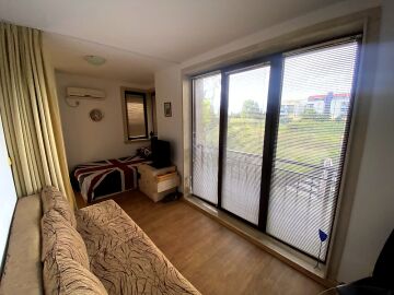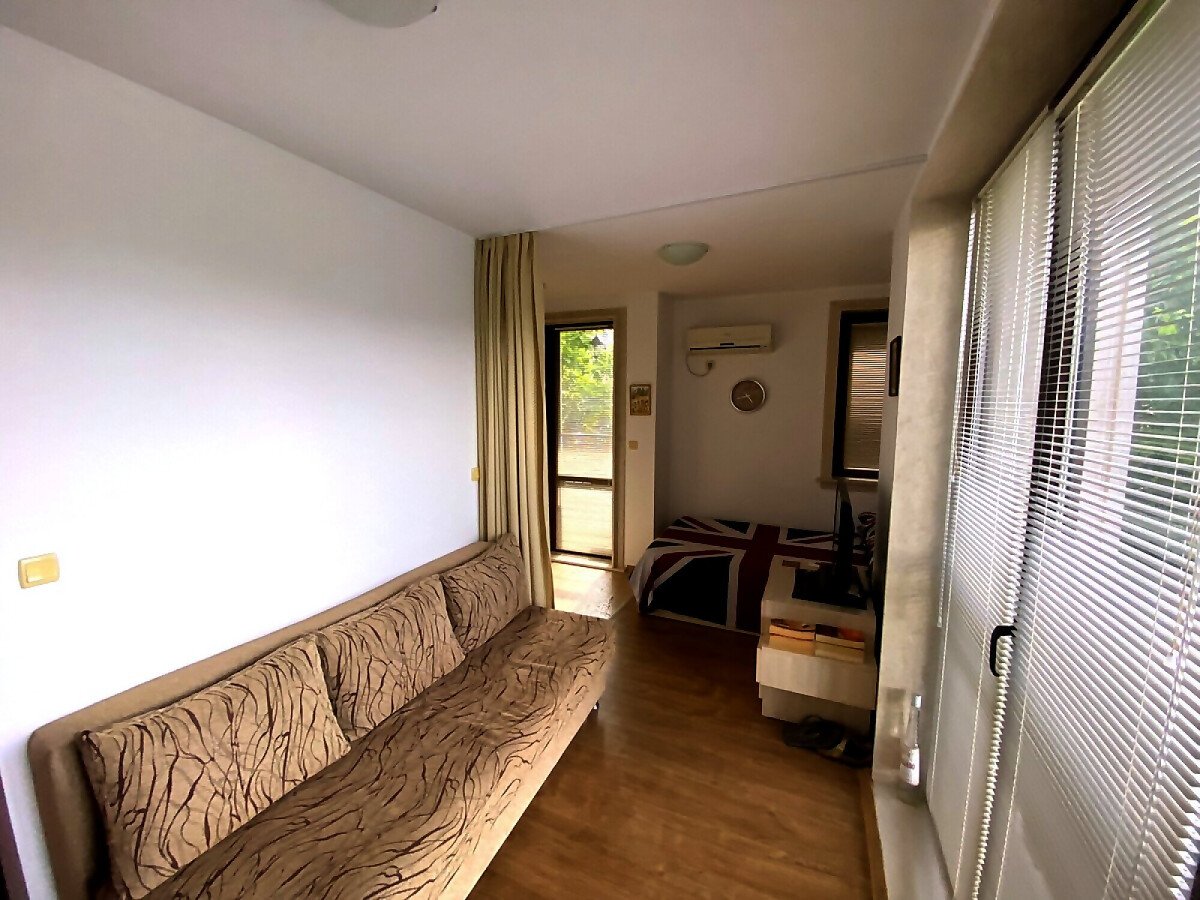Студиото се продава в много добро състояние, с необходимите мебели и домакинска електротехника, със следното разпределение – входно антре, всекидневна с обособена спалня и кухненски бокс, баня с тоалетна, тераса с красив изглед към озеленения двор на комплекса и към басейна.