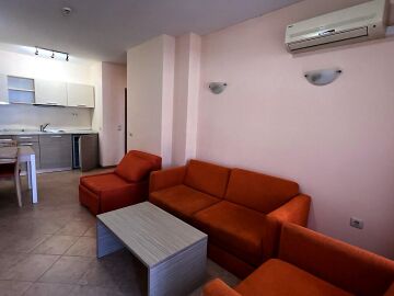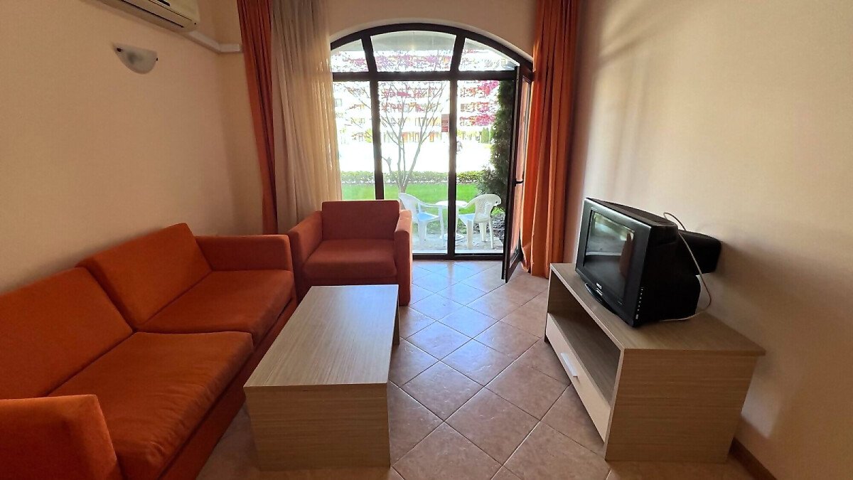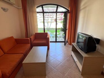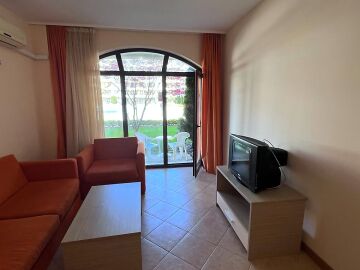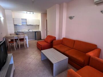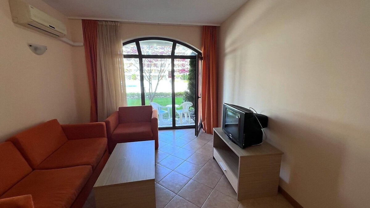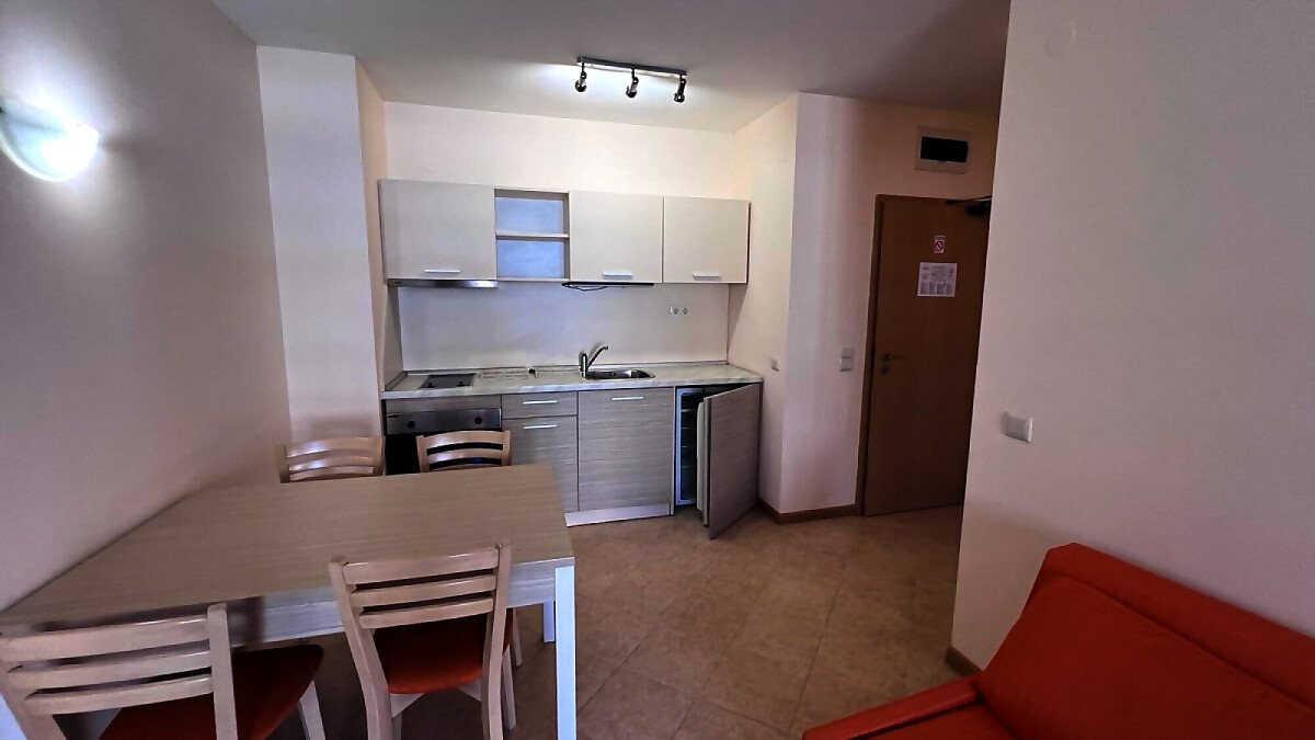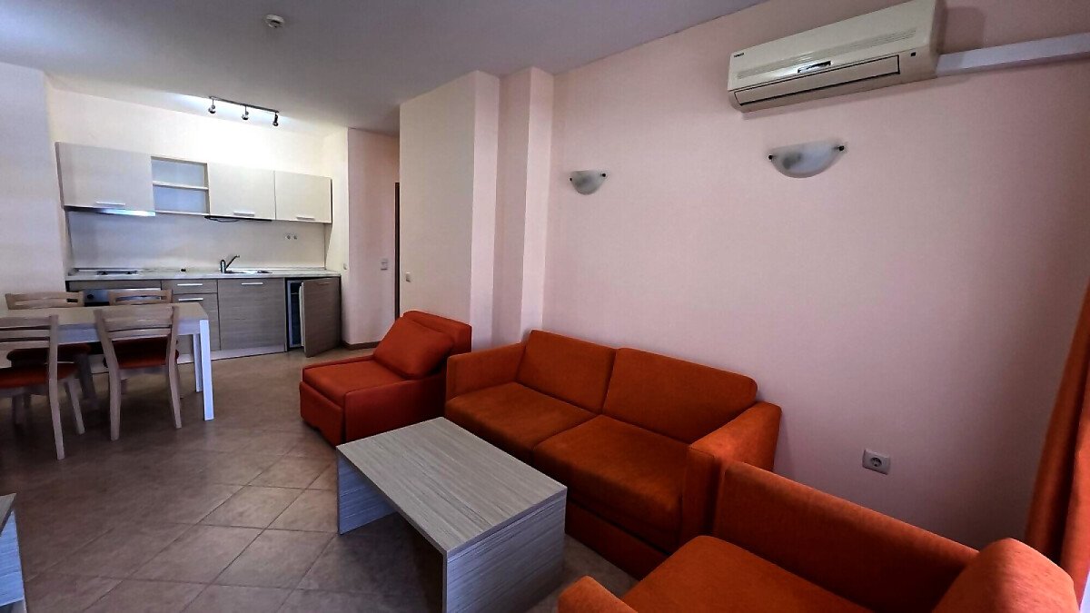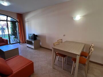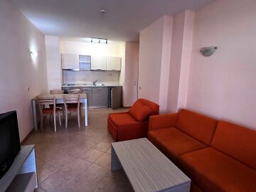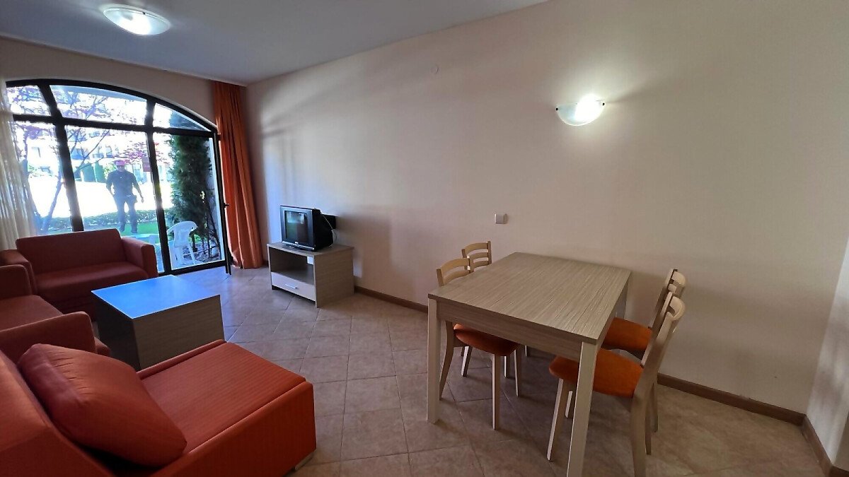 Апартаментът е разположен на партерен етаж, напълно оборудван и обзаведен, със следното разпределение – входно антре, уютна всекидневна с обособен кът за хранене и кухненски бокс, баня с тоалетна и душ кабина, спалня, самостоятелна веранда с изход към басейна и озеленената част на комплекса.