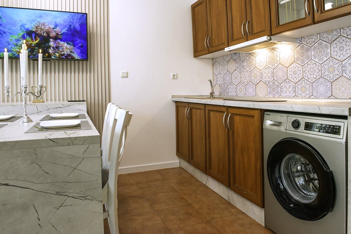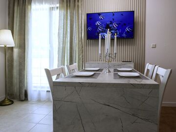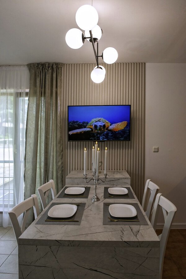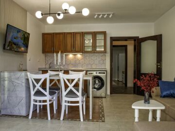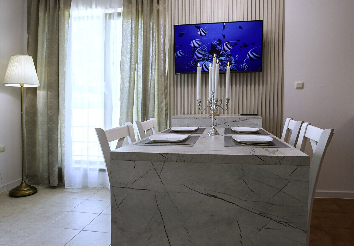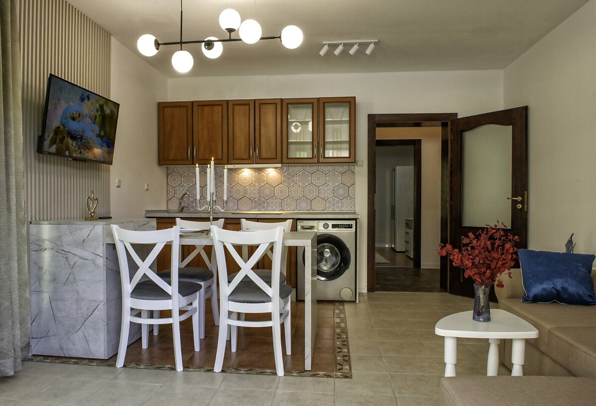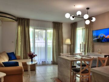 Жилището е на партерен етаж и се продава напълно обзаведено и оборудвано, със следното разпределение – входно антре, уютна всекидневна с кът за хранене и кухненски бокс, слънчева спалня, баня с тоалетна и душ кабина, балкон с чудесен изглед към озеленения двор на комплекса.