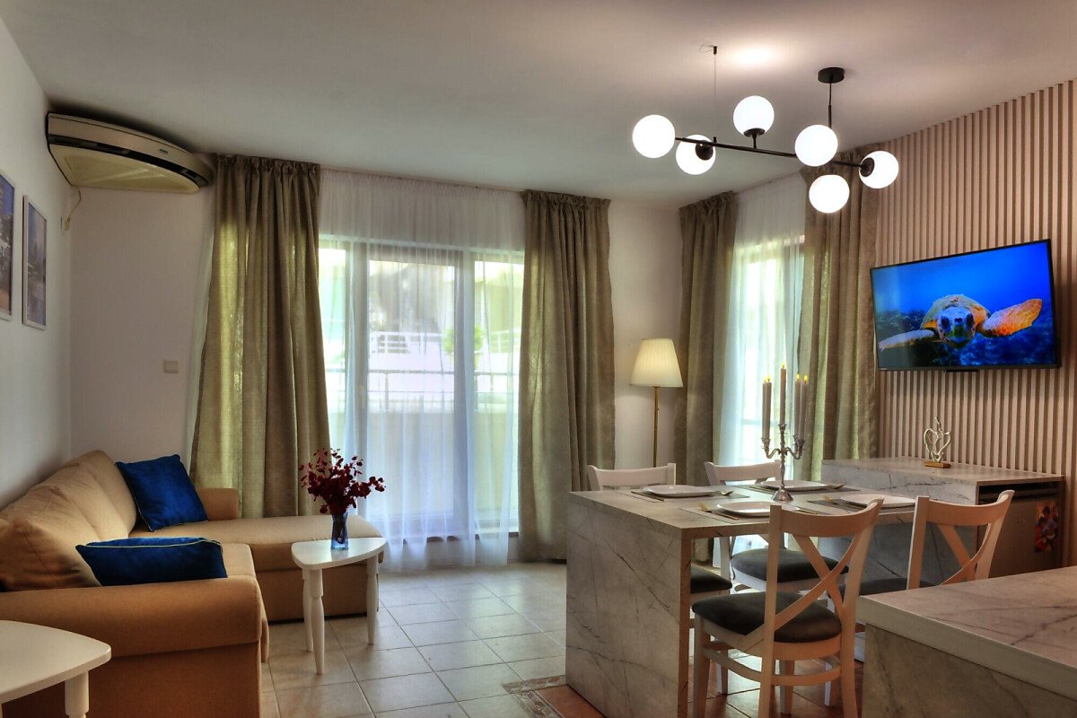 Комплексът се намира на втора линия от морето, а плажът е чист и добре поддържан.