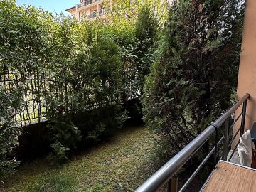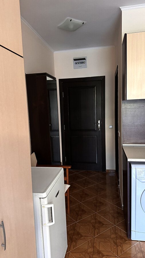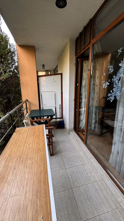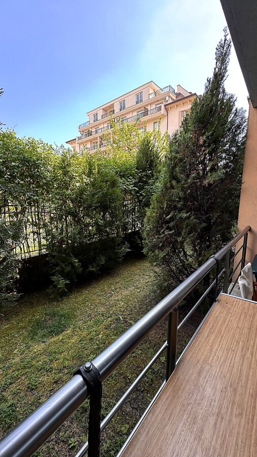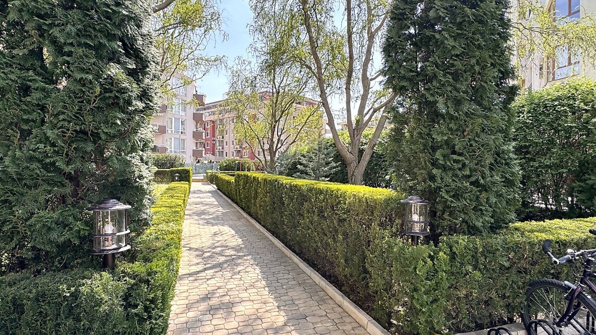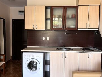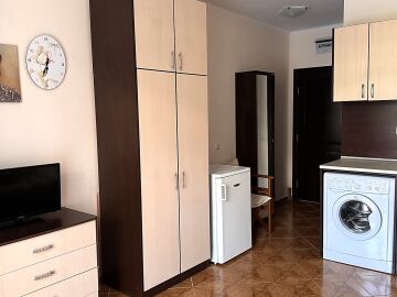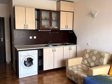 Студиото е на първи етаж и се продава с необходимото обзавеждане и оборудване, със следното разпределение – входно антре, всекидневна с обособен кухненски бокс, баня с тоалетна и душ кабина, балкон с красива гледка към озеленения двор на комплекса.