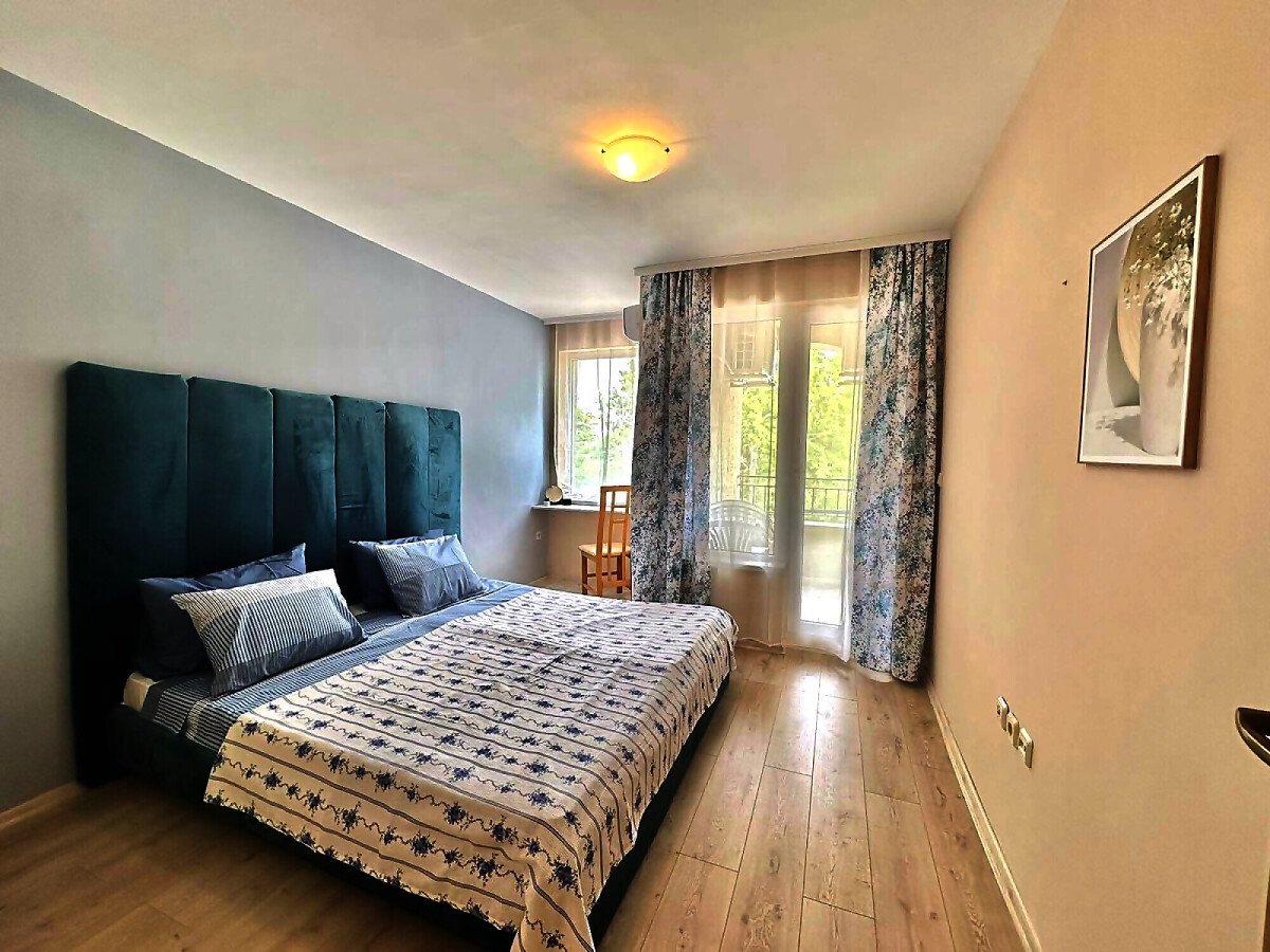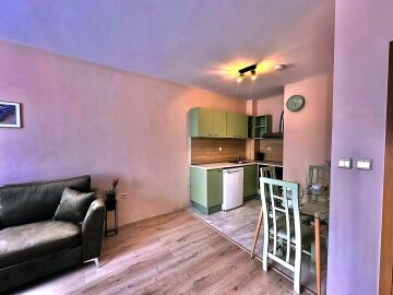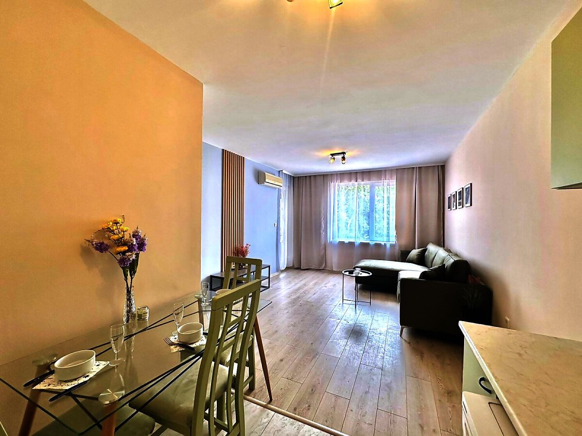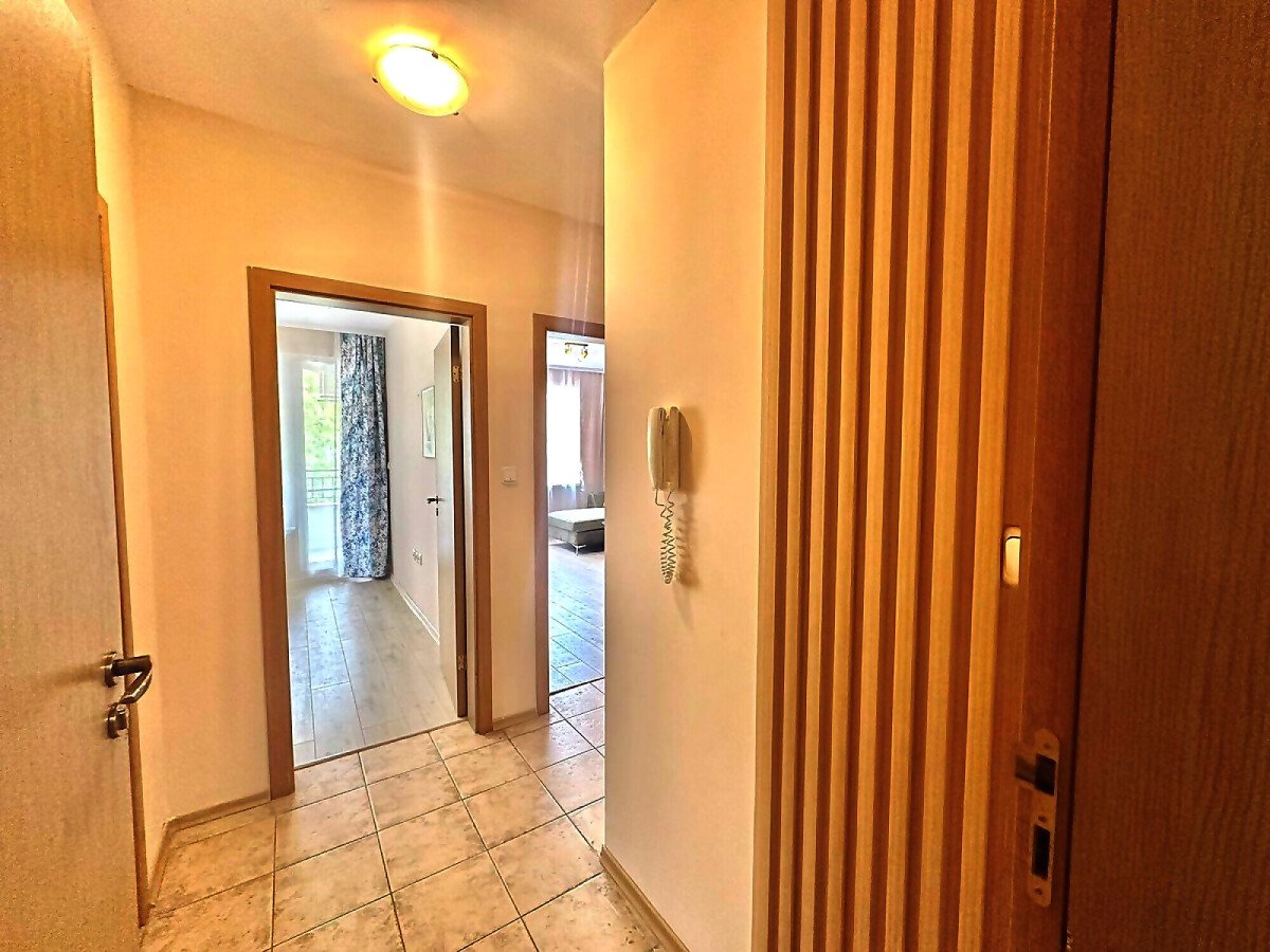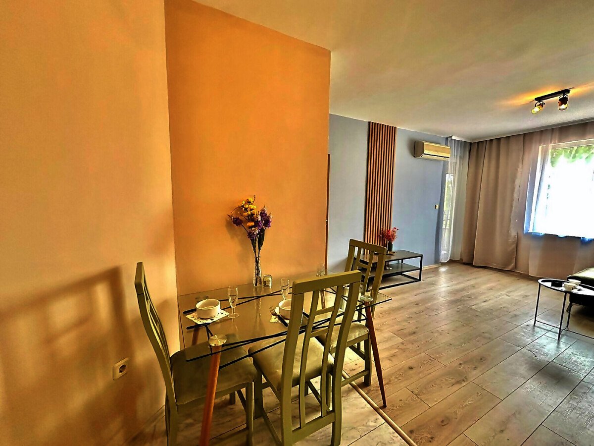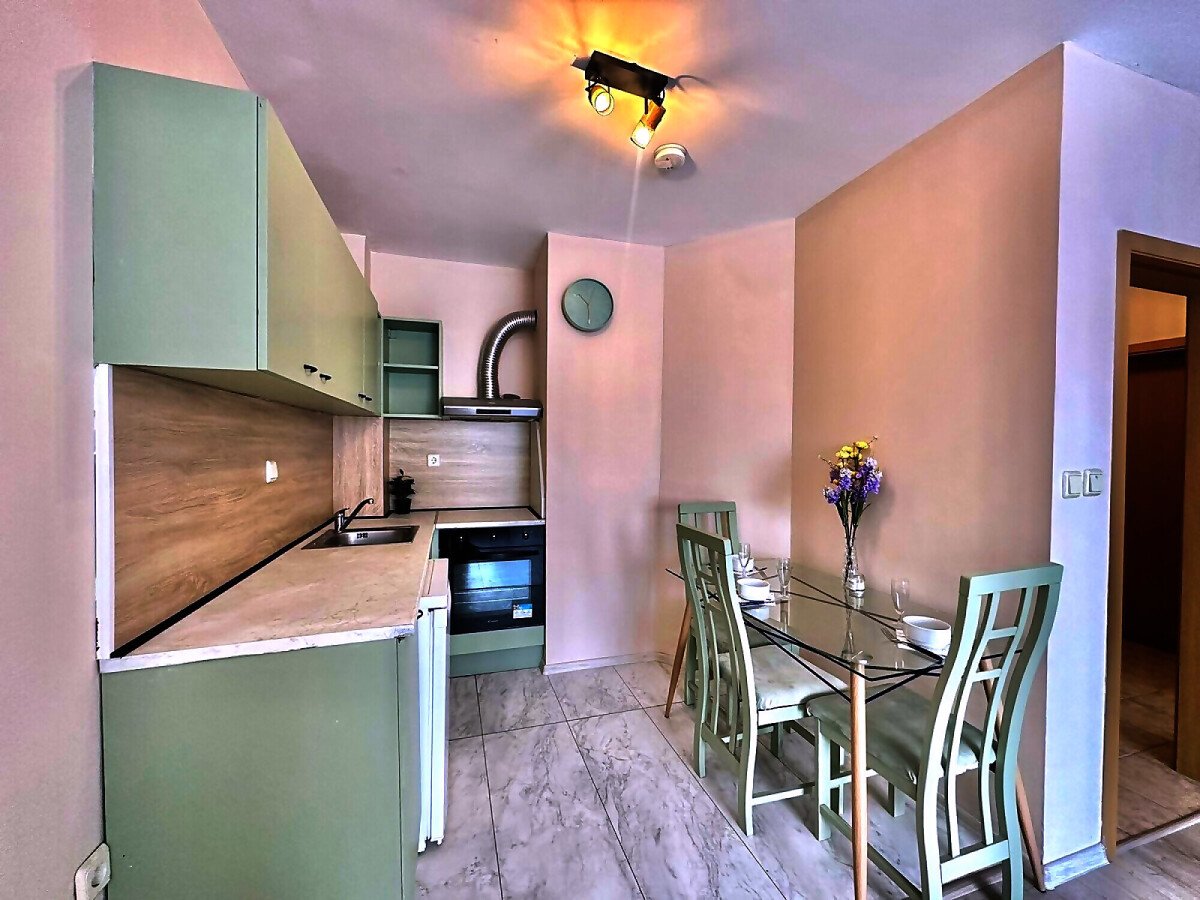 Апартаментът е след ремонт, с нови мебели и качествена домакинска електротехника, със следното разпределение – входно антре, просторна и светла всекидневна с кухненски бокс и кът за хранене, спалня, баня с тоалетна, килер, балкон с красива гледка към басейна и закритата територия на комплекса.