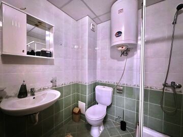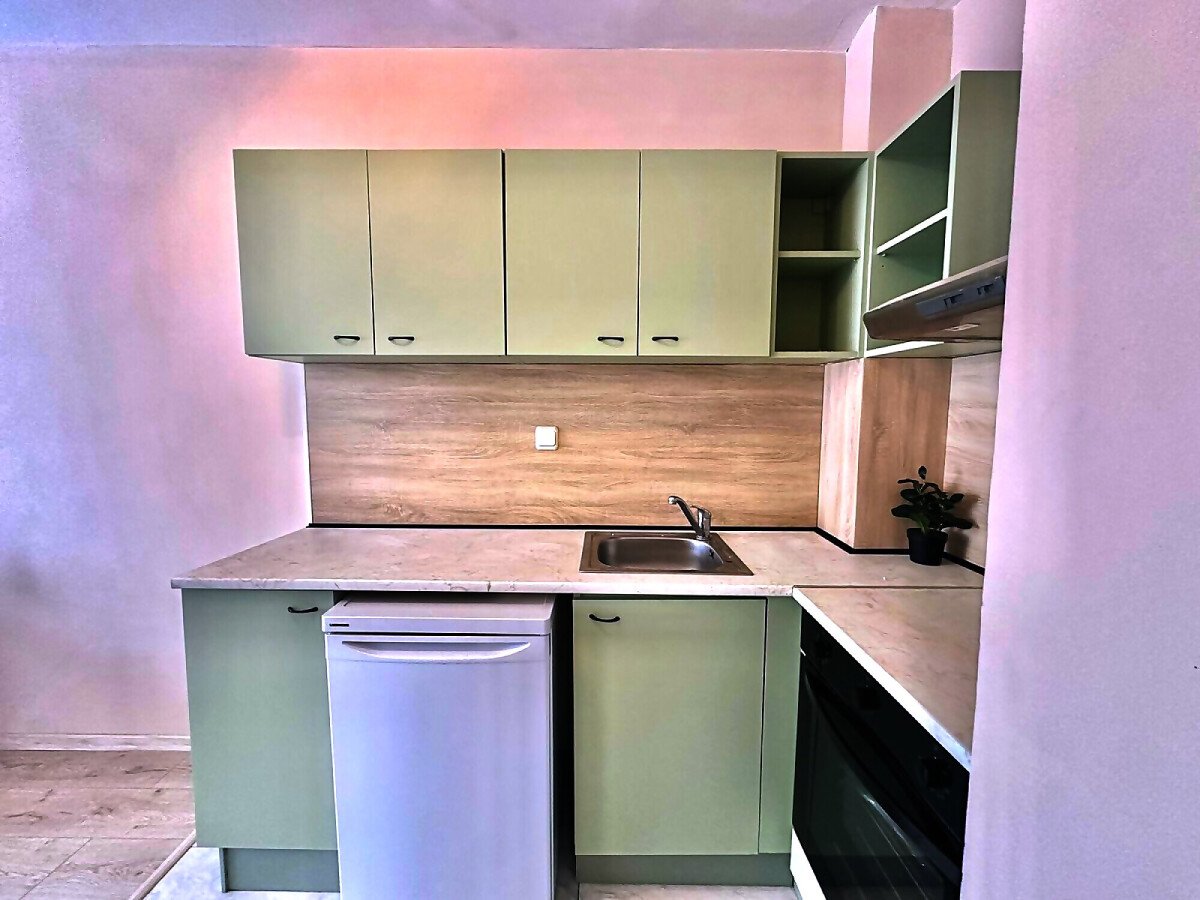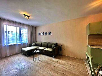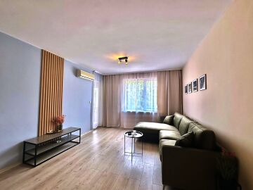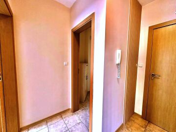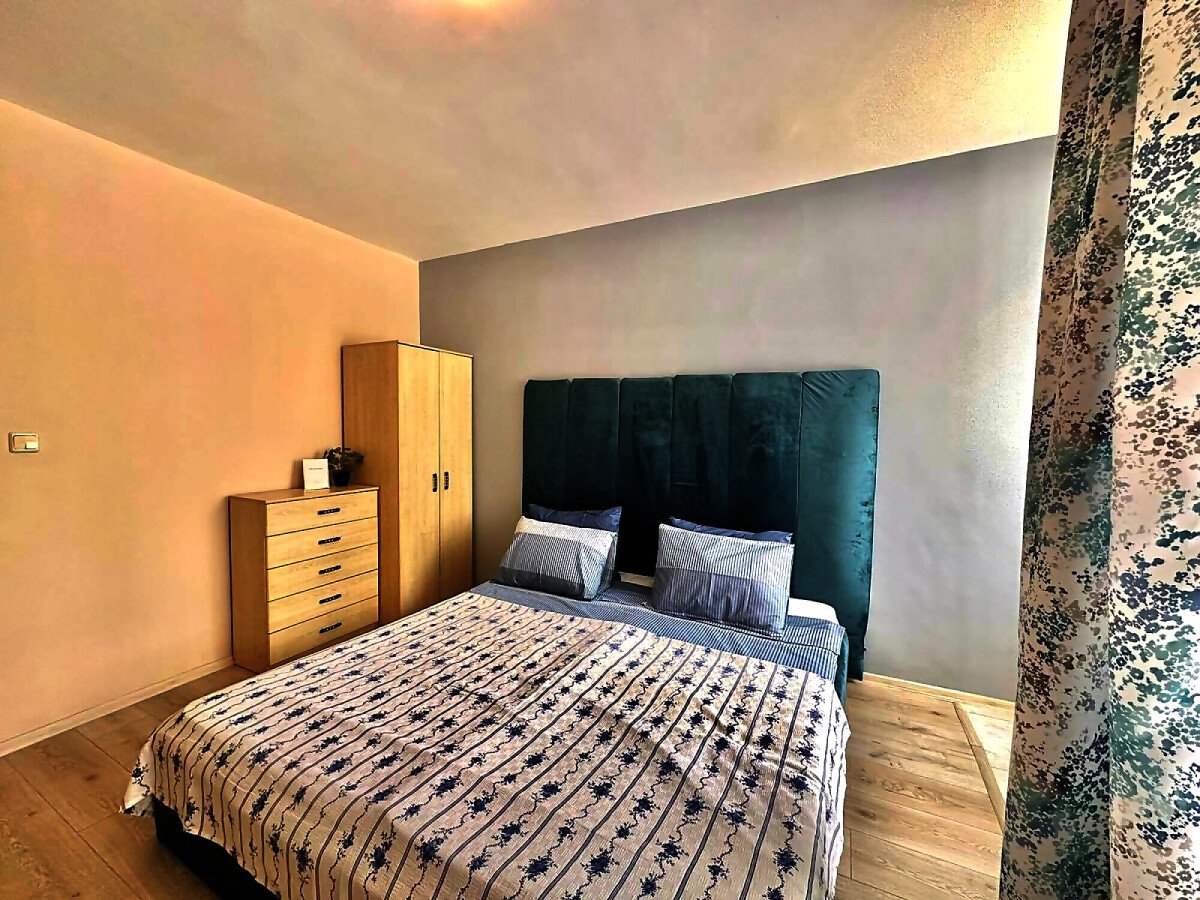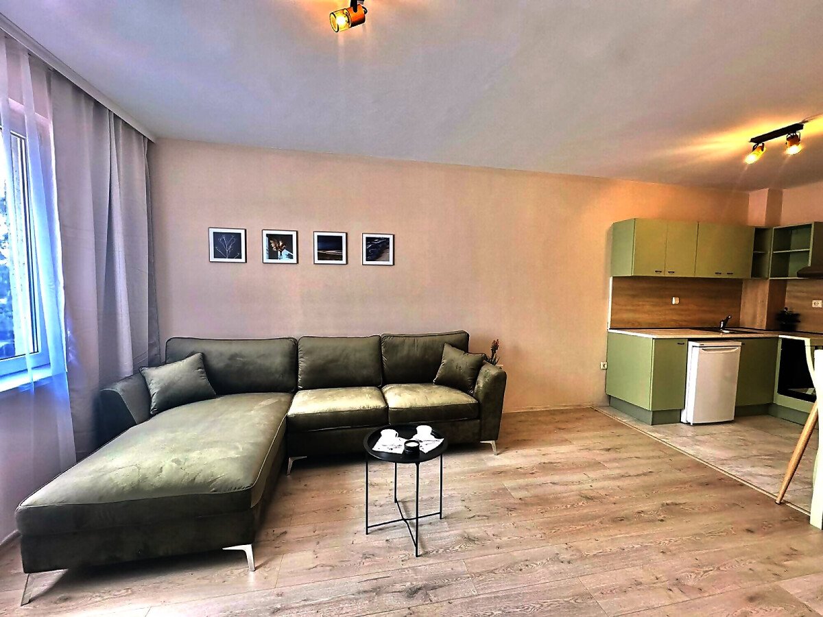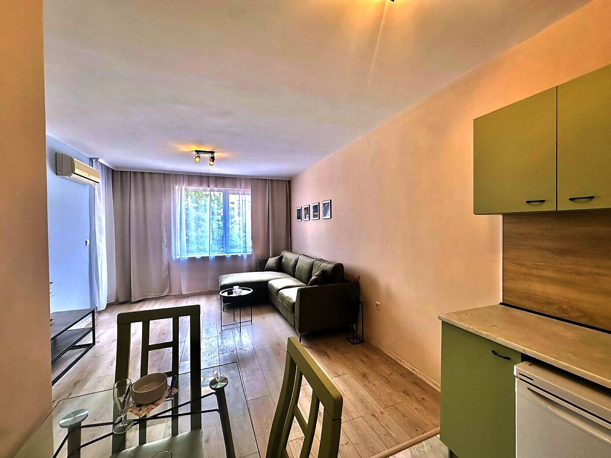 Апартаментът е след ремонт, с нови мебели и качествена домакинска електротехника, със следното разпределение – входно антре, просторна и светла всекидневна с кухненски бокс и кът за хранене, спалня, баня с тоалетна, килер, балкон с красива гледка към басейна и закритата територия на комплекса.
