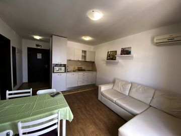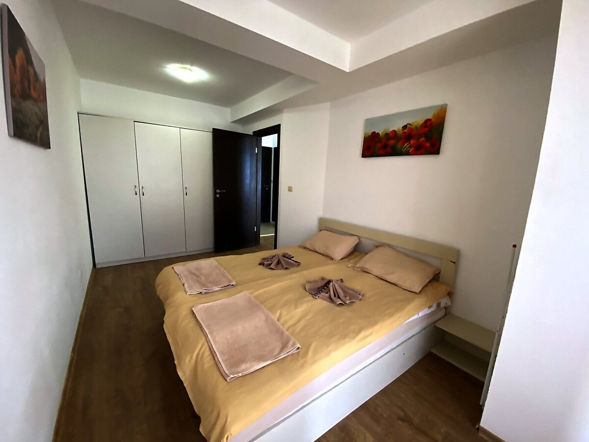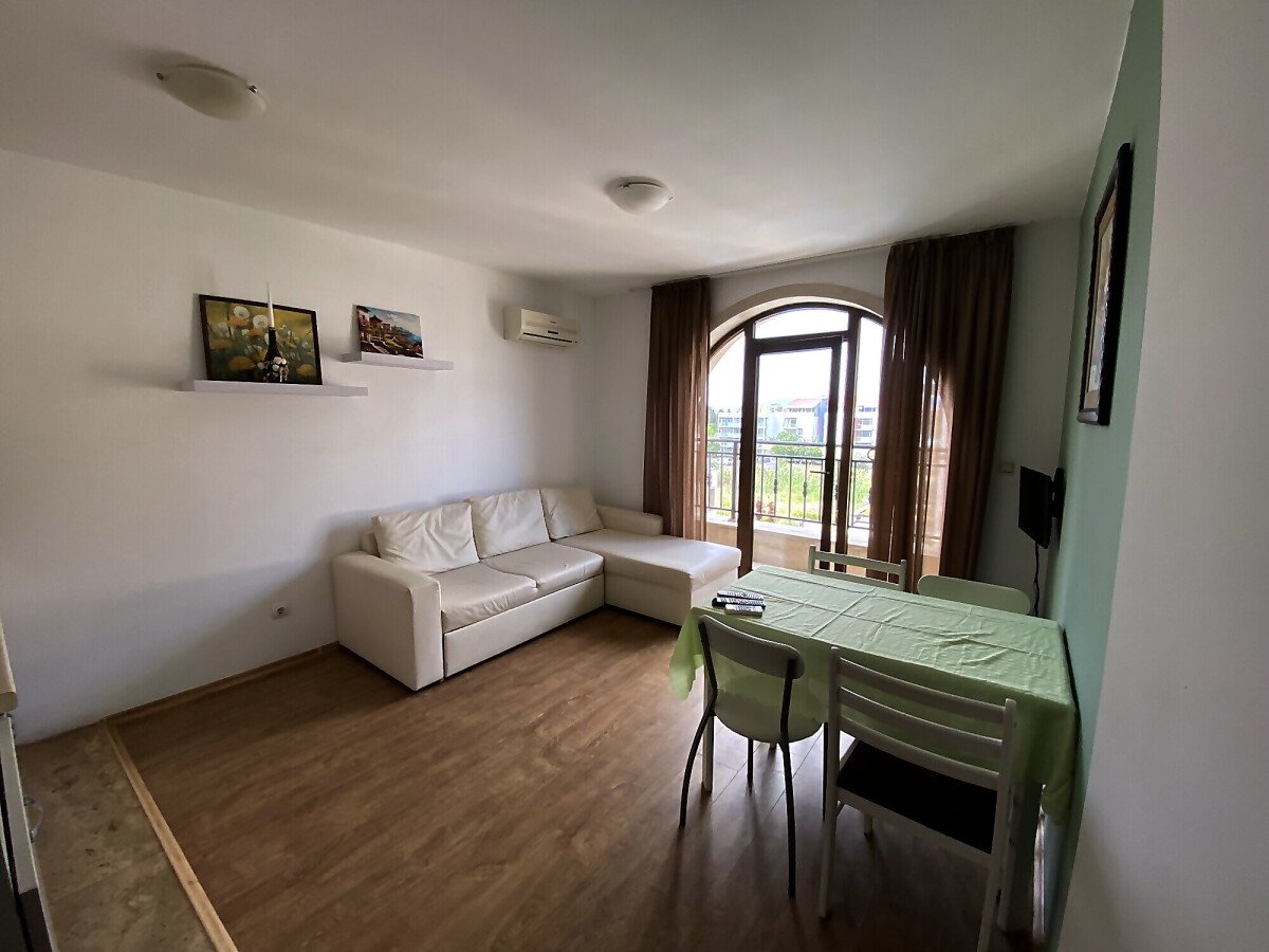 Апартаментът се продава в отлично състояние, напълно обзаведен и оборудван, със следното разпределение – входно антре, светла и уютна всекидневна с трапезария и кухненски бокс, спалня, баня с тоалетна, балкон с гледка към басейна и затворената територия на комплекса.
