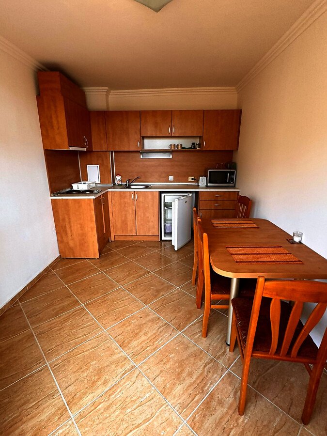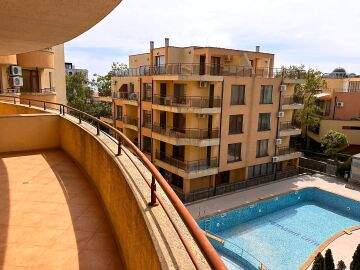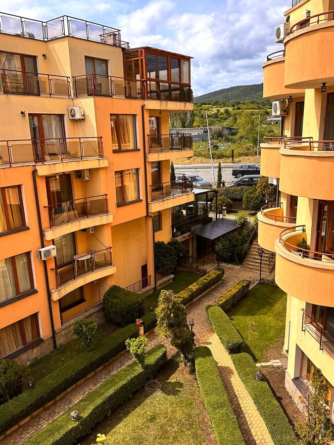Апартаментът се продава в добро състояние, обзаведен и оборудван, готов за нанасяне, със следното разпределение – входно антре, просторна всекидневна с трапезария и кухненски бокс, спалня, баня с тоалетна, голям балкон с красива гледка към басейна и закритата част на комплекса, както и частична гледка към морето.