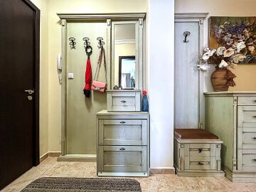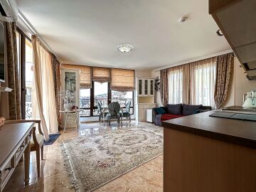 Обзаведен е с внимание към детайла, а разположението е следното: антре, всекидневна с кухненски бокс и кът за хранене, две спални, две бани, няколко тераси - едната от които е с прекрасна морска панорама.