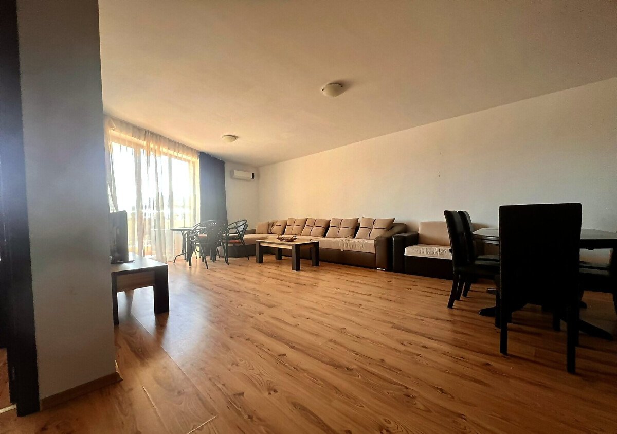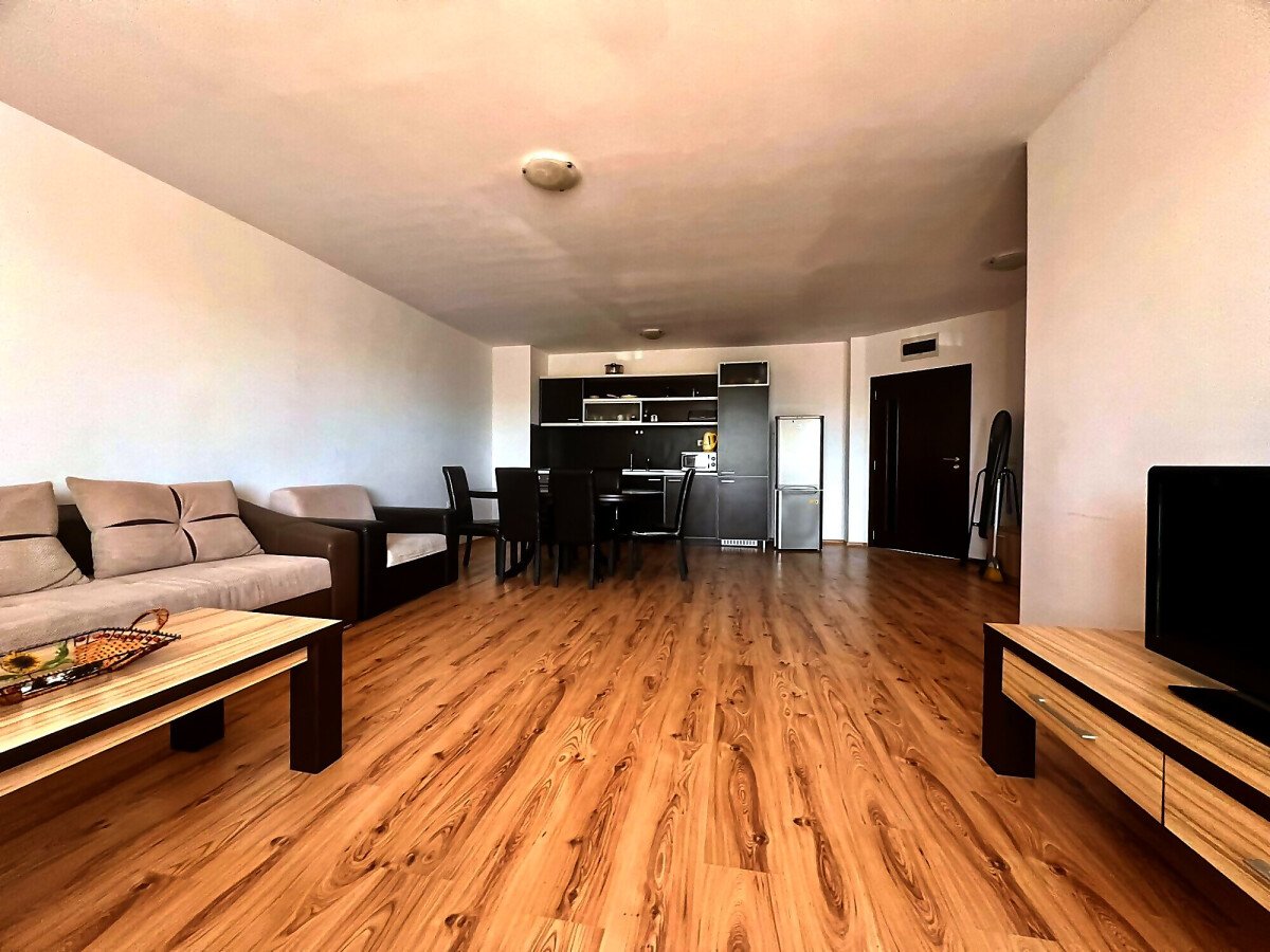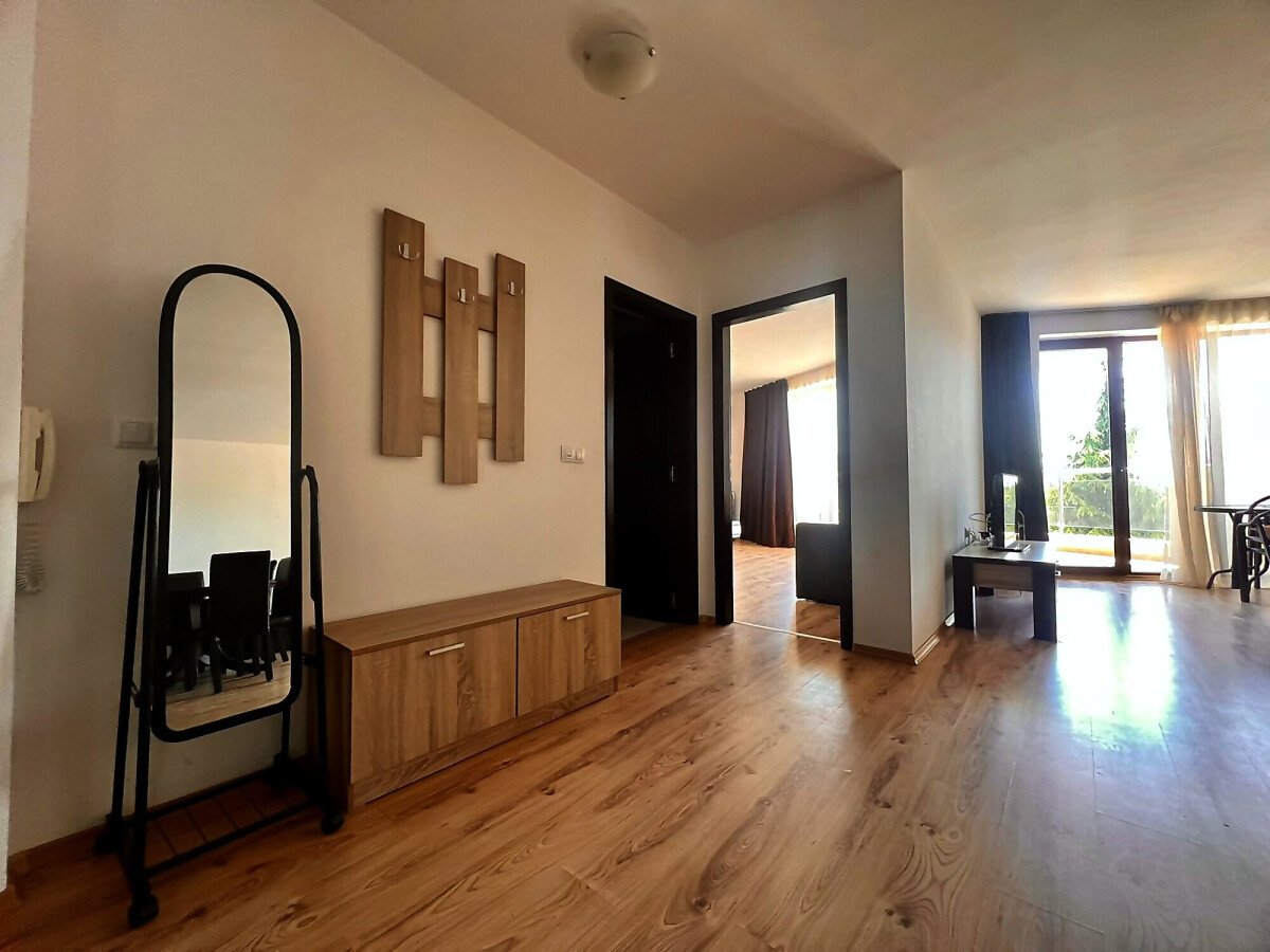 Апартаментът е на партерен етаж, много функционален, със следното разпределение – входно антре, просторна и светла всекидневна с голям диван, трапезария и кухненски кът, уютна спалня, баня с тоалетна и душ кабина, балкон с прекрасна гледка към басейна, озеленената територия и малка гледка към морето.