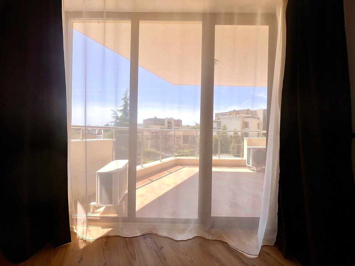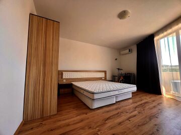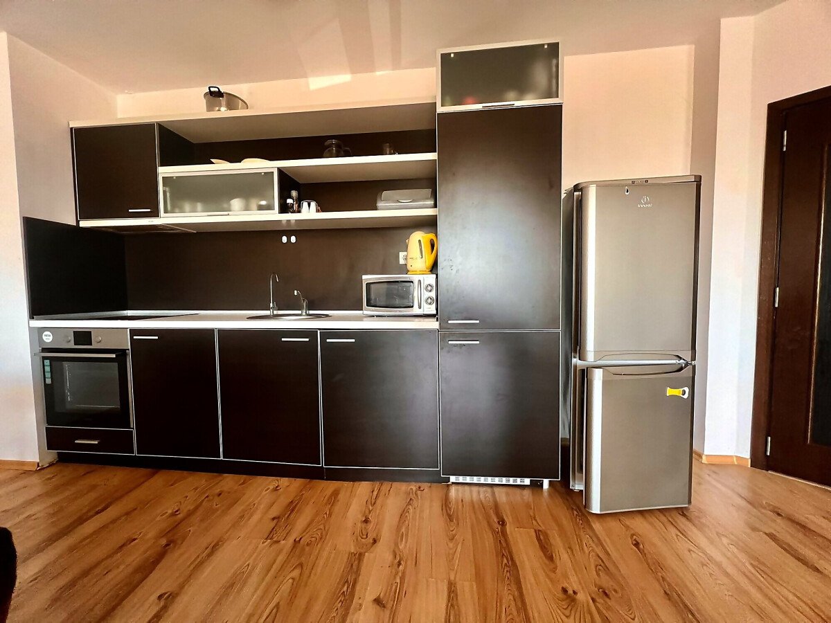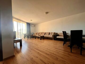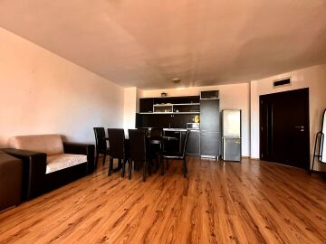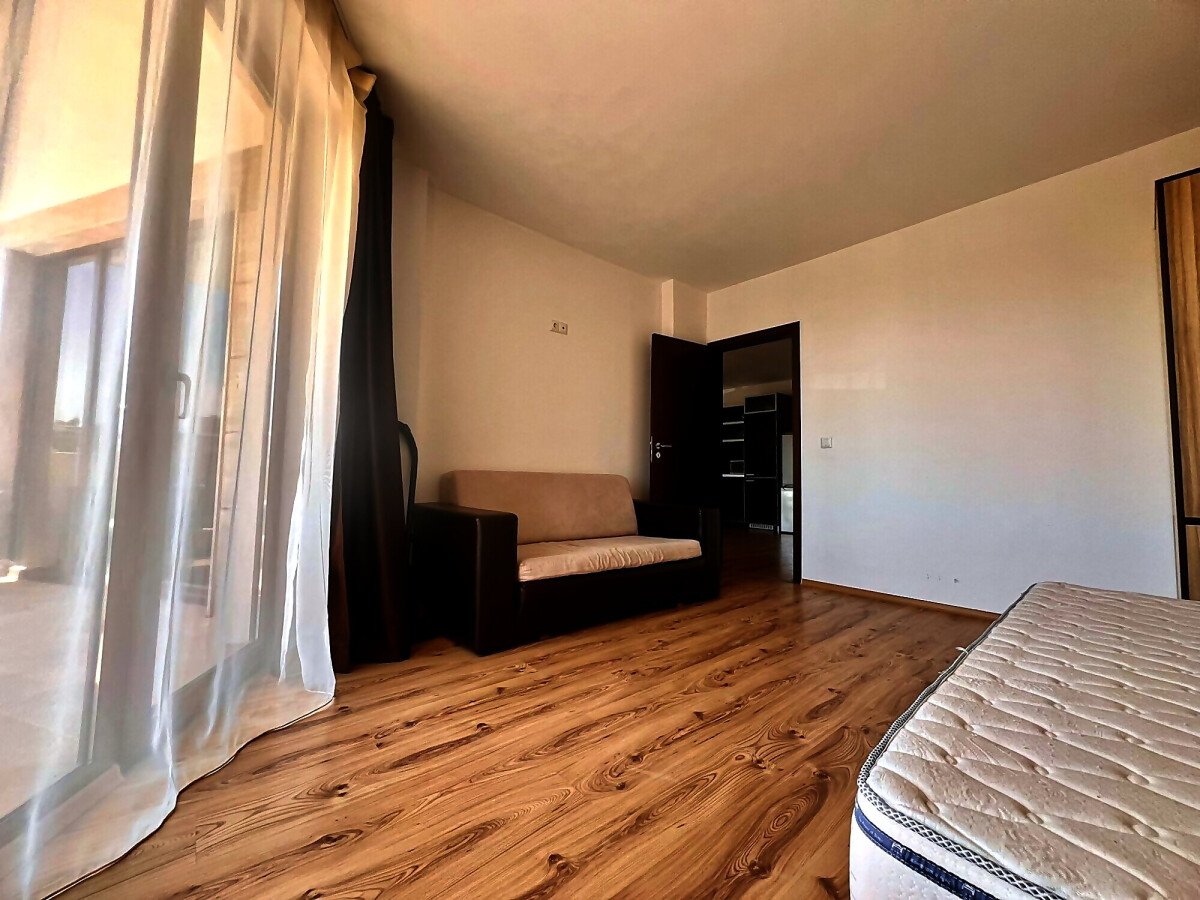 Апартаментът е на партерен етаж, много функционален, със следното разпределение – входно антре, просторна и светла всекидневна с голям диван, трапезария и кухненски кът, уютна спалня, баня с тоалетна и душ кабина, балкон с прекрасна гледка към басейна, озеленената територия и малка гледка към морето.