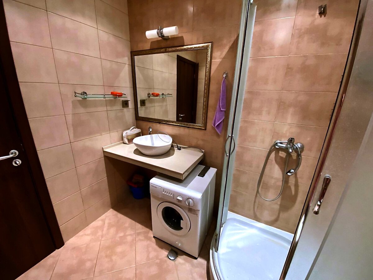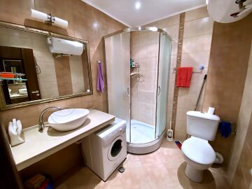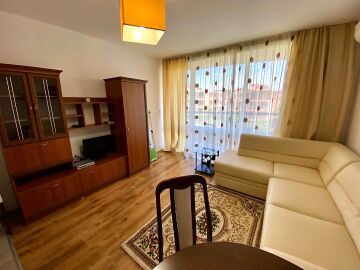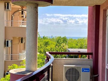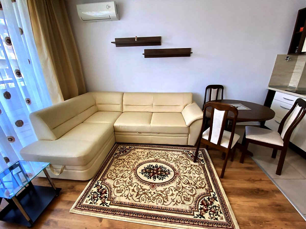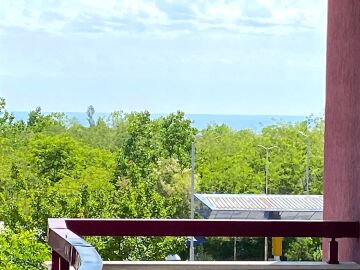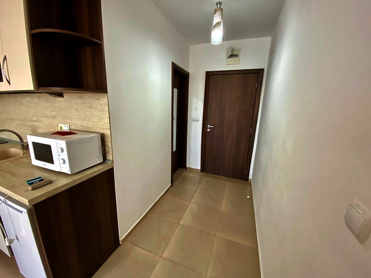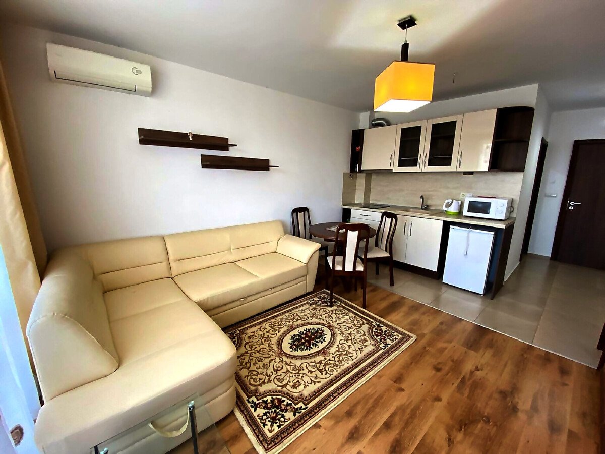 Студиото се продава напълно обзаведено и оборудвано с всичко необходимо. Разполага с входно антре, обособен кухненски бокс, кът за хранене, голям разтегателен диван, холна секция, баня с тоалетна и душкабина, балкон с красива гледка към озеленените площи и морето.