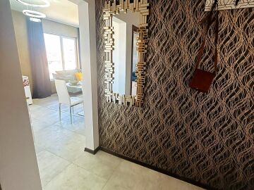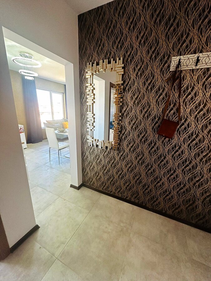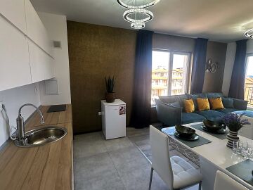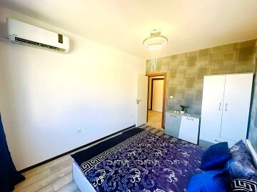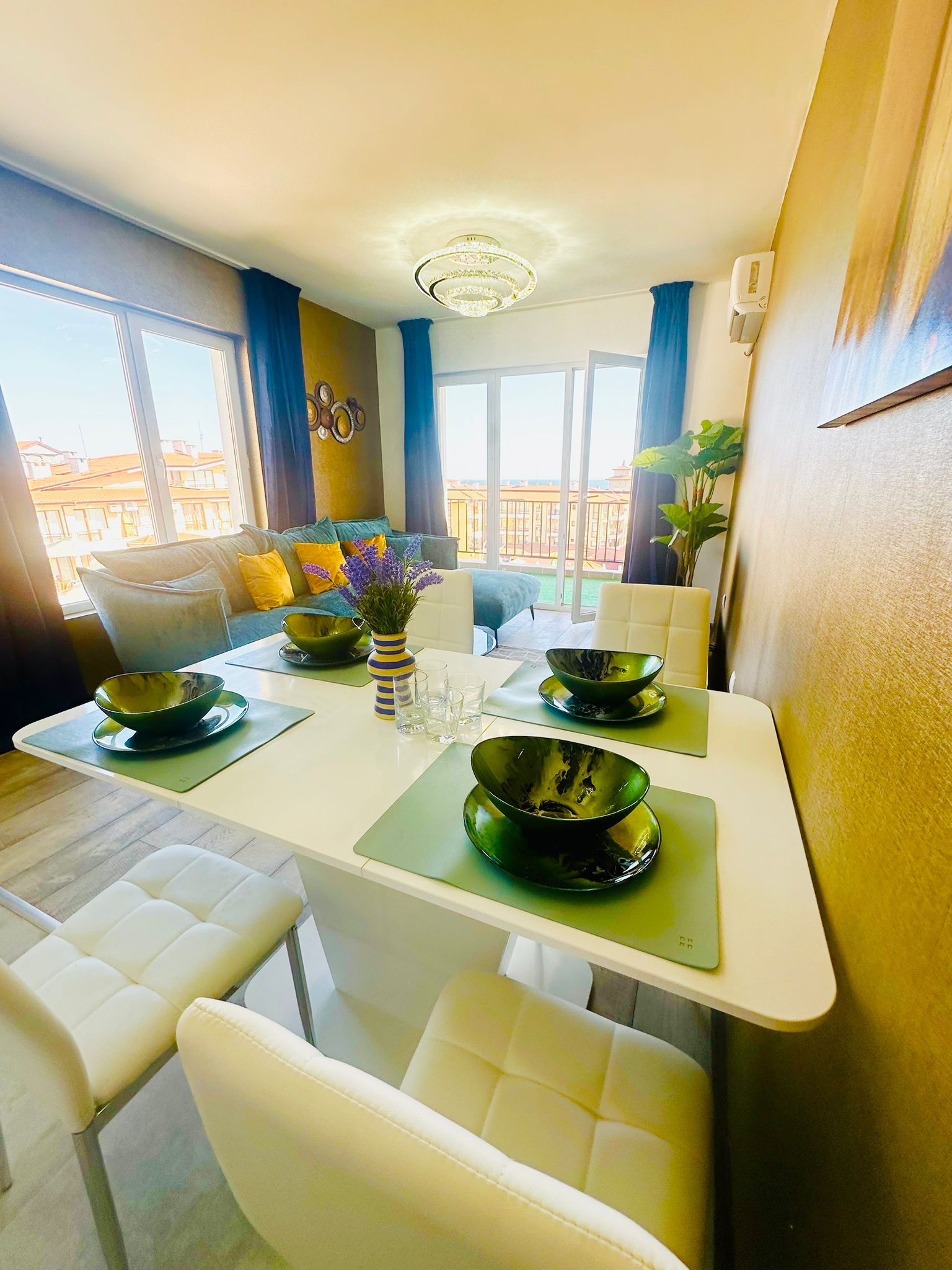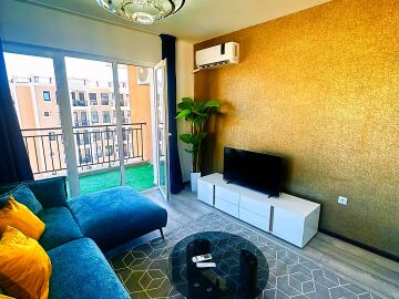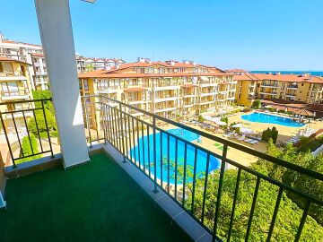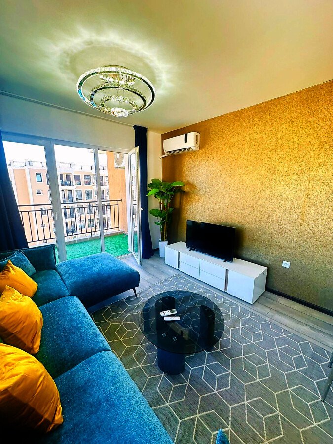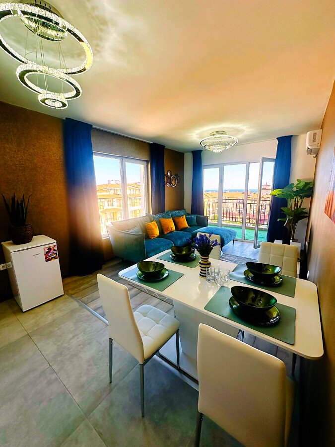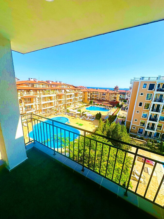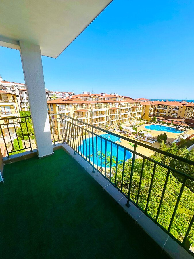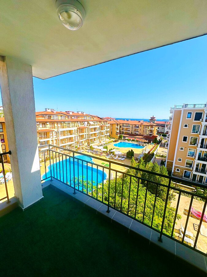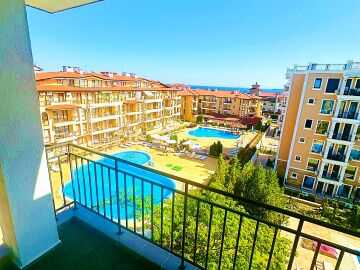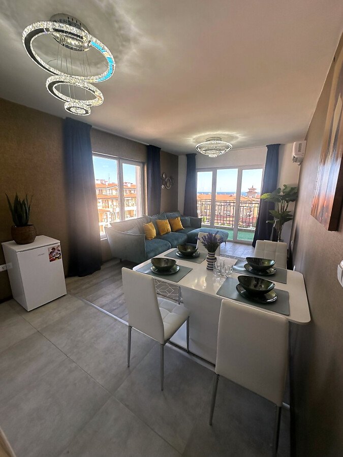 Апартаментът се продава в отлично състояние, с качествено оборудване и стилно обзавеждане, със следното разпределение – входно антре, просторна и уютна всекидневна с кът за хранене и кухненски бокс, баня с тоалетна и душ кабина, светла спалня, балкон с прекрасна гледка към морето и към басейна.
