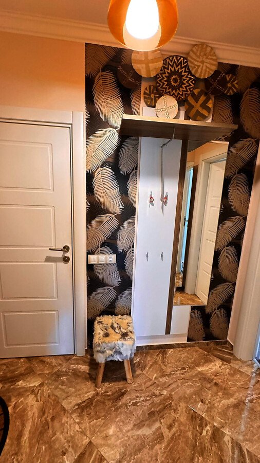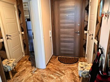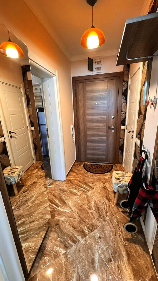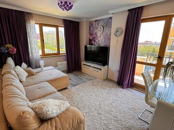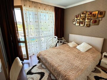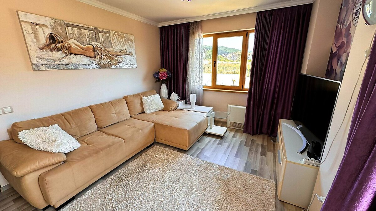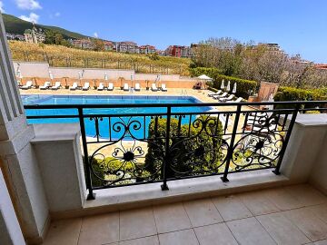 Апартаментът е разположен на втори етаж и се продава със стилно обзавеждане и качествено оборудване, както е на снимки. Имотът е слънчев и функционален, със следното разпределение – входно антре, просторна всекидневна с кът за хранене, кухненски кът, две спални, две тераси, баня с тоалетна и душ кабина. От терасите се разкрива чудесна гледка към басейна, планината и частична гледка към морето.