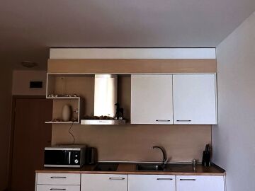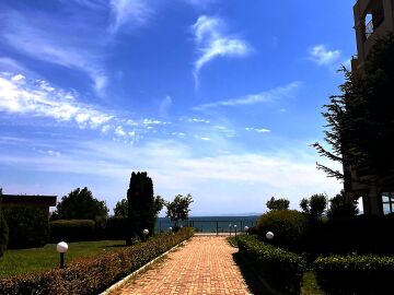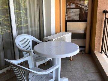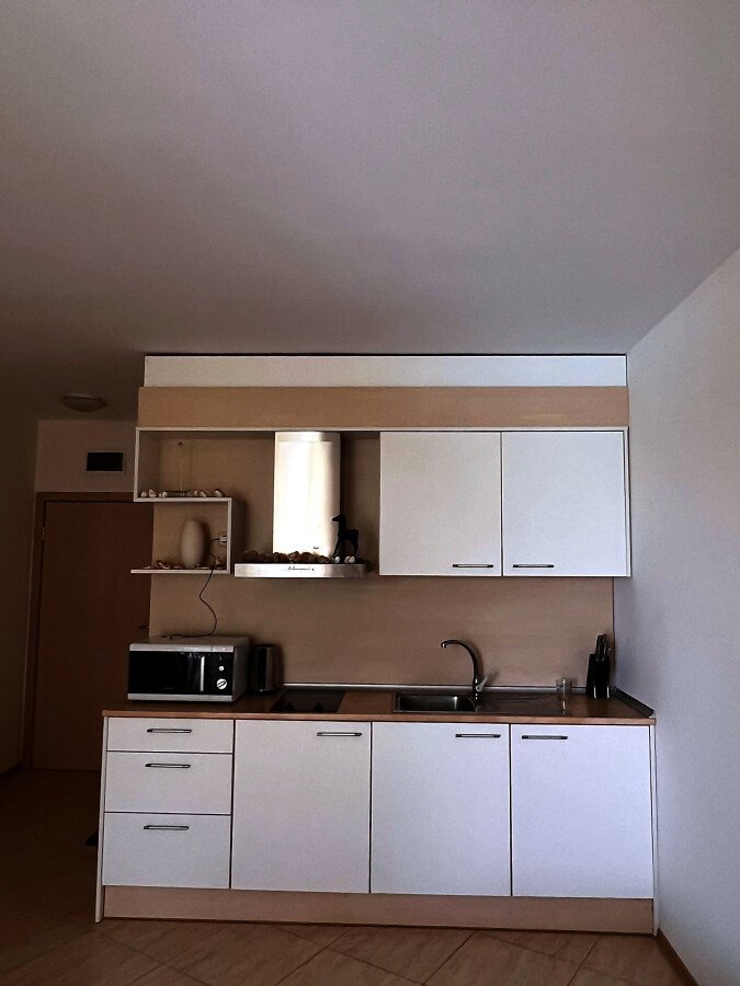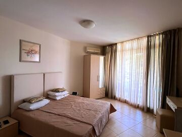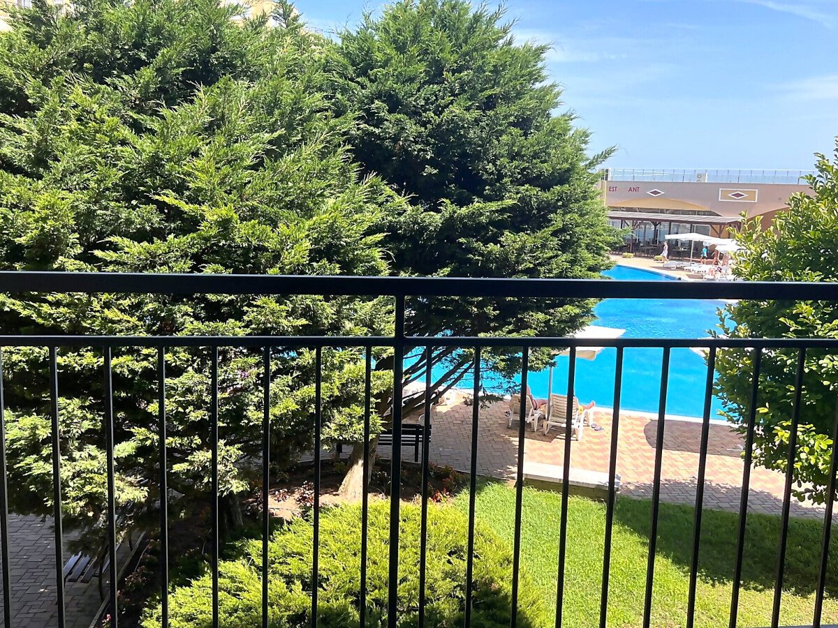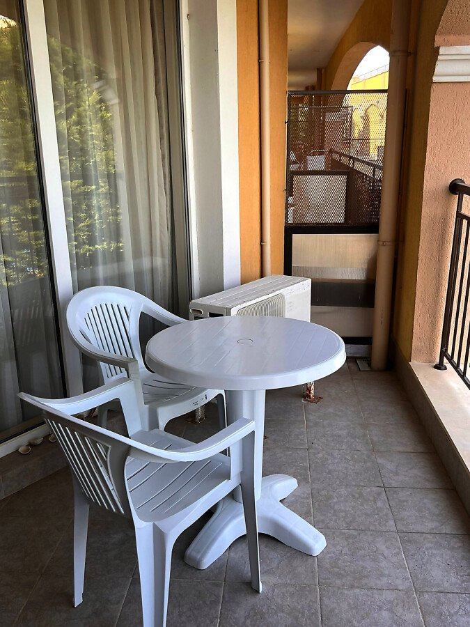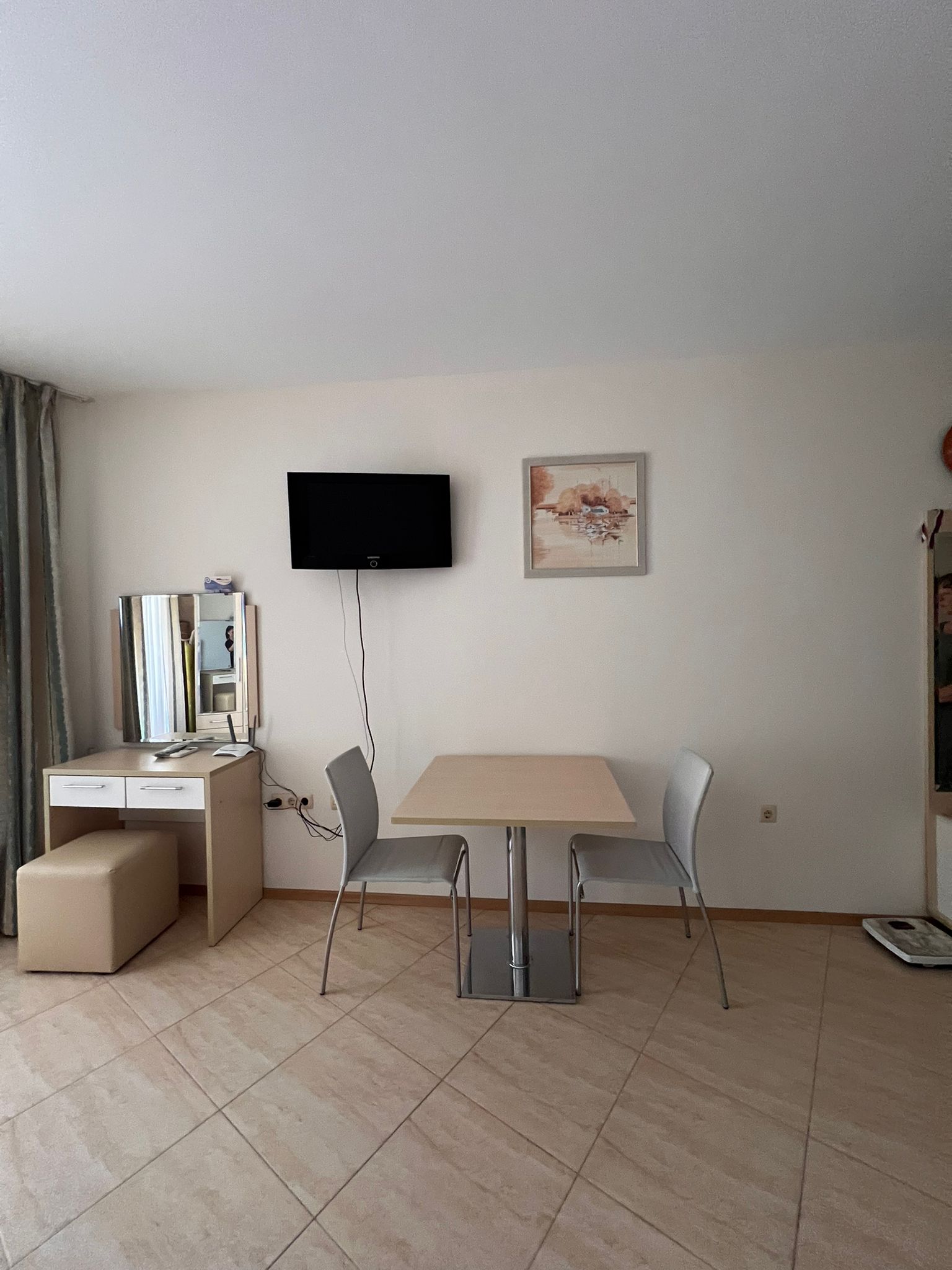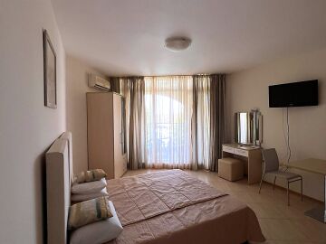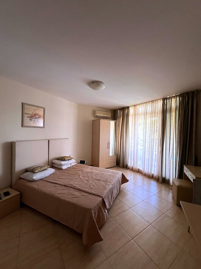 Студиото е разположено на втори жилищен етаж, в най-хубавата част на комплекса, която предлага гледка едновременно към морето, басейна и озеленените площи, което създава усещане за спокоен райски кът. Имотът е обзаведен с всичко необходимо и е напълно готов за живеене - разполага с кухненски бокс с кът за хранене, зона за сън с голямо легло, баня с тоалетна и душ кабина, антре и тераса.