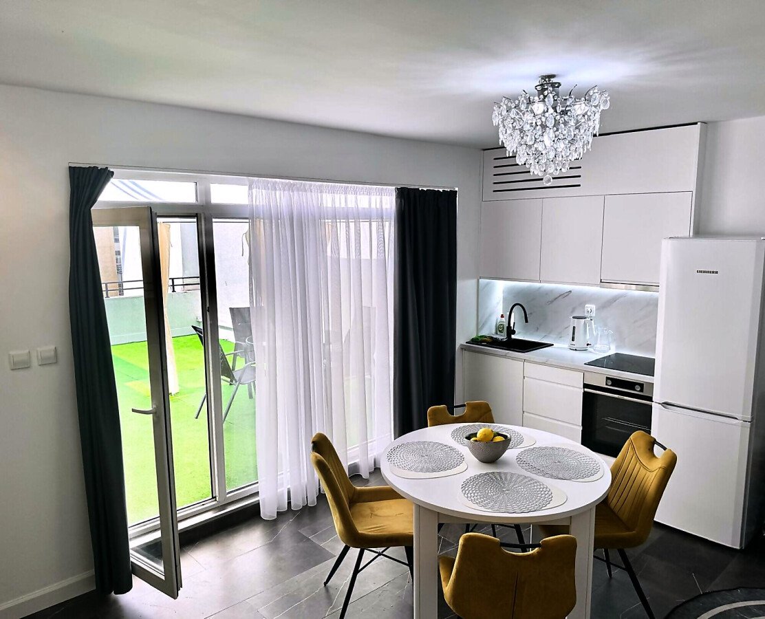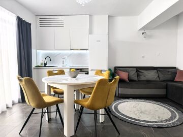 Апартаментът е в отлично състояние, след ремонт, с ново и стилно обзавеждане и качествено оборудване. Жилището има следното разпределение – всекидневна с кухненски бокс, две спални, баня с тоалетна и душ кабина, красиво озеленена тераса с гледка към вътрешната част на комплекса, както и още една тераса с изход от двете спални и чудесна гледка към планината. Подходящо е както за летен отдих и почивка, така и за целогодишно живеене.