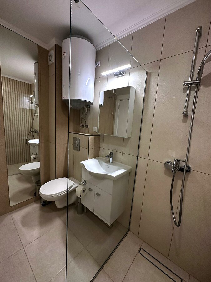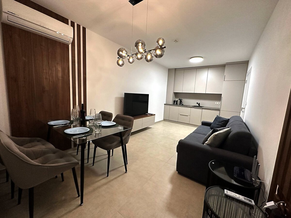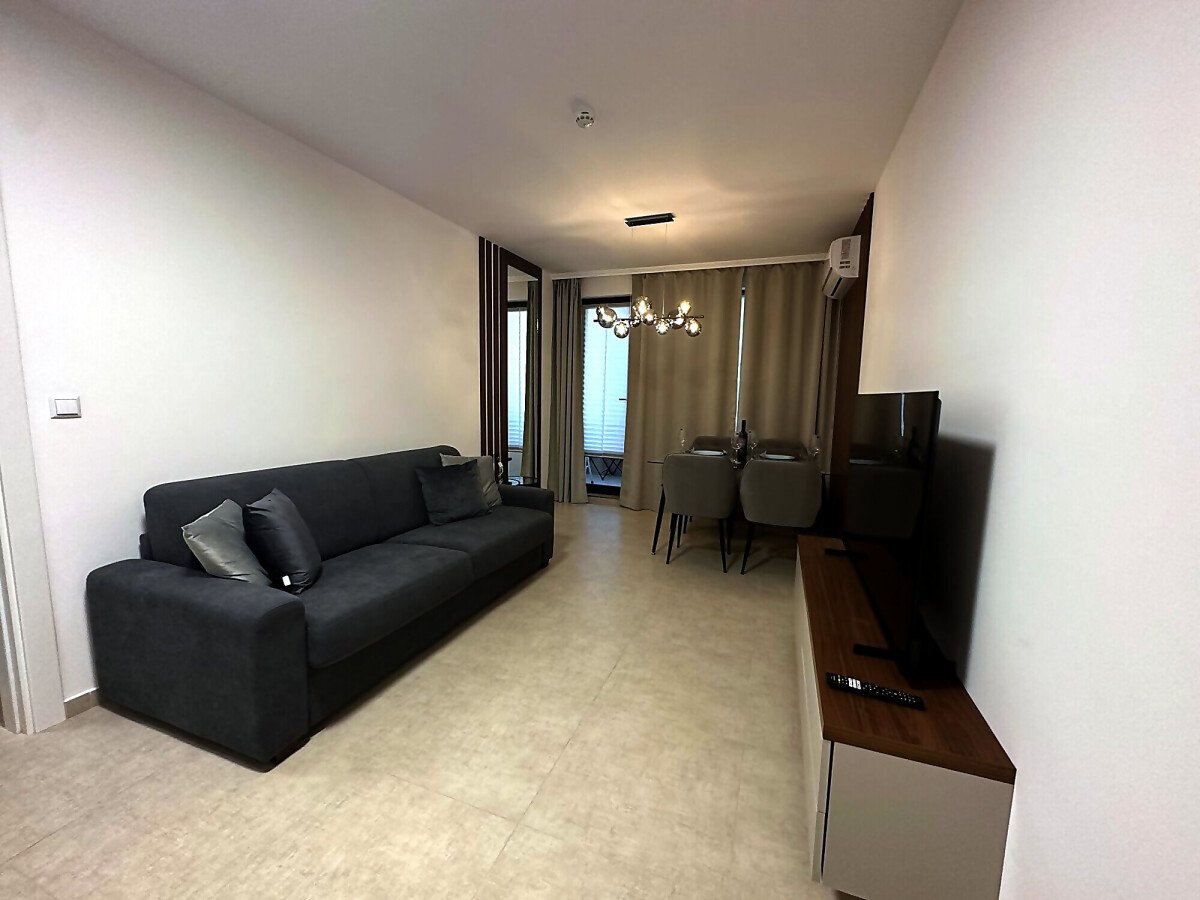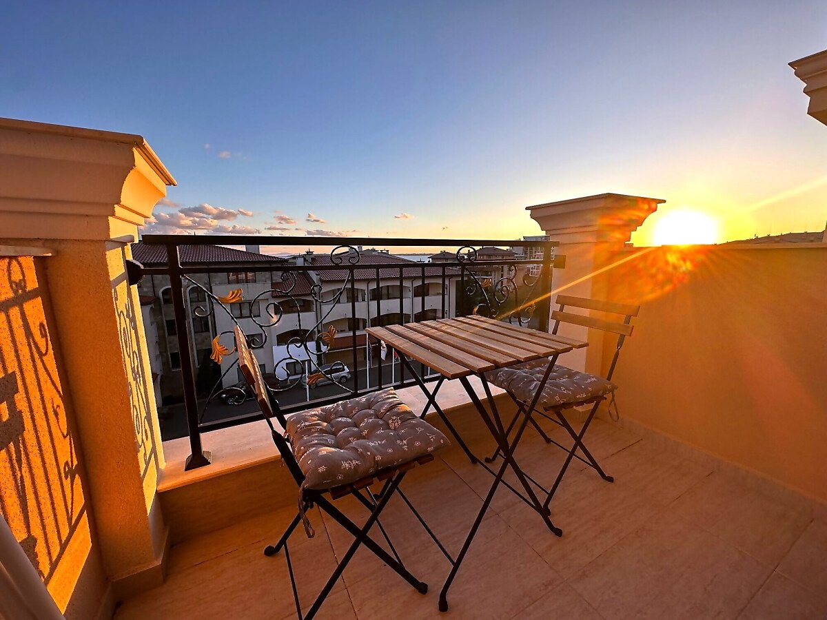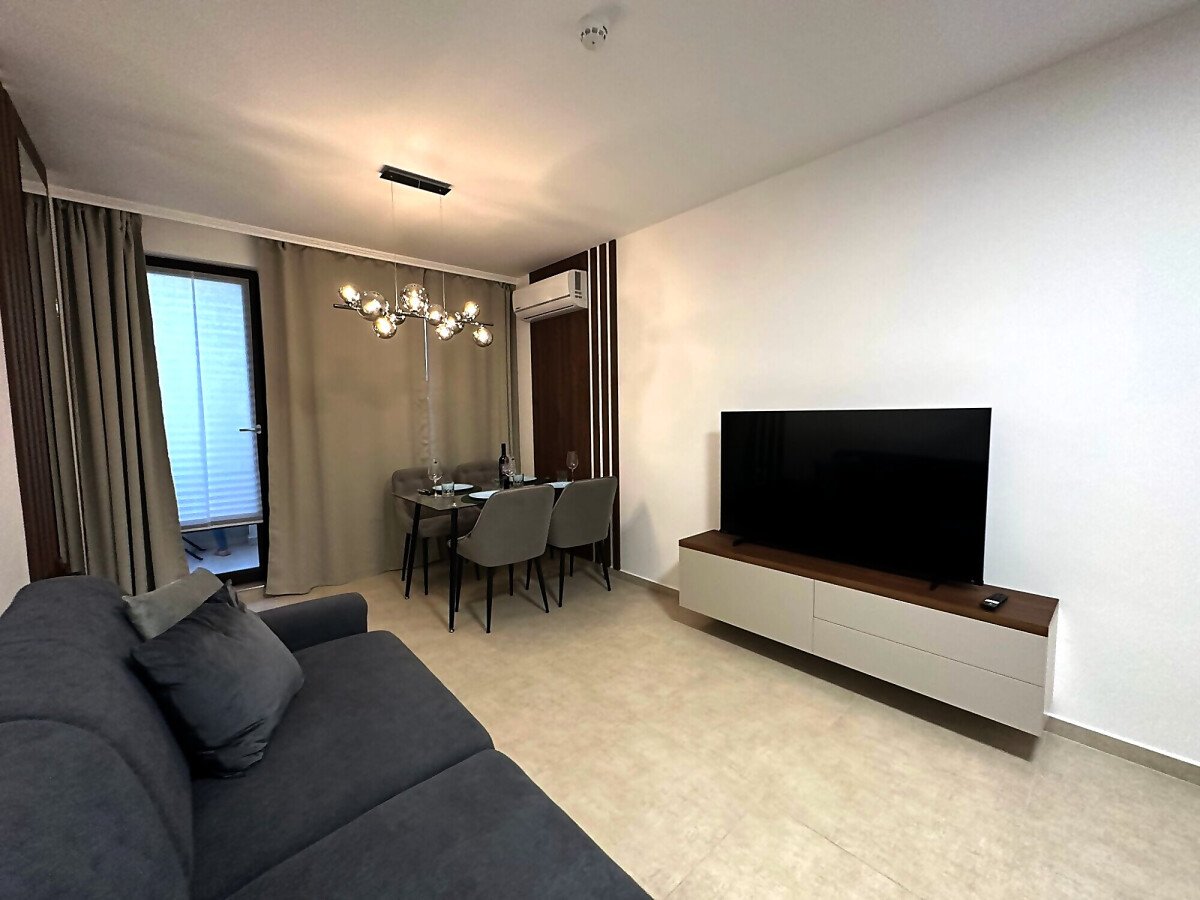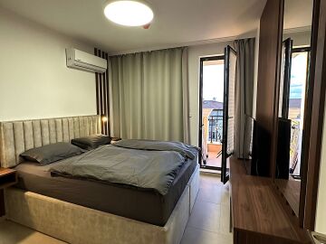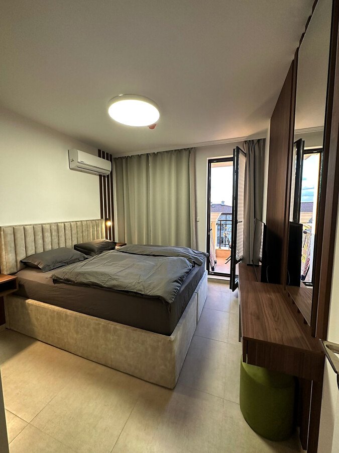 Апартаментът е разположен на пети етаж и се продава в отлично състояние, с ново и стилно обзавеждане, качествено оборудване и се състои от входно антре, уютна всекидневна със зона за хранене и кухненски бокс, спалня, баня с тоалетна и душ кабина, слънчев балкон с красива гледка към морето.