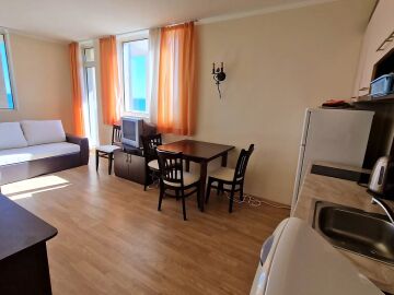 Апартаментът е разположен на трети етаж, с югоизточно изложение, с площ 67,28 кв.м. и следното разпределение – входно антре, всекидневна с кухненски бокс и зона за хранене, просторна спалня, баня с тоалетна и вана, голяма панорамна тераса с красива гледка към морето и плажната ивица.