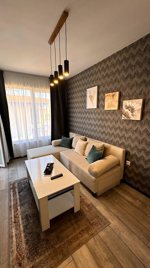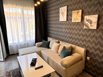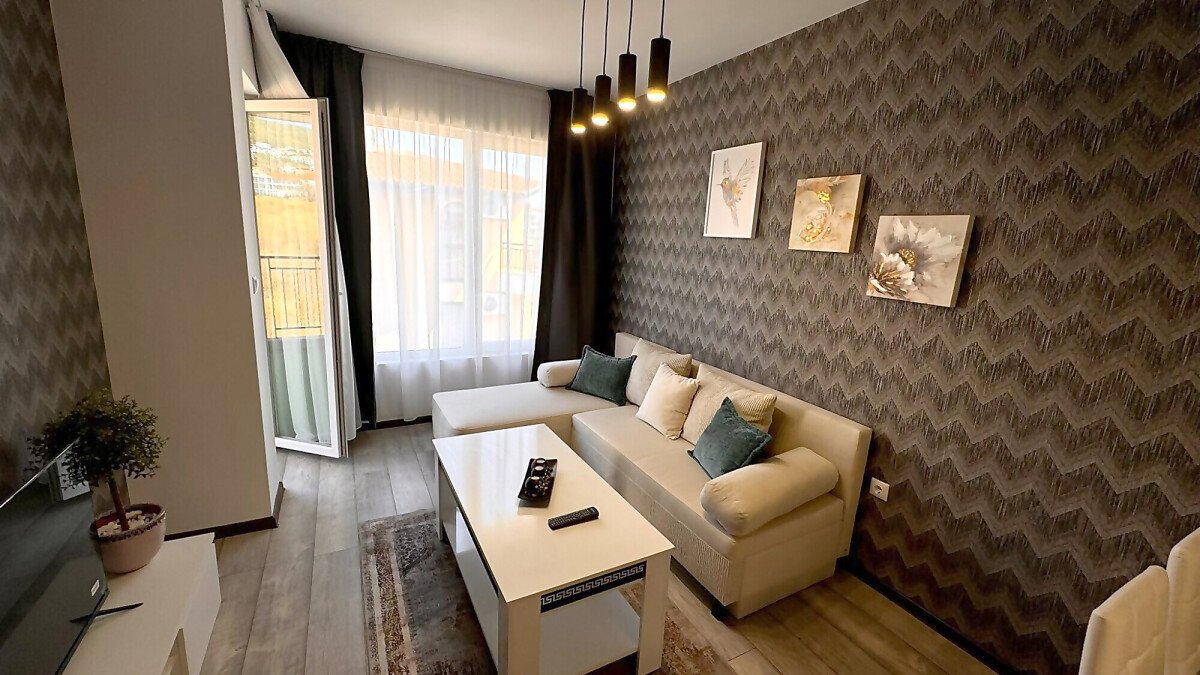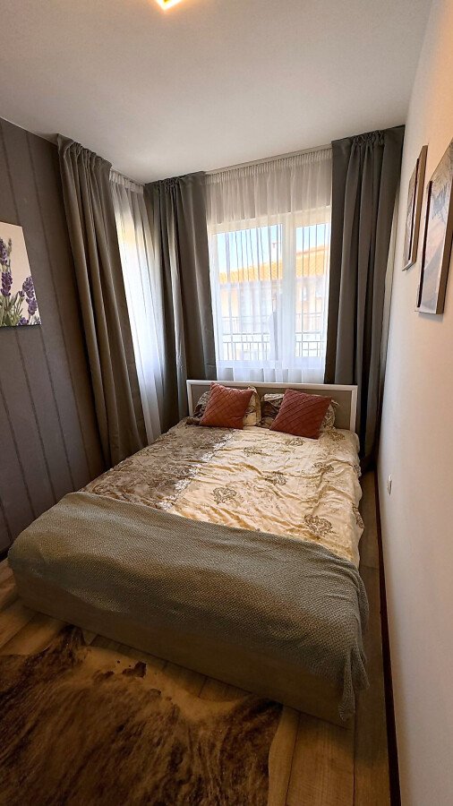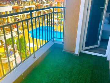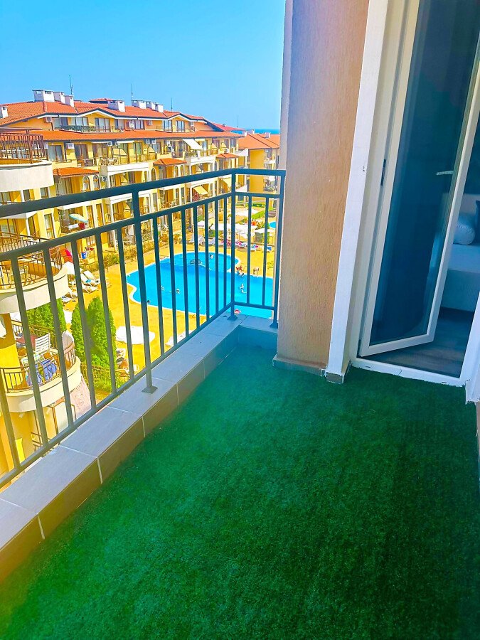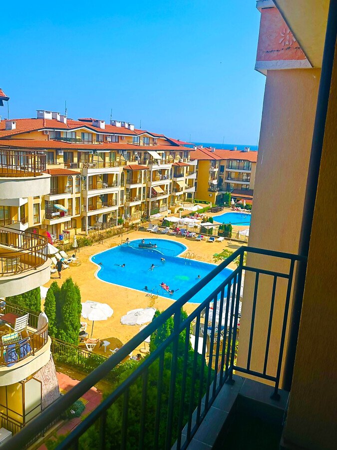 Апартаментът се продава в отлично състояние, с качествено оборудване и стилно обзавеждане, със следното разпределение – входно антре, просторна и уютна всекидневна с кът за хранене и кухненски бокс, баня с тоалетна и душ кабина, светла спалня, балкон с прекрасна гледка към морето и към басейна.