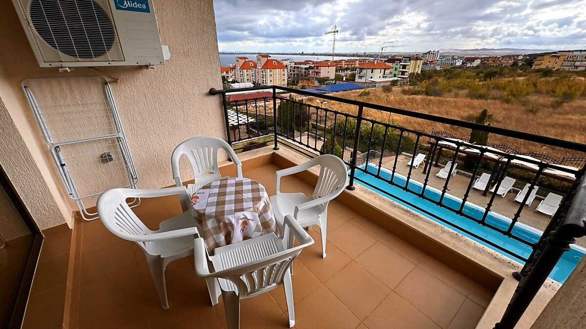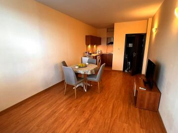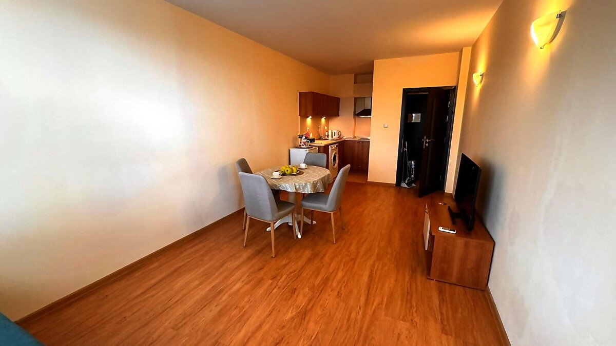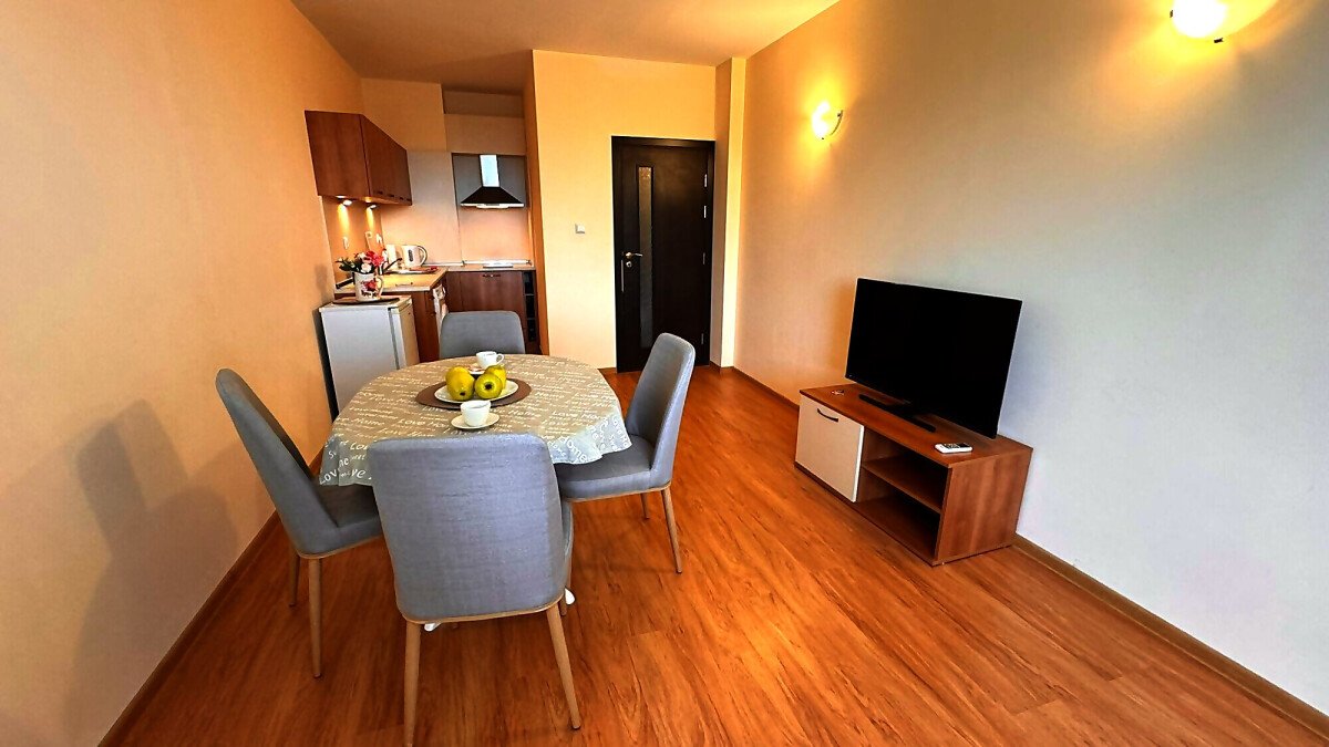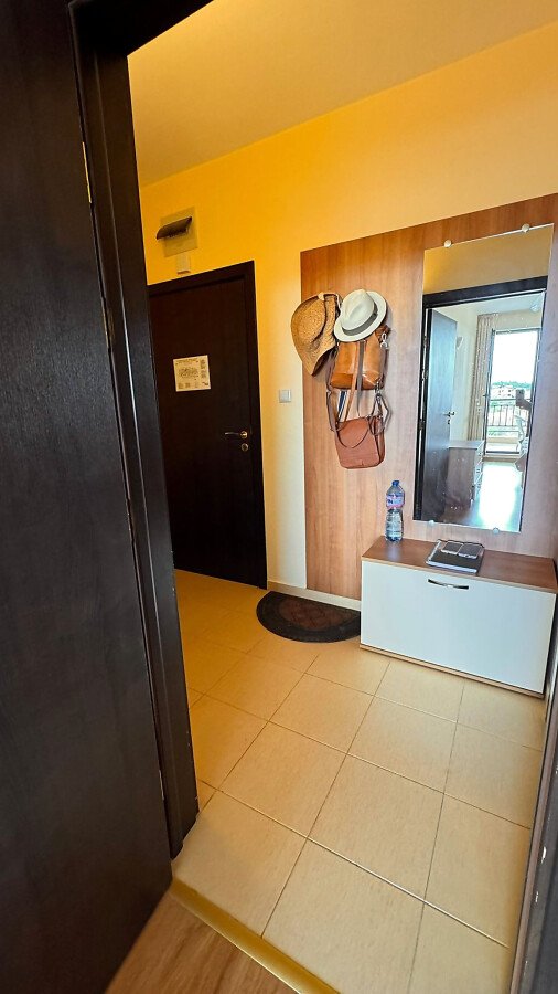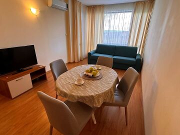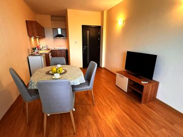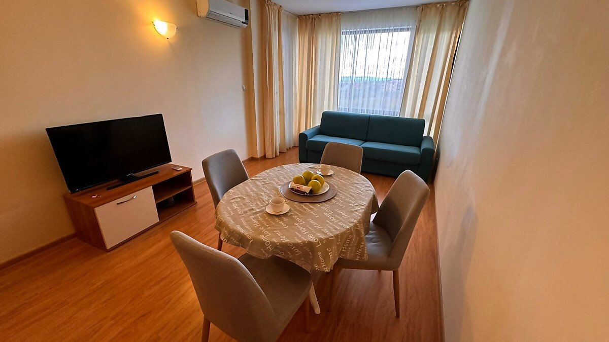 Апартаментът е слънчев и просторен, напълно обзаведен и оборудван с всичко необходимо, със следното разпределение – входно антре, уютна всекидневна с малък кухненски кът и зона за хранене, голяма спалня, баня с тоалетна, балкон с чудесен изглед към морето, басейна и курортите Свети Влас, Несебър и Слънчев бряг.