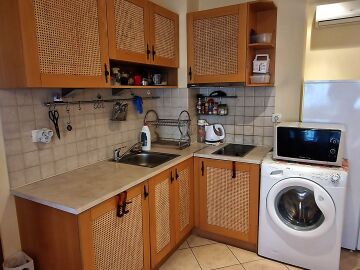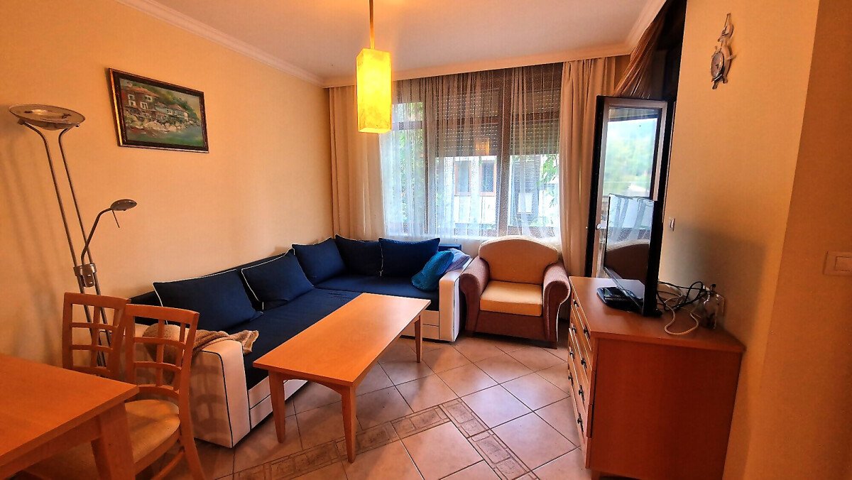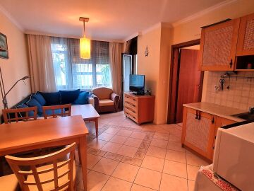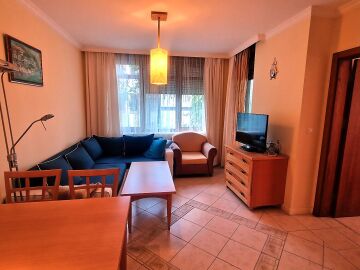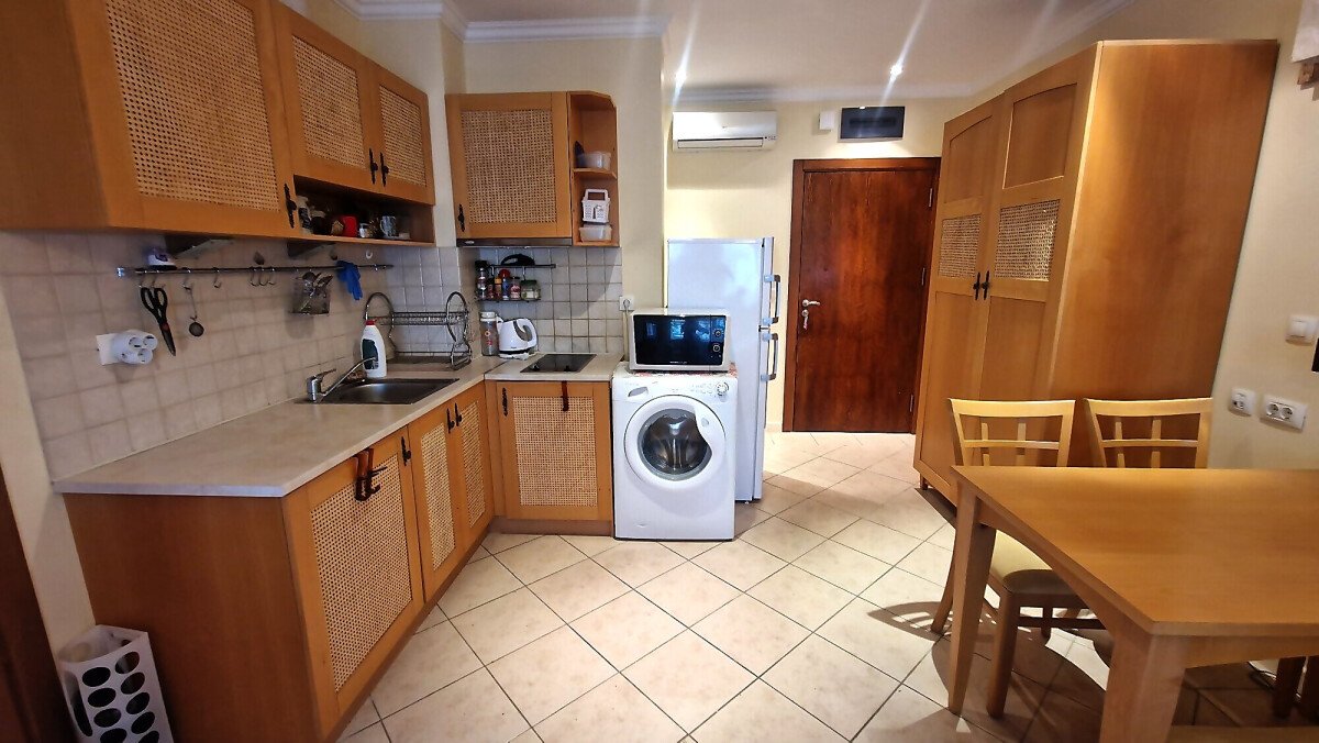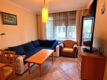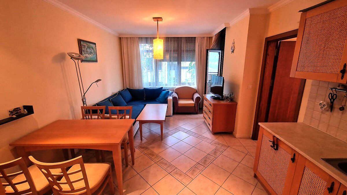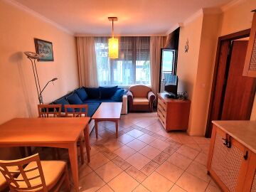 Апартаментът се състои от просторна всекидневна с кухненски бокс и кът за хранене, две спални, баня с тоалетна и душ кабина, голяма тераса със странична гледка към морето и озеленените площи. Продава се напълно обзаведен и готов за живеене.
