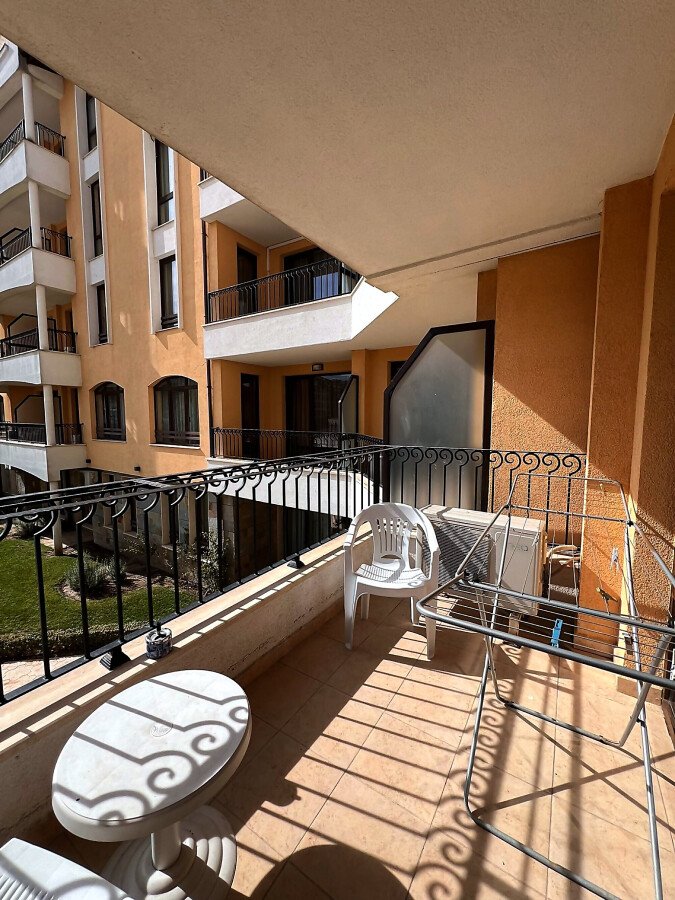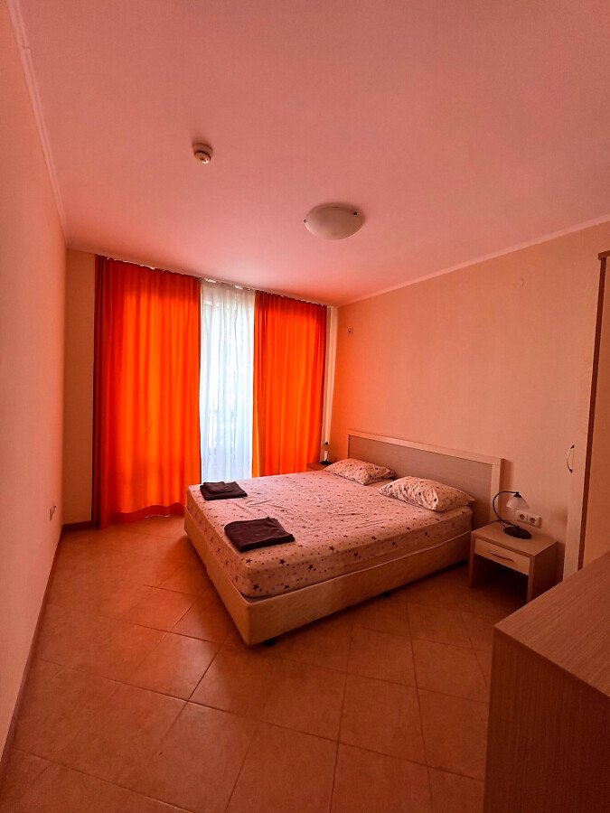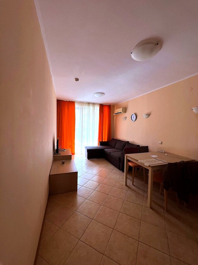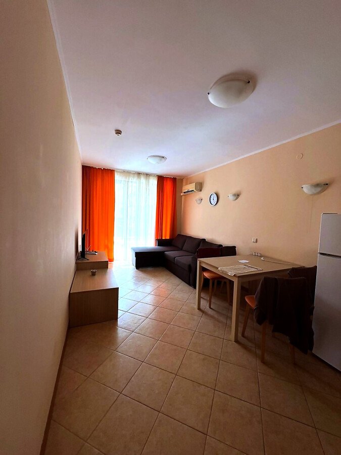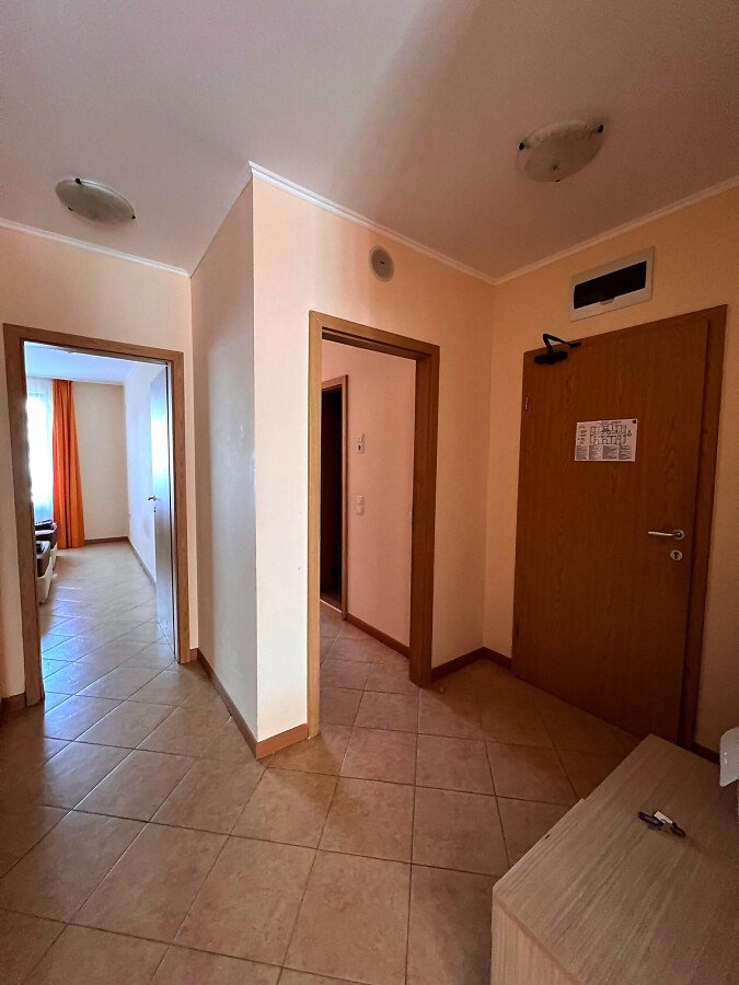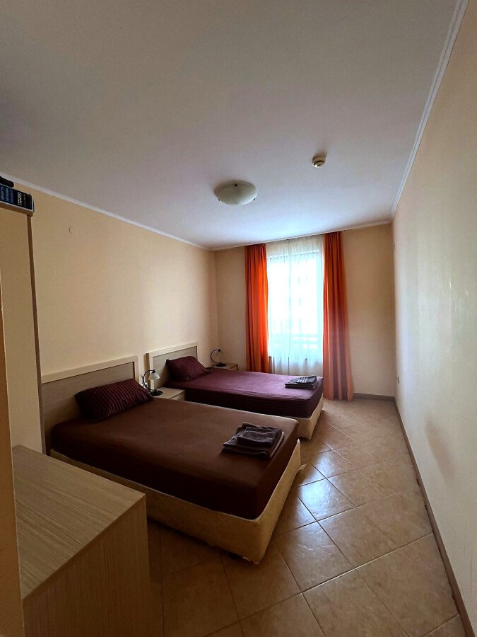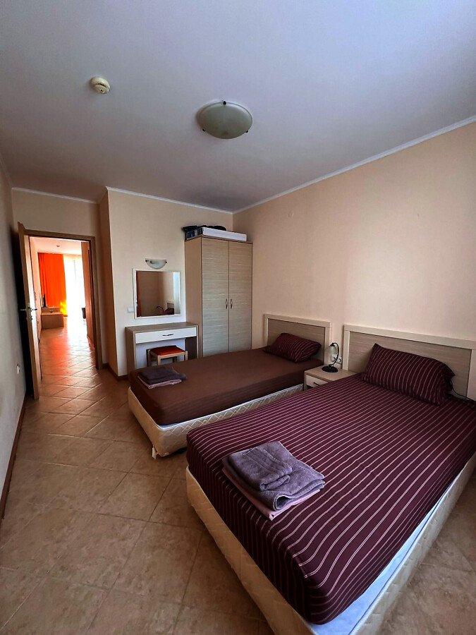 Апартаментът се продава в отлично състояние, напълно оборудван и обзаведен с всичко необходимо, със следното разпределение – входно антре, коридор, всекидневна с кът за хранене и кухненски бокс, баня с тоалетна и вана, балкон с изглед към басейна и вътрешната част на комплекса, спалня с две единични легла, още една спалня със самостоятелна баня с тоалетна и душ кабина и тераса.