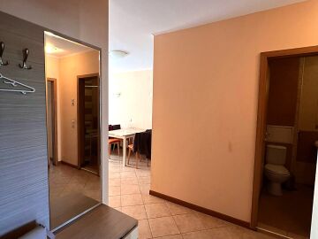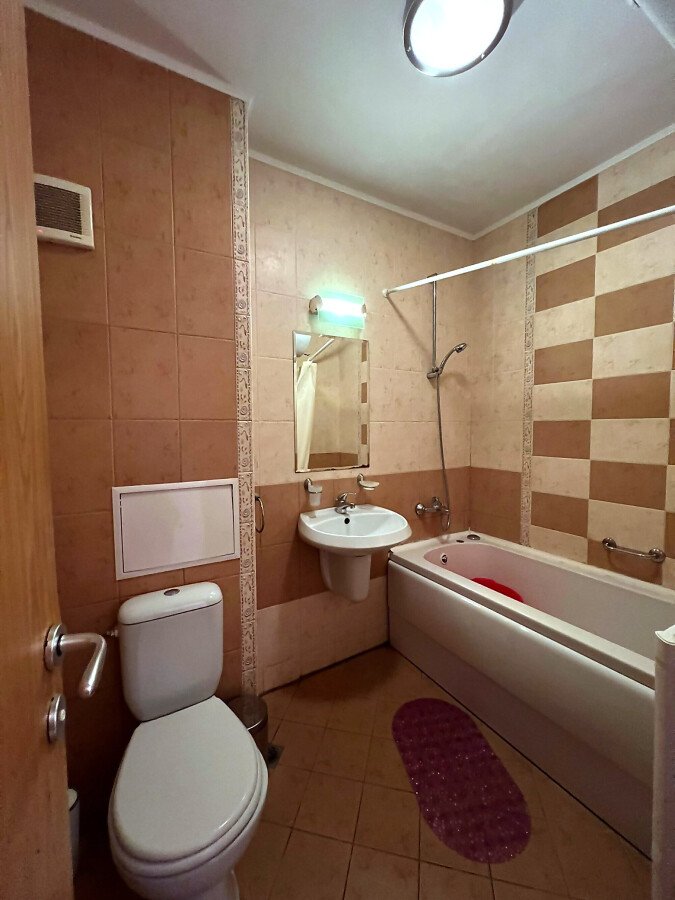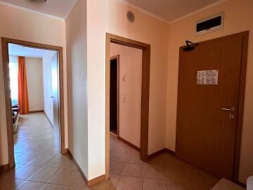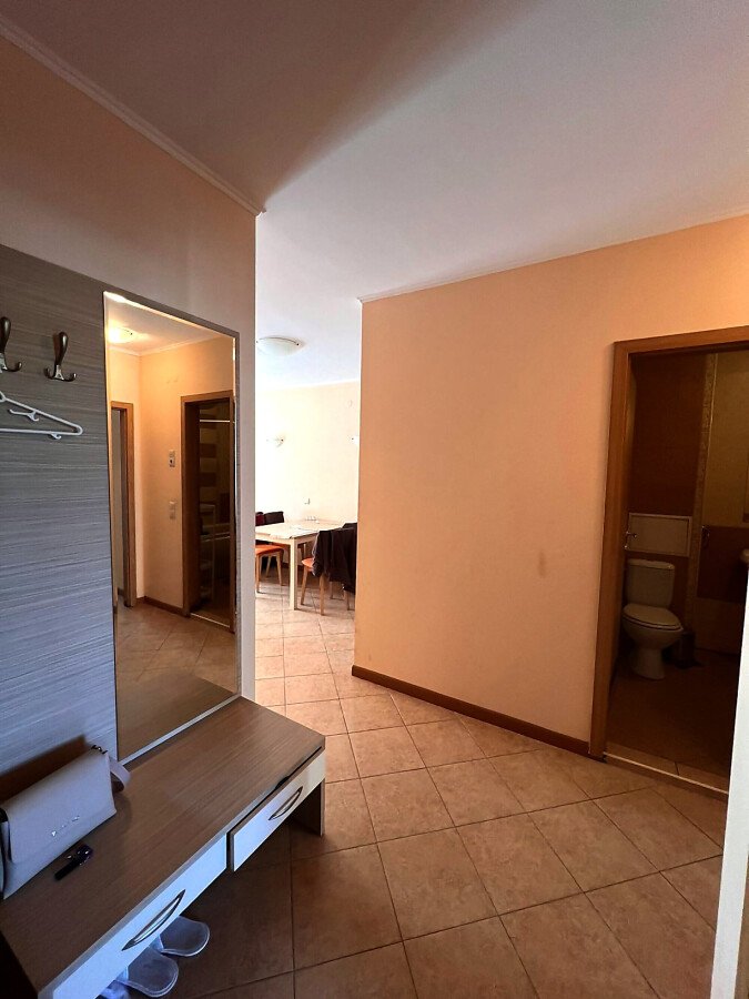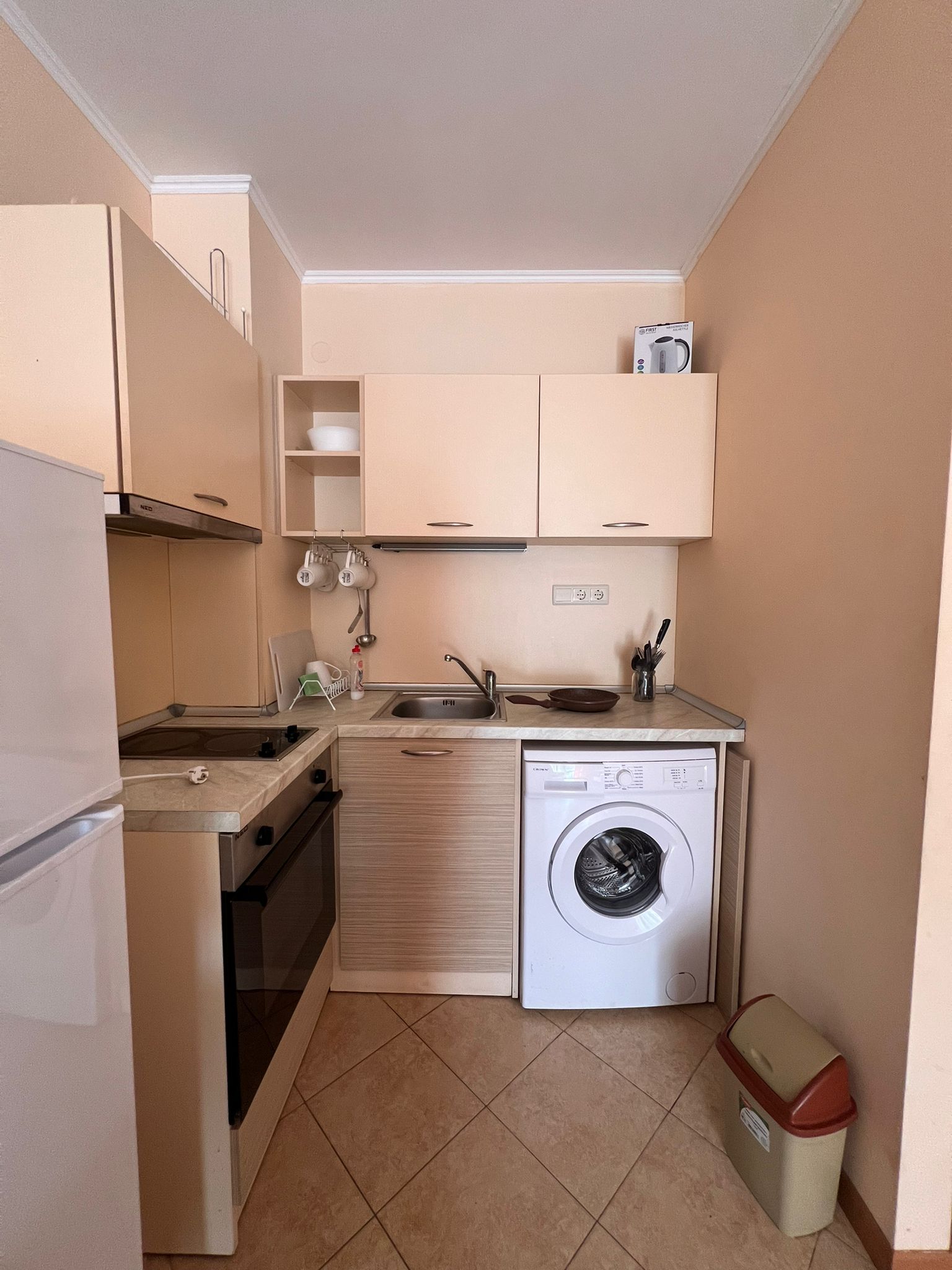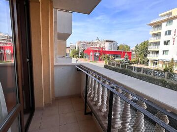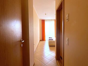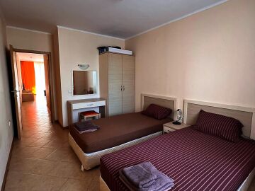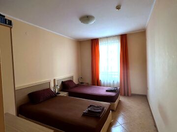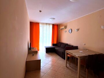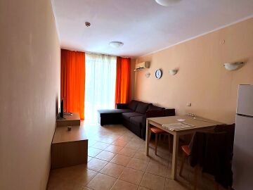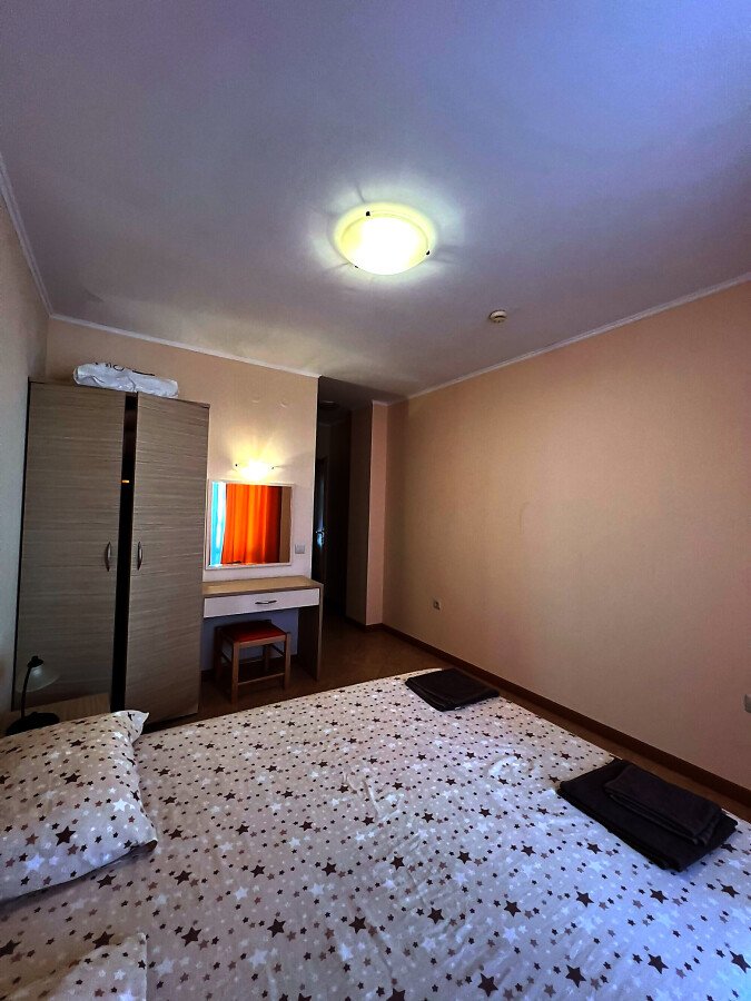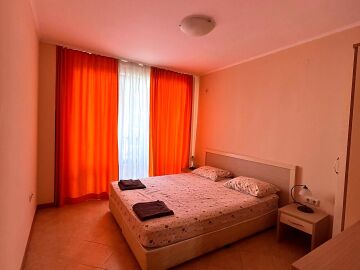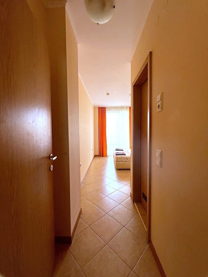 Апартаментът се продава в отлично състояние, напълно оборудван и обзаведен с всичко необходимо, със следното разпределение – входно антре, коридор, всекидневна с кът за хранене и кухненски бокс, баня с тоалетна и вана, балкон с изглед към басейна и вътрешната част на комплекса, спалня с две единични легла, още една спалня със самостоятелна баня с тоалетна и душ кабина и тераса.