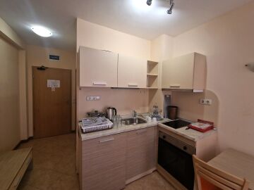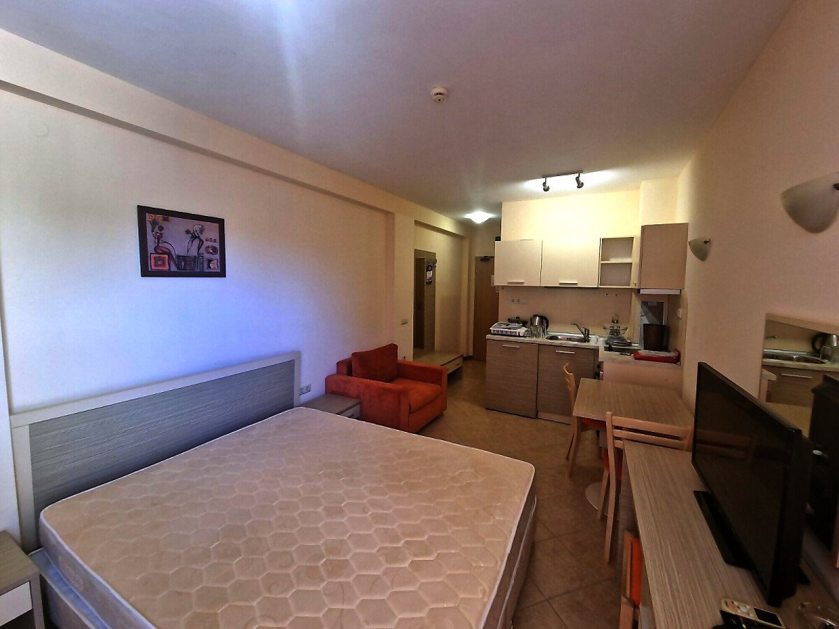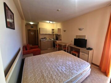 Студиото е разположено на четвърти жилищен етаж, а разпределението е следното: антре, обособен кухненски бокс с кът за хранене, зона за почивка, зона за сън с голямо легло, балкон.