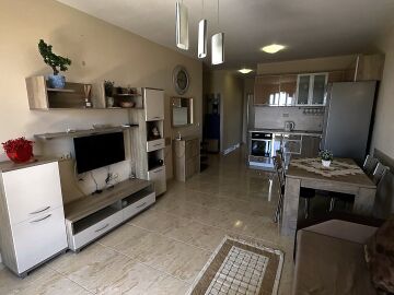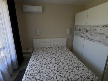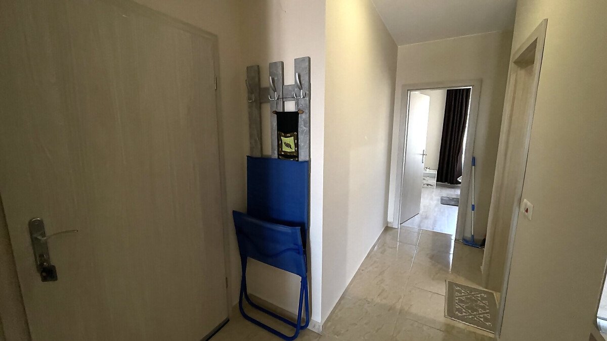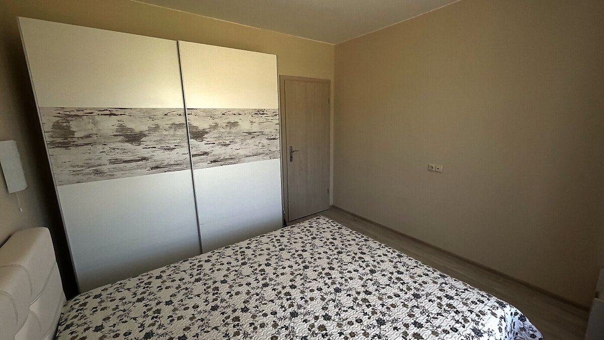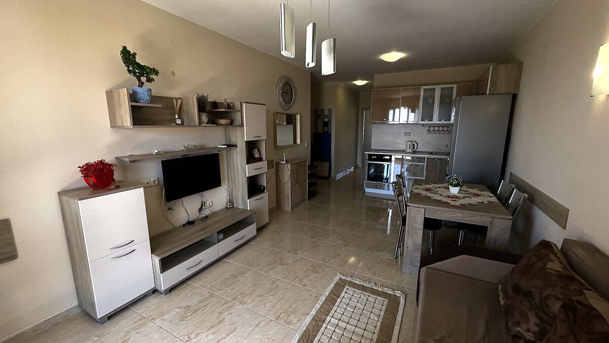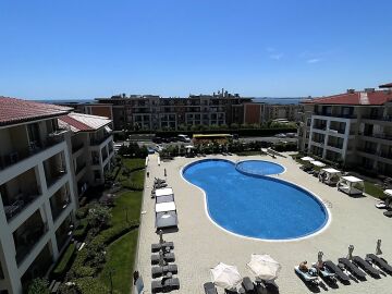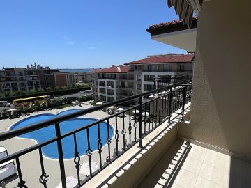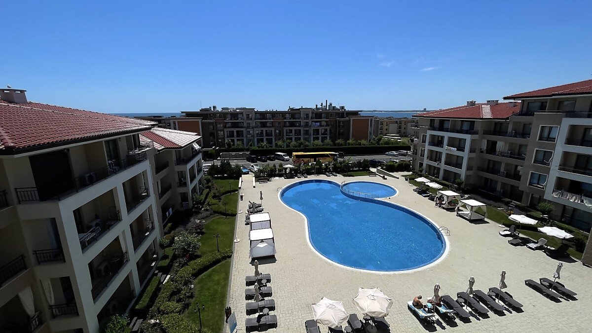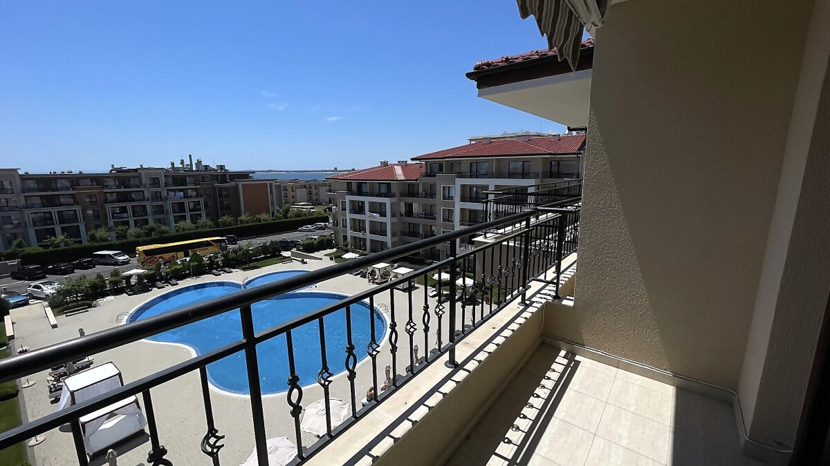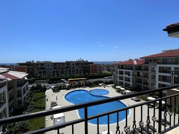 Апартаментът е разположен на четвърти жилищен етаж със следното разпределение: антре, всекидневна с кухненски бокс и кът за хранене, спалня, баня с тоалетна, балкон с невероятна гледка към морето и басейна. Продава се напълно обзаведен, готов за живеене или отдаване под наем.