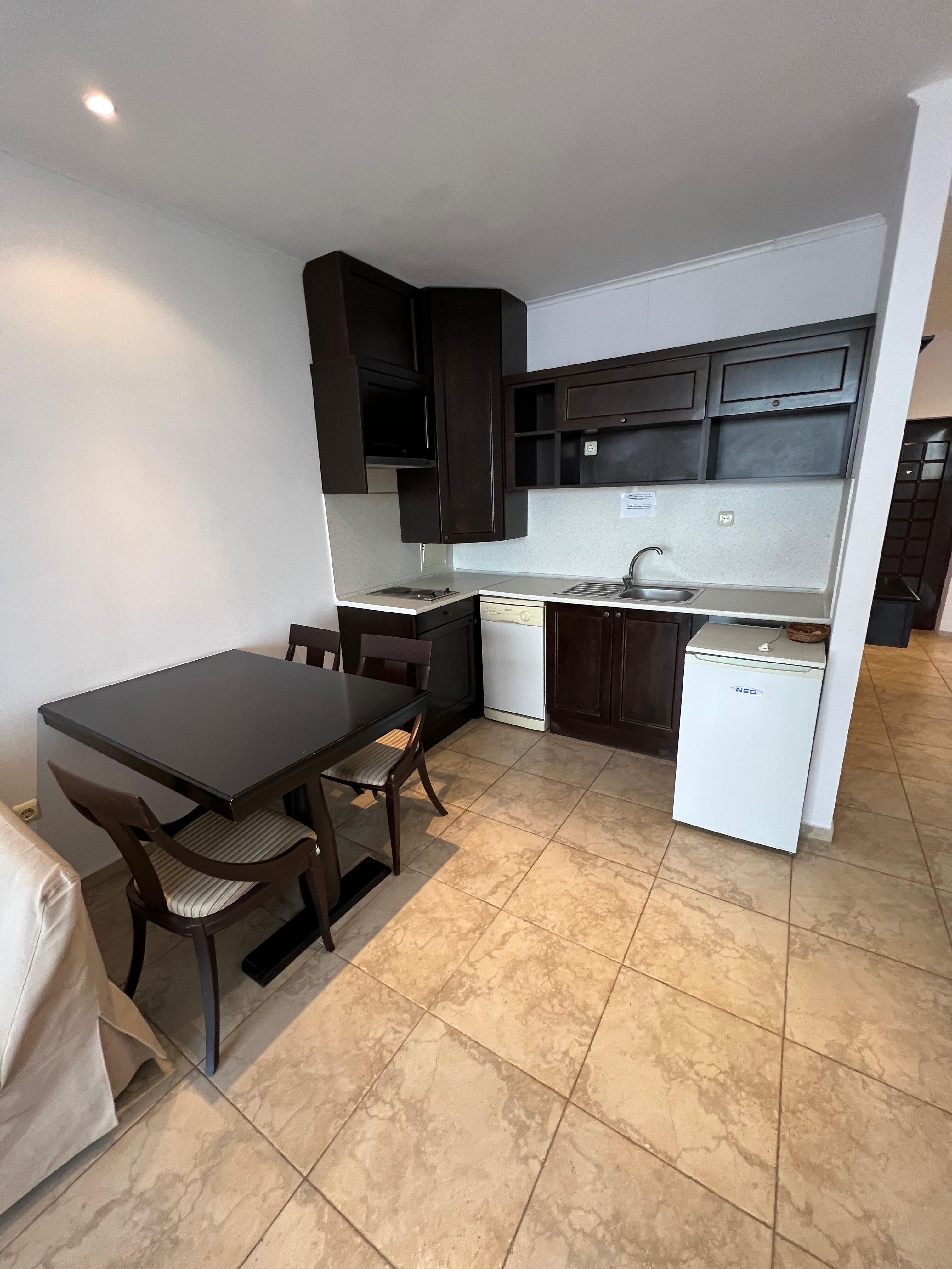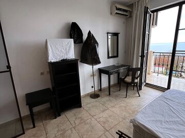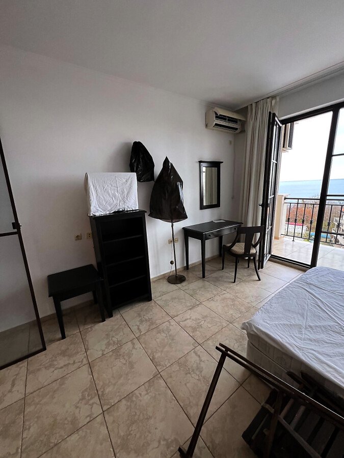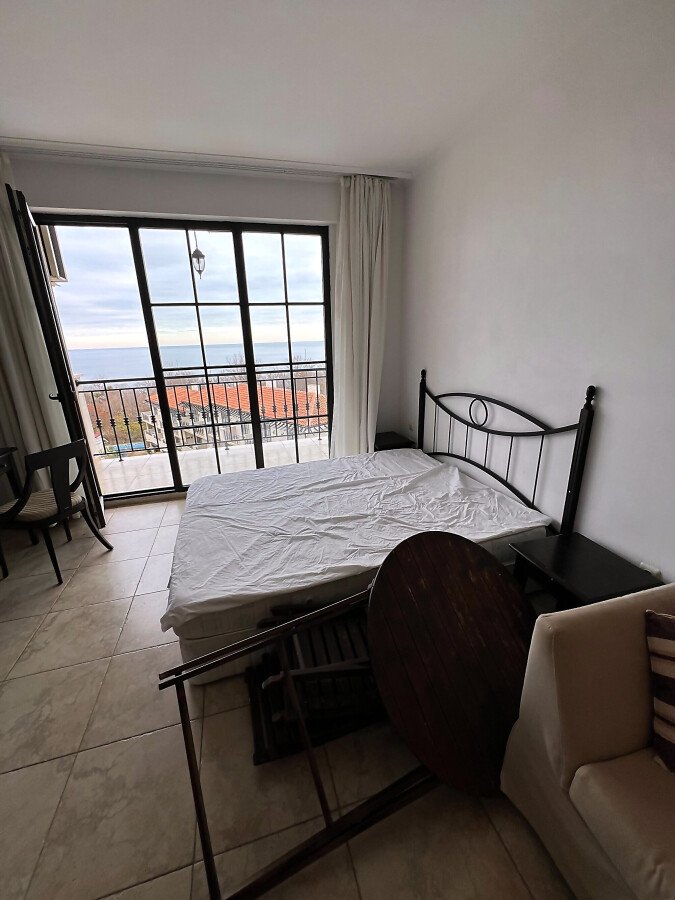 Апартаментът е много функционален, със следното разпределение – голяма всекидневна с обособена зона за хранене и кухненски бокс, спалня, баня с тоалетна и вана, тераса с красива гледка към морето и басейна.