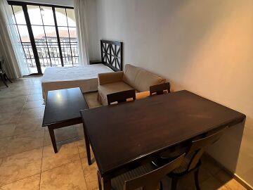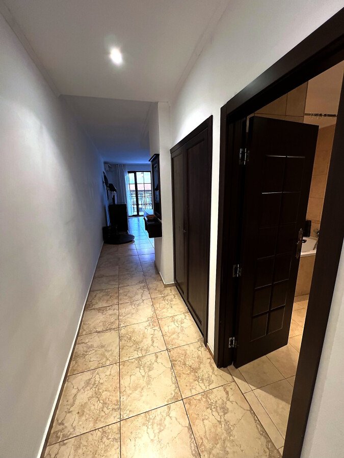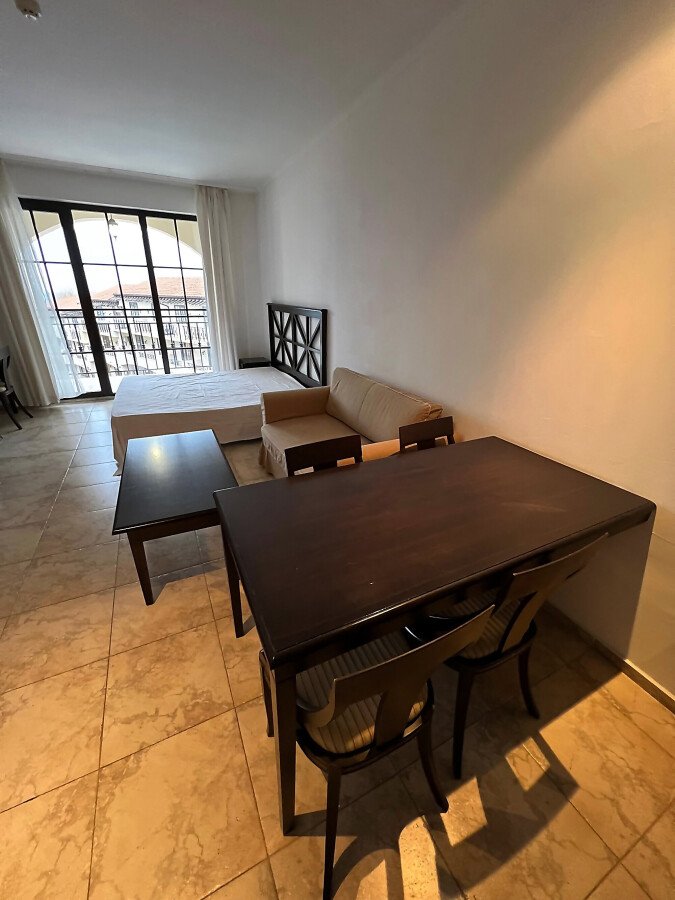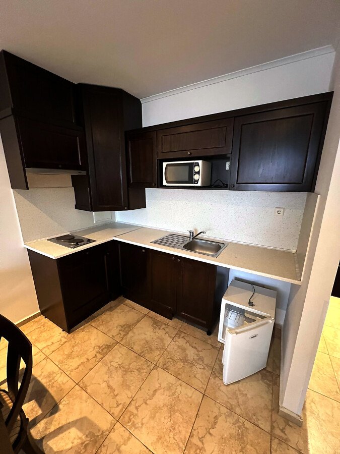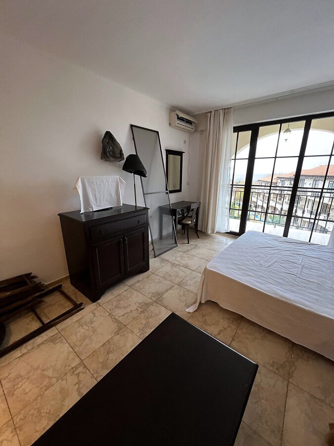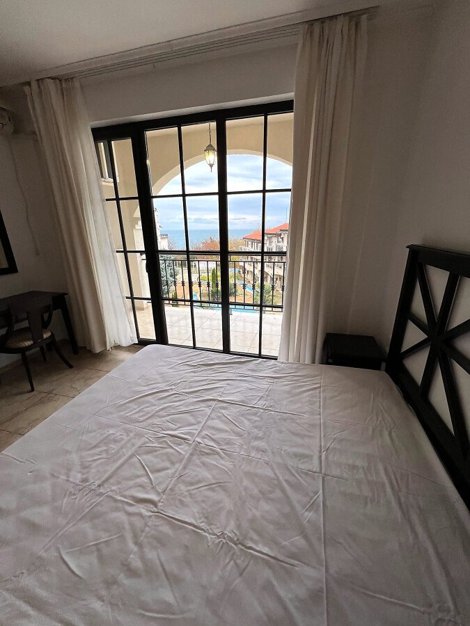 Апартаментът е много функционален, със следното разпределение – голяма всекидневна с обособена зона за хранене и кухненски бокс, спалня, баня с тоалетна и вана, тераса с красива гледка към морето и басейна.
