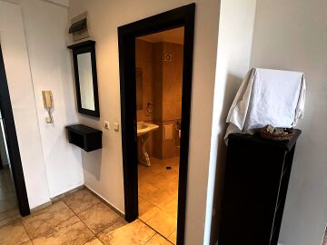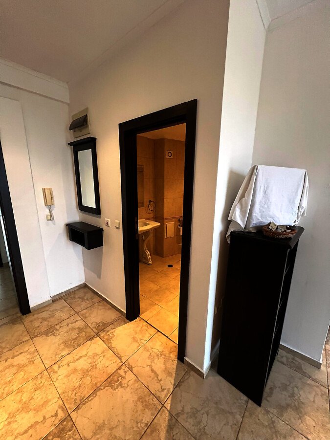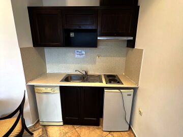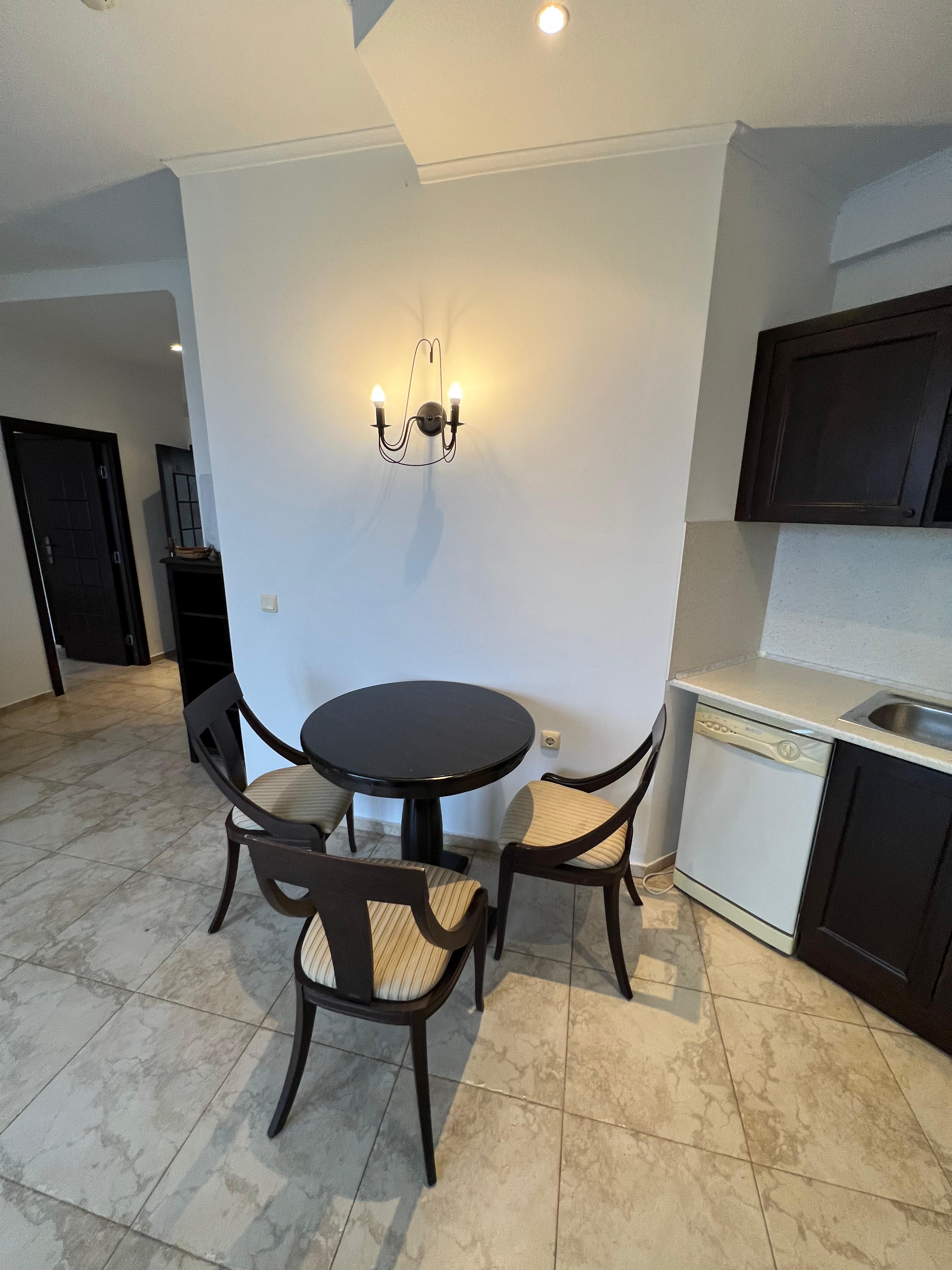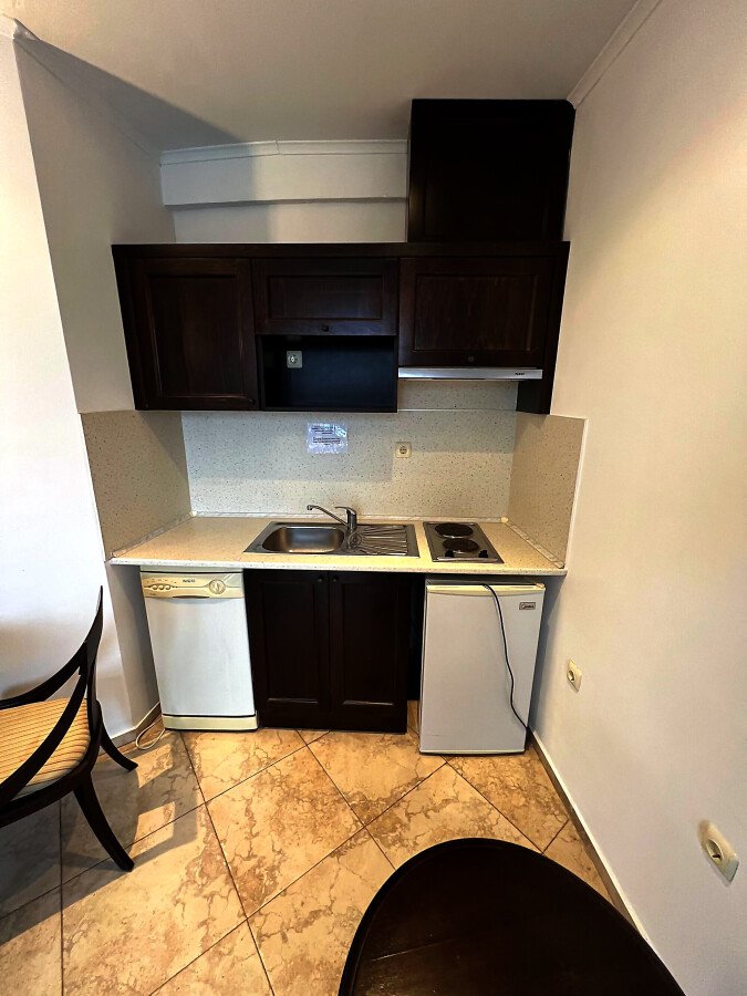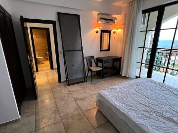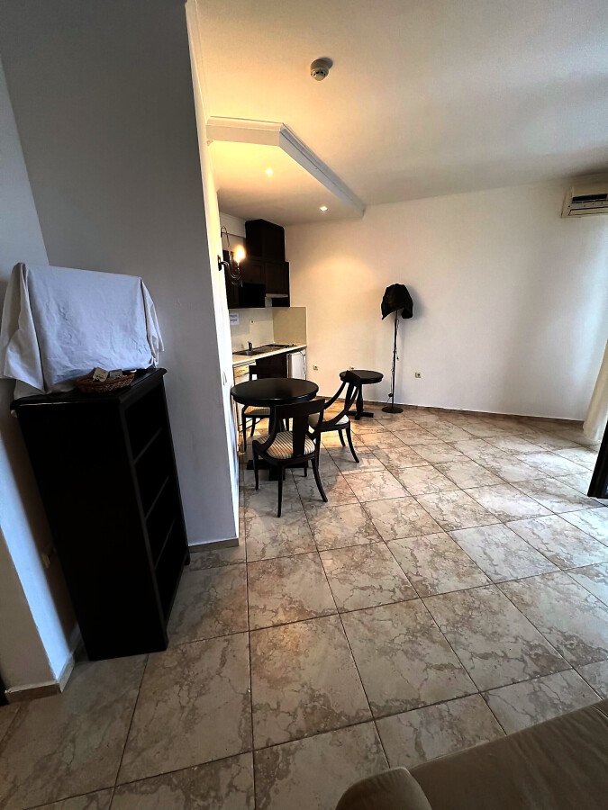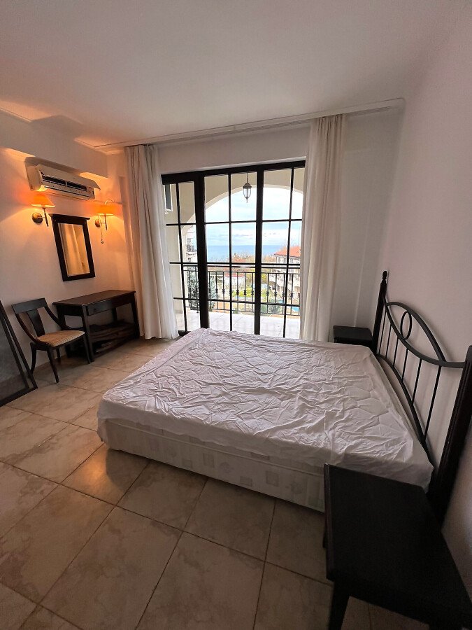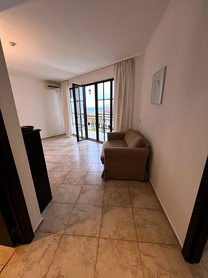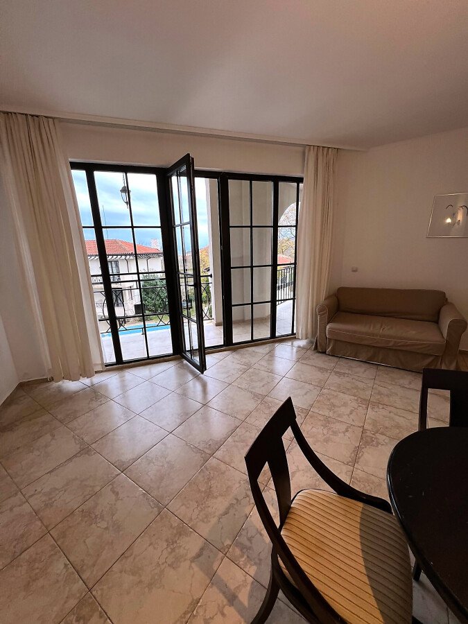 Апартаментът е много функционален, със следното разпределение – входно антре, голяма всекидневна с обособена зона за хранене и кухненски бокс, просторна спалня, баня с тоалетна и вана, тераса с красива гледка към морето и басейна.