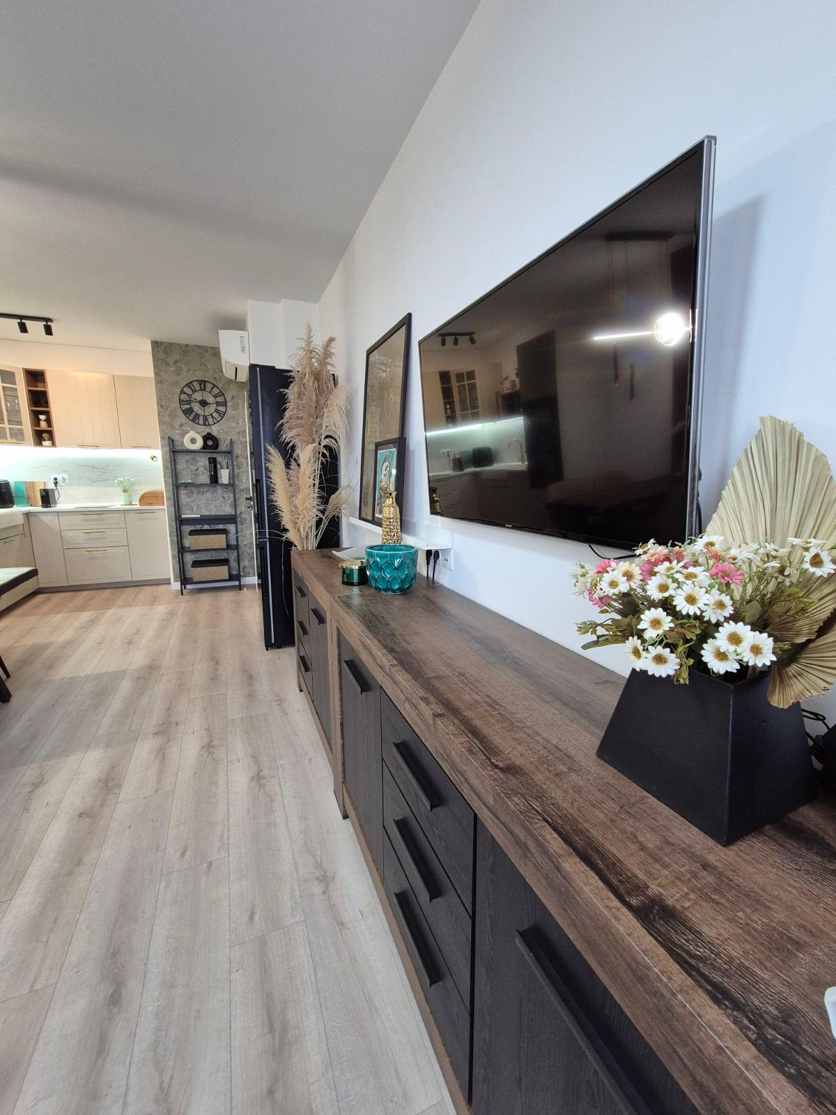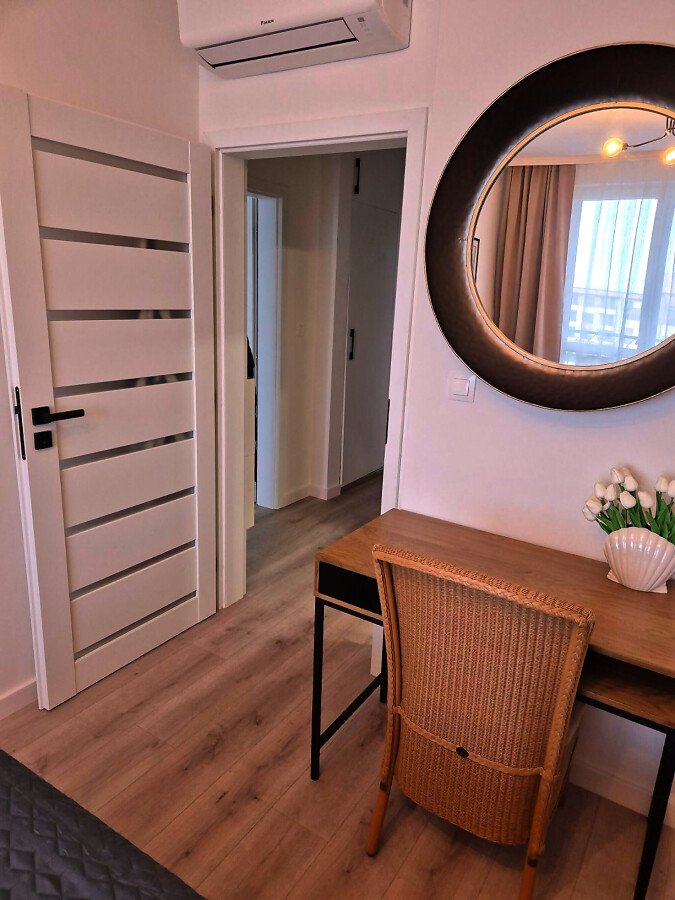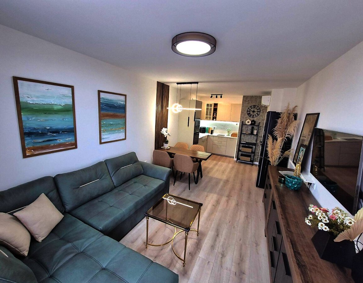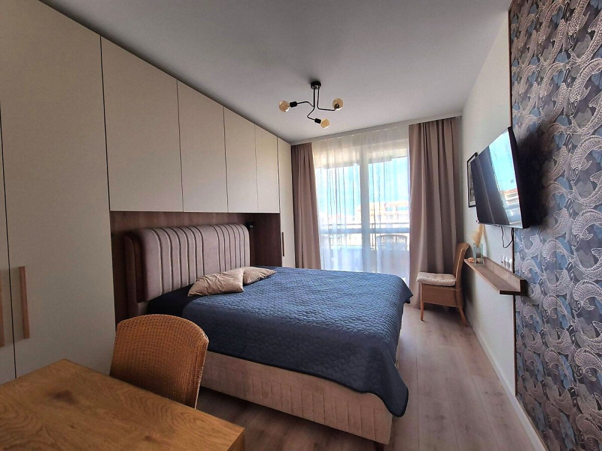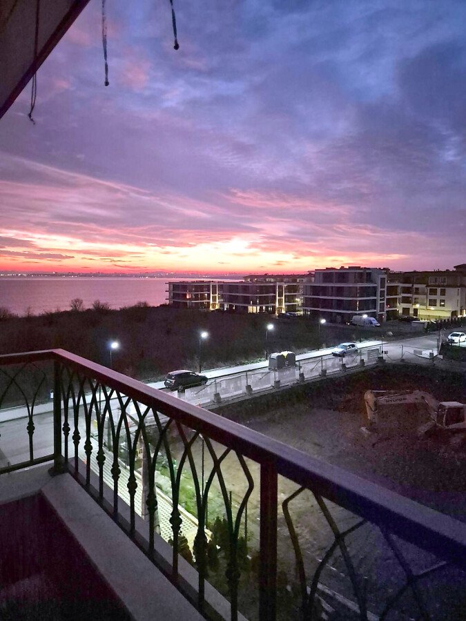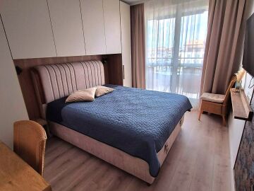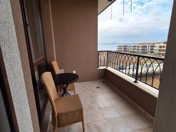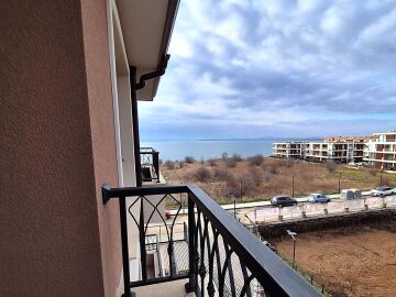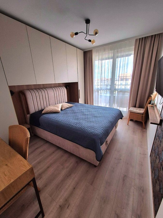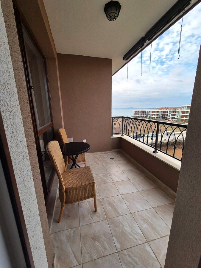 Апартаментът се продава с отлично ново обзавеждане и качествено оборудване, разположен на четвърти етаж, със следното разпределение – входно антре, всекидневна с обособен кухненски бокс и зона за хранене, уютна спалня, баня с тоалетна и душ кабина, тераса с красива странична гледка към морето.