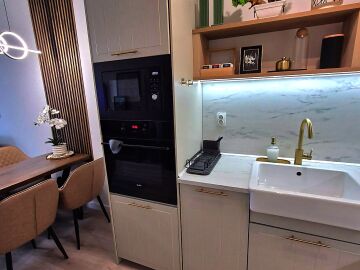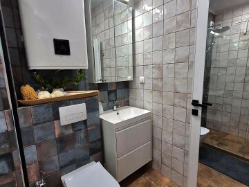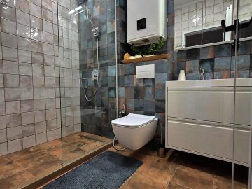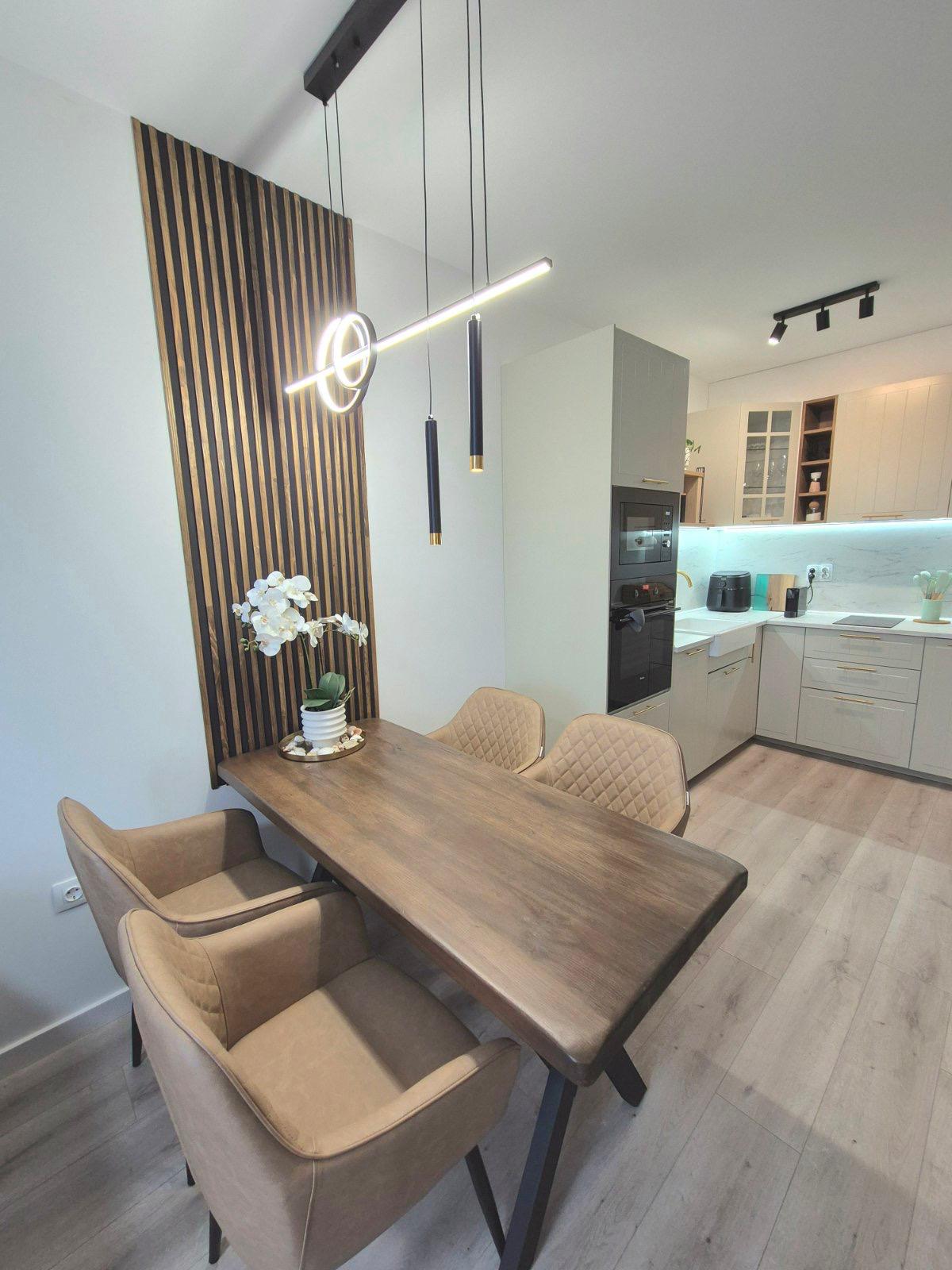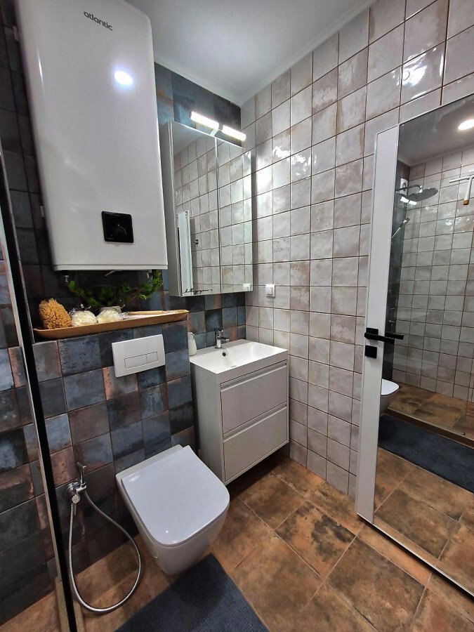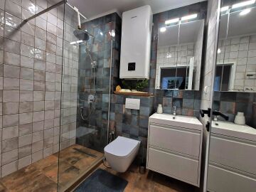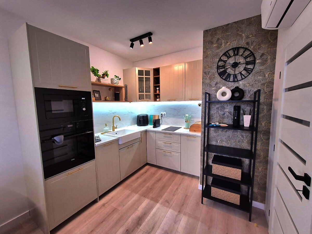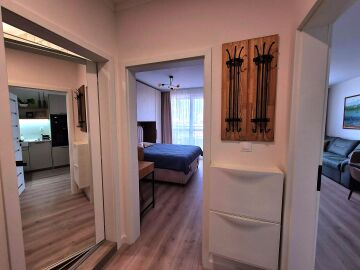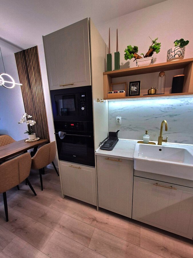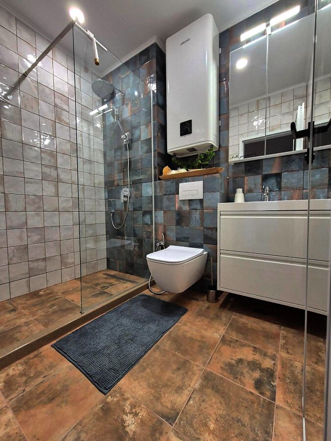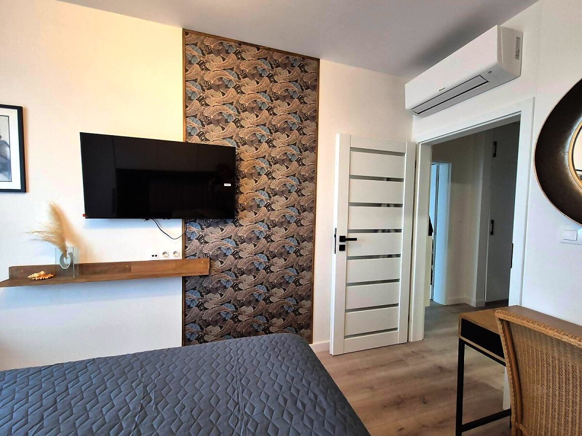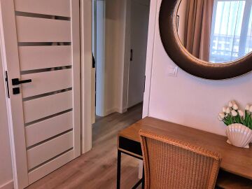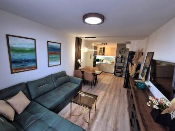 Апартаментът се продава с отлично ново обзавеждане и качествено оборудване, разположен на четвърти етаж, със следното разпределение – входно антре, всекидневна с обособен кухненски бокс и зона за хранене, уютна спалня, баня с тоалетна и душ кабина, тераса с красива странична гледка към морето.