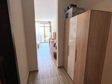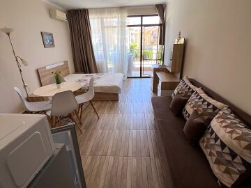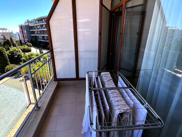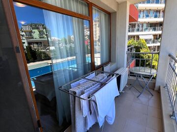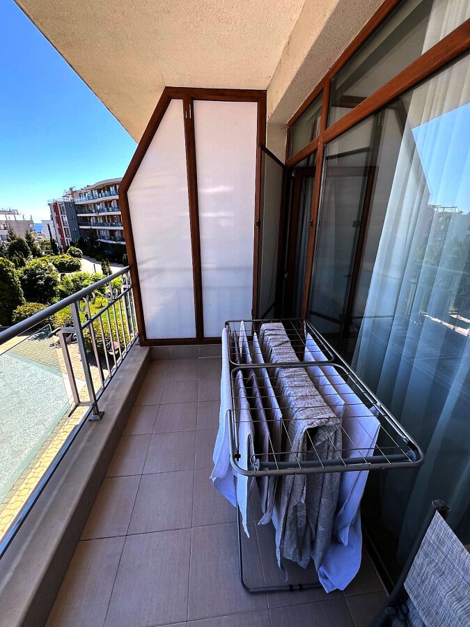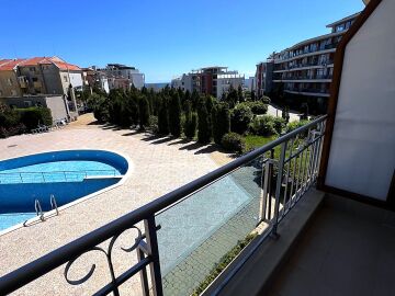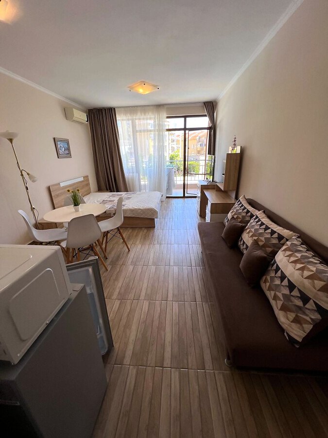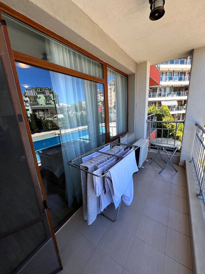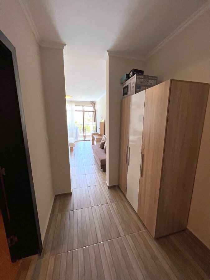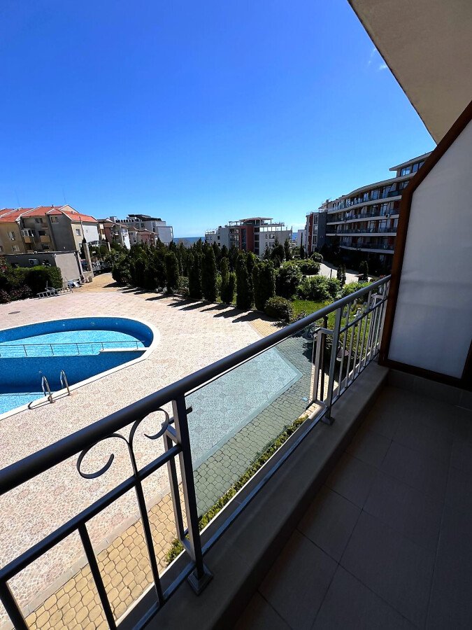 Студиото се продава в отлично състояние, готово за живеене или отдаване под наем, напълно обзаведено и оборудвано, със следното разпределение – входно антре, просторна всекидневна с кухненски кът и зона за хранене, както и обособена спалня, баня с тоалетна и душ кабина, просторен балкон с чудесна гледка към басейна и частична гледка към морето.