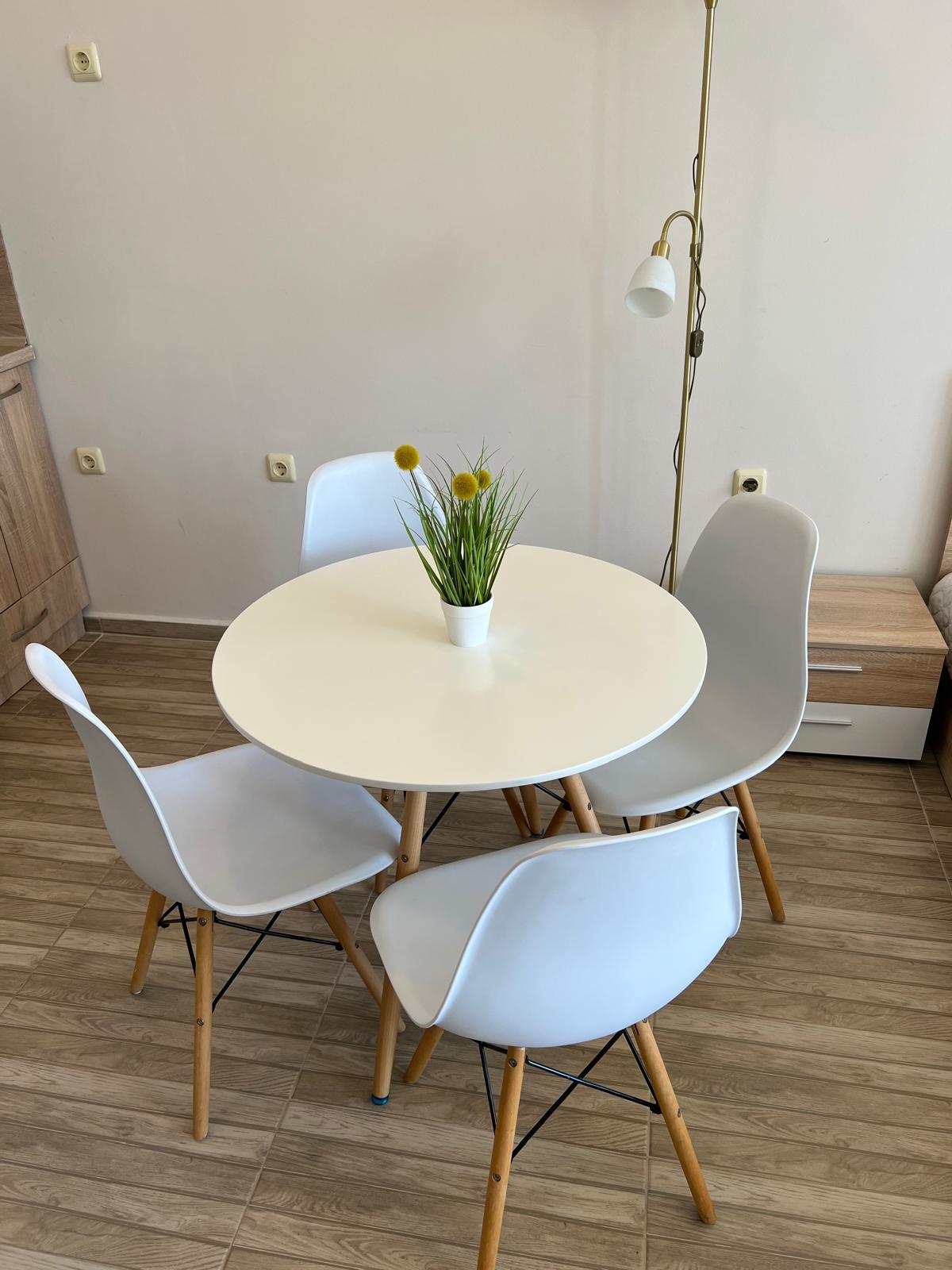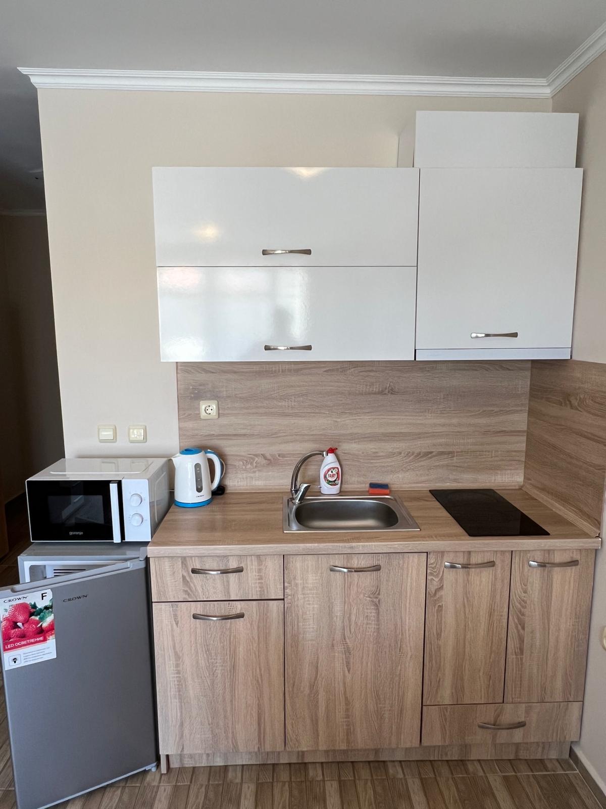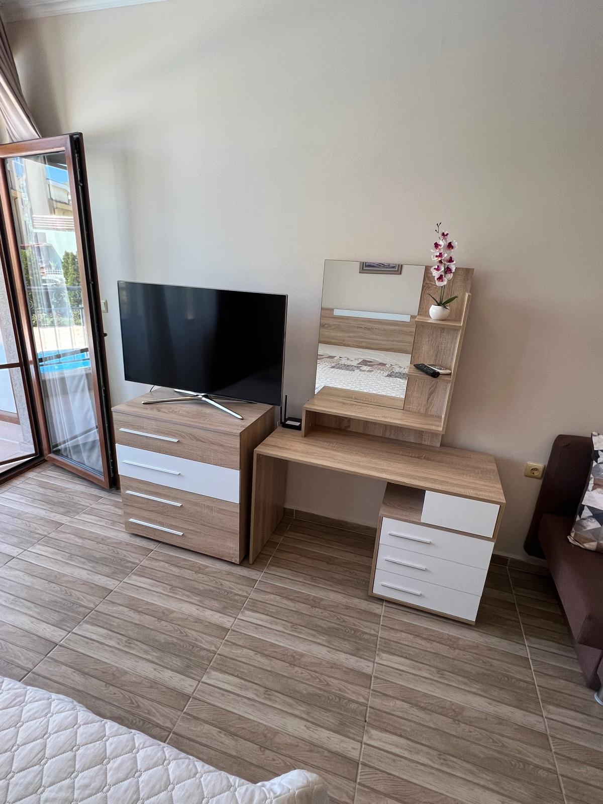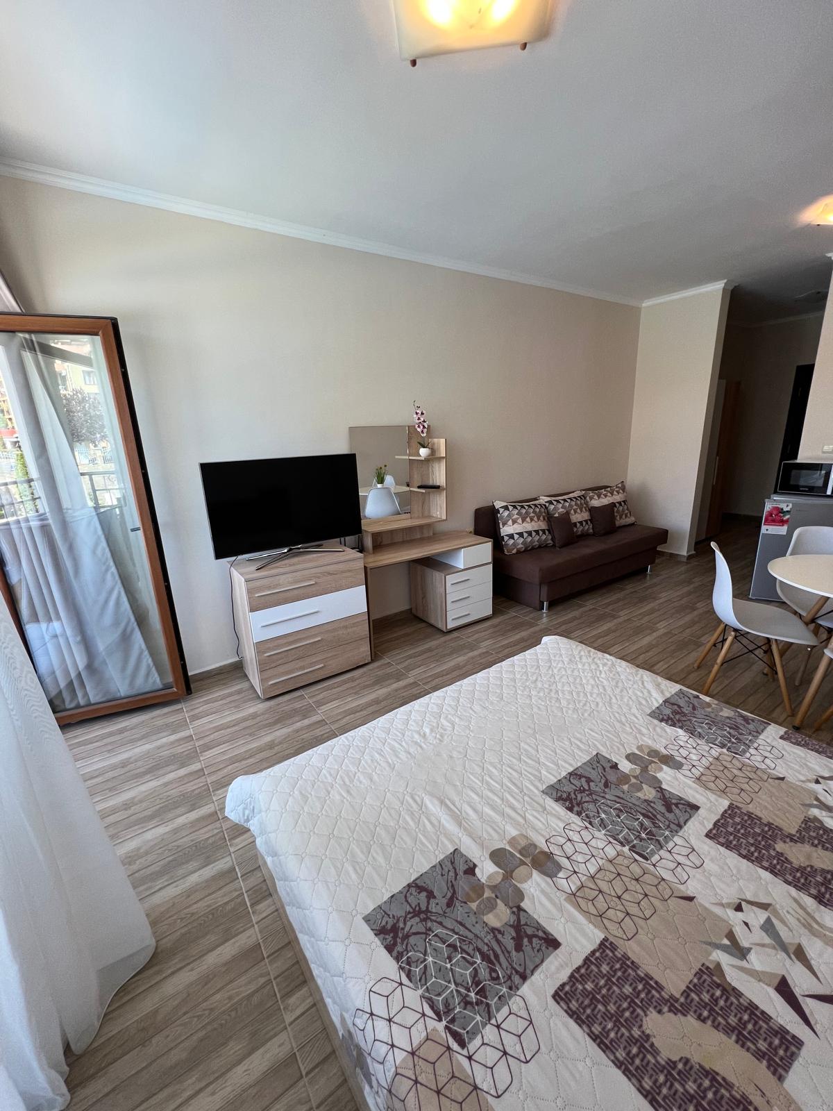 Студиото се продава в отлично състояние, готово за живеене или отдаване под наем, напълно обзаведено и оборудвано, със следното разпределение – входно антре, просторна всекидневна с кухненски кът и зона за хранене, както и обособена спалня, баня с тоалетна и душ кабина, просторен балкон с чудесна гледка към басейна и частична гледка към морето.