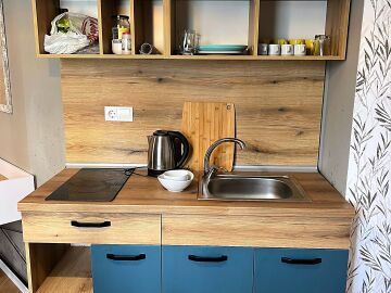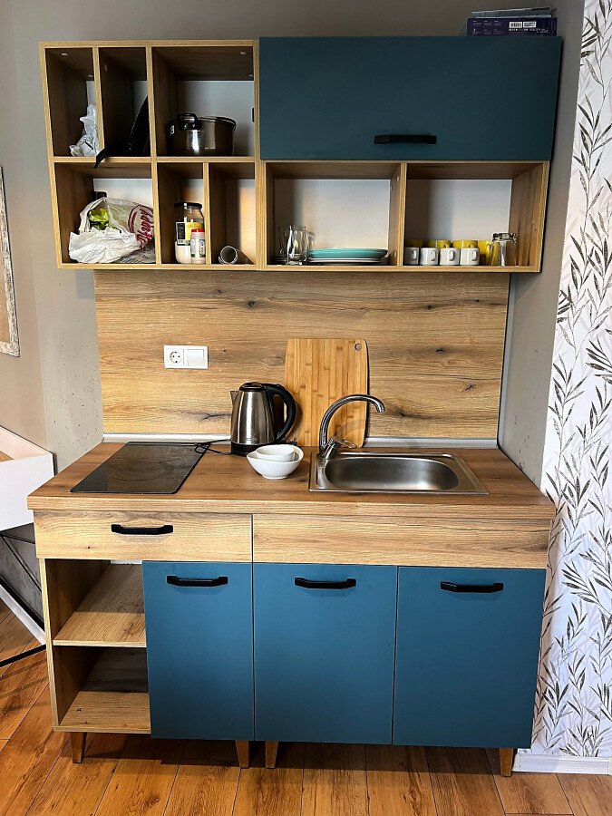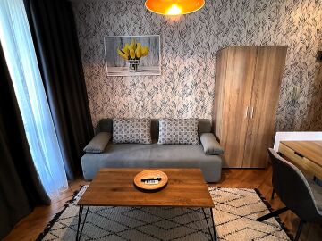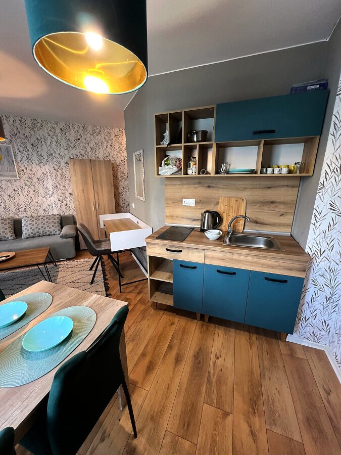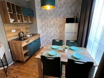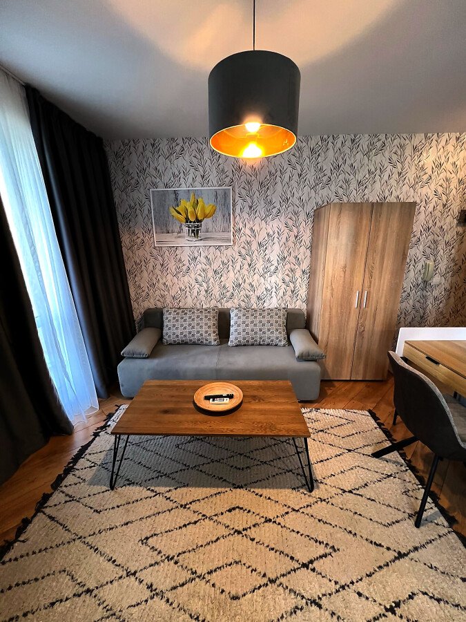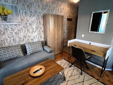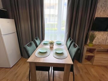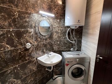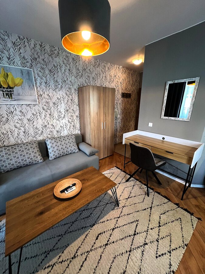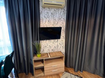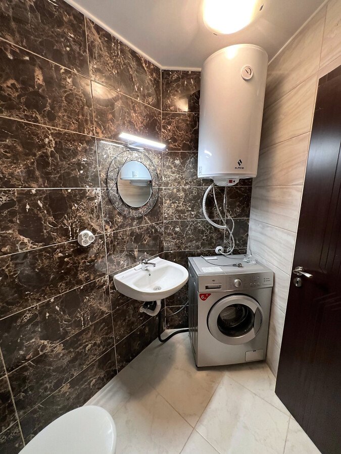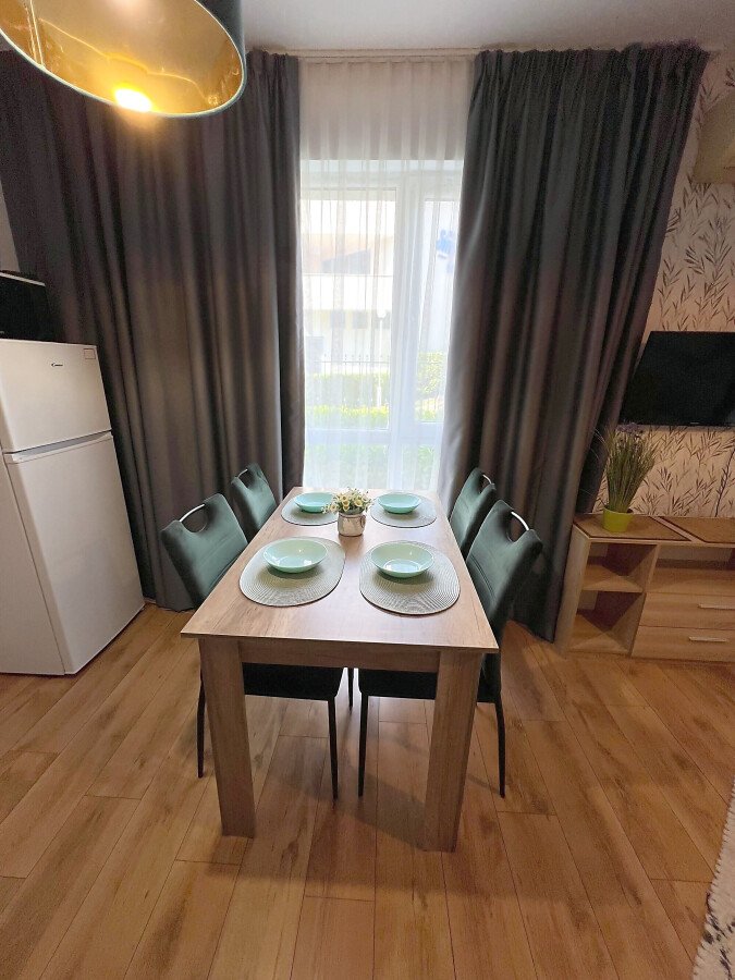 Студиото се продава в отлично състояние, напълно обзаведено и оборудвано, със следното разпределение – входно антре, всекидневна с обособена холна част, зона за хранене и кухненски кът, баня с тоалетна и душ кабина, тераса с гледка към вътрешната част на комплекса.