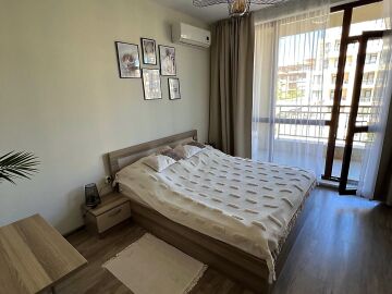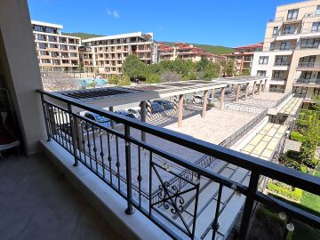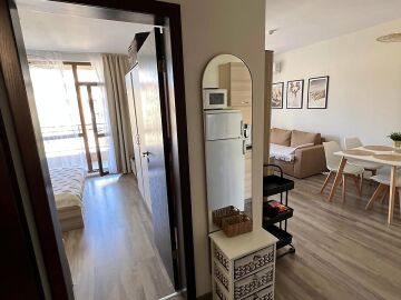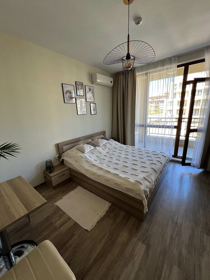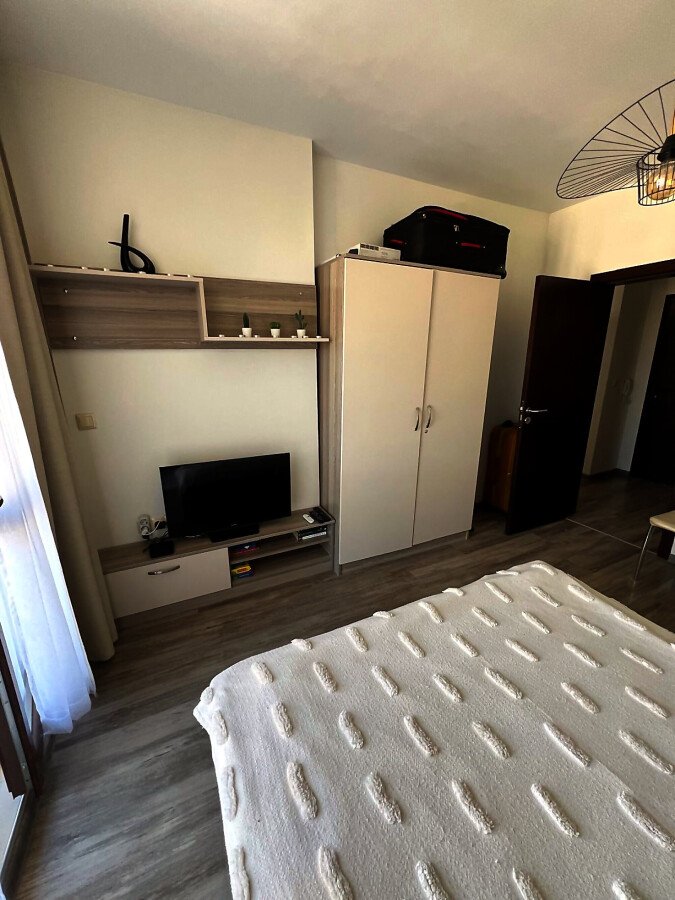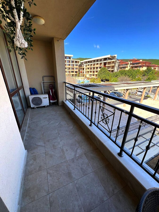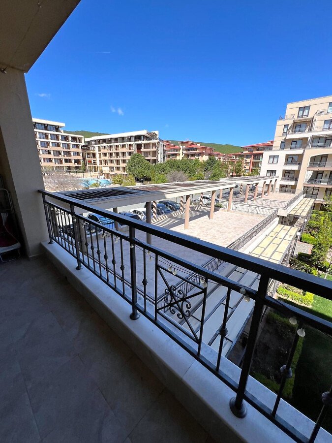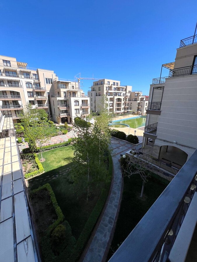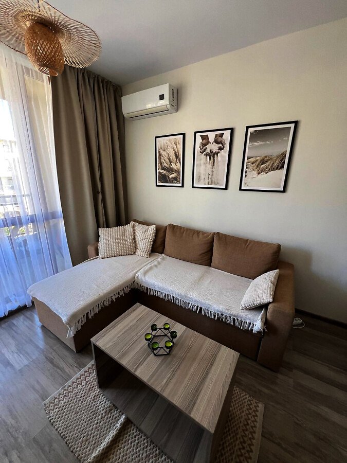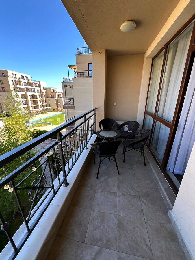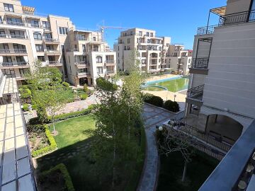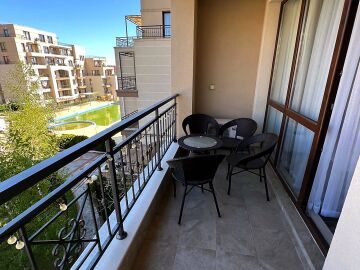 Апартаментът се предлага напълно обзаведен и оборудван, с функционално разпределение - входно антре, просторна всекидневна с кухненски бокс и трапезария, една спалня, баня с тоалетна и душ кабина, както и голяма тераса с изглед към вътрешния двор и басейна.