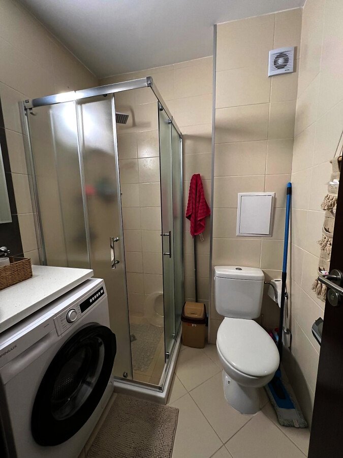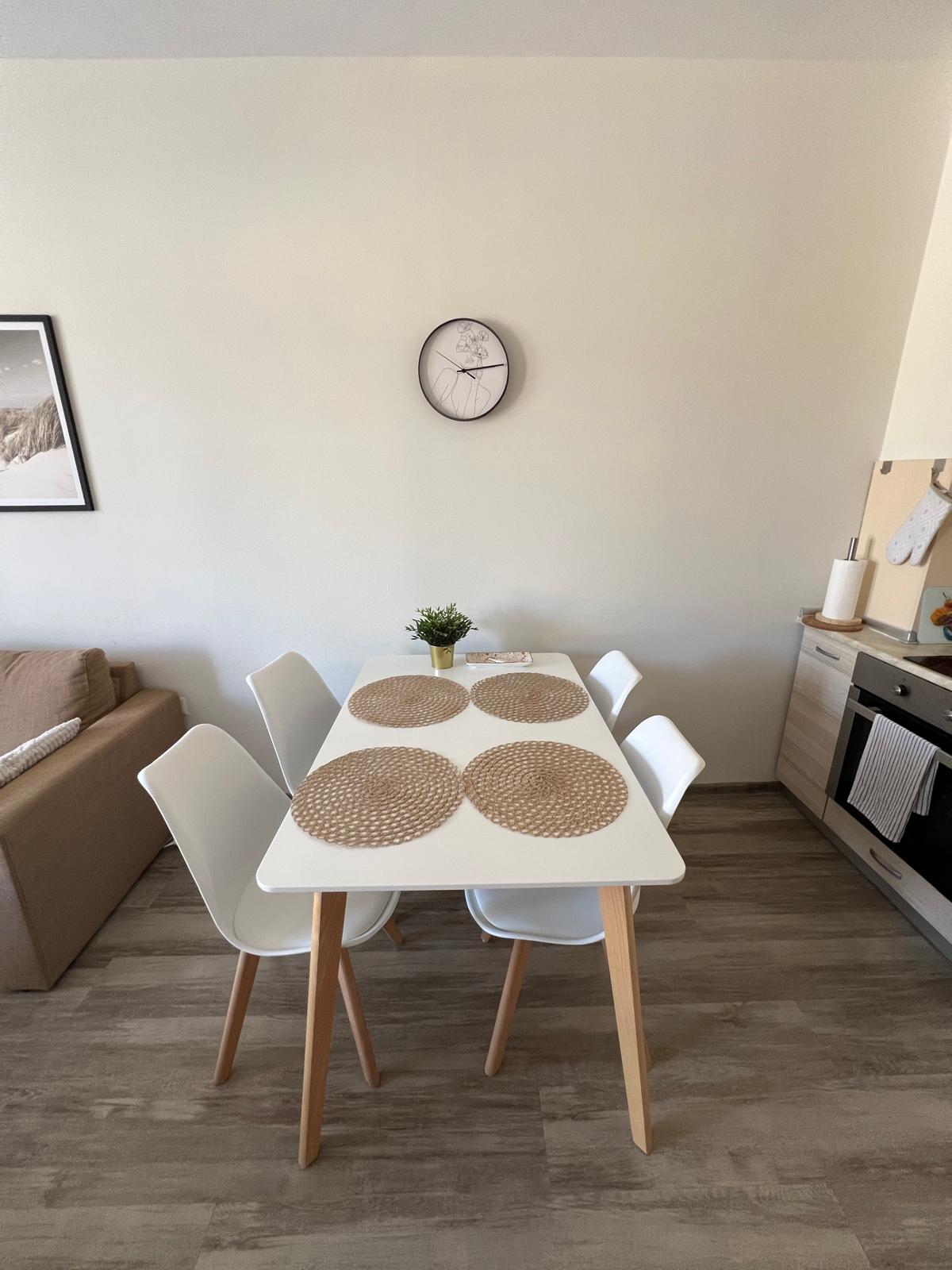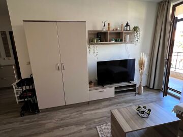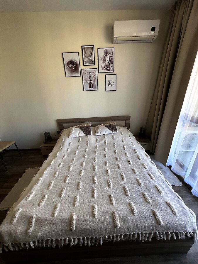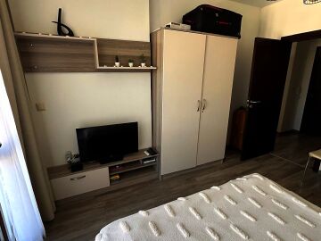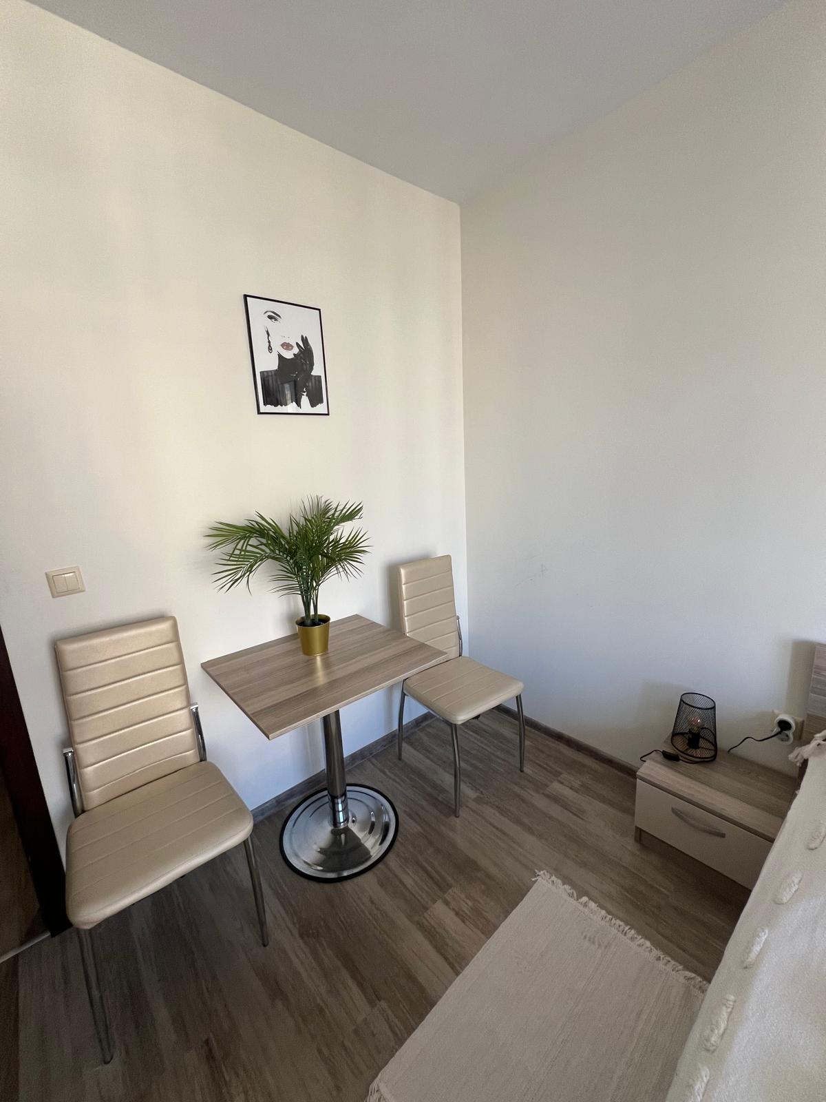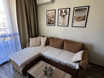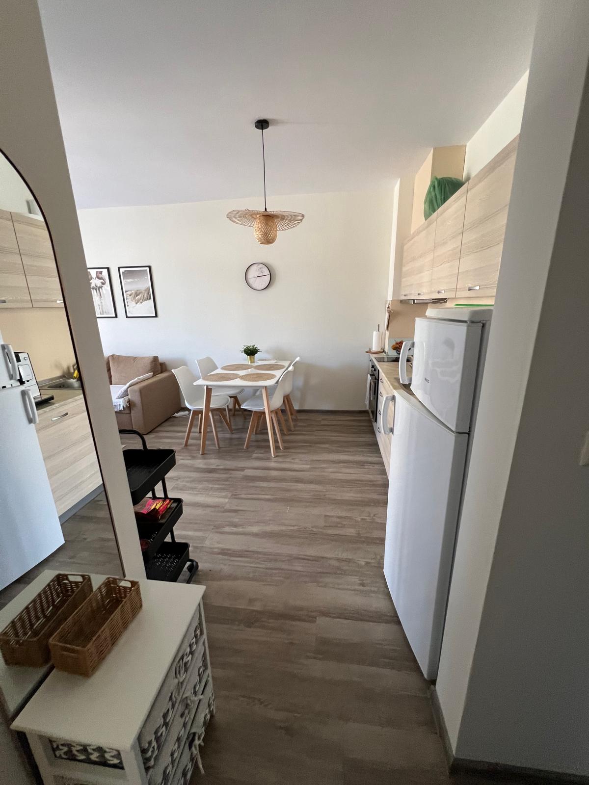 Апартаментът се предлага напълно обзаведен и оборудван, с функционално разпределение - входно антре, просторна всекидневна с кухненски бокс и трапезария, една спалня, баня с тоалетна и душ кабина, както и голяма тераса с изглед към вътрешния двор и басейна.