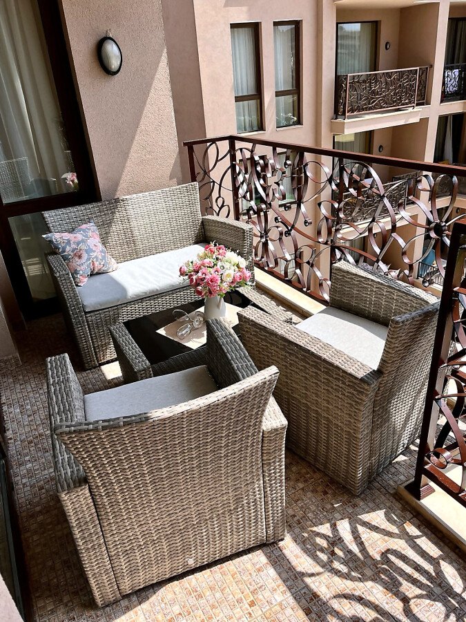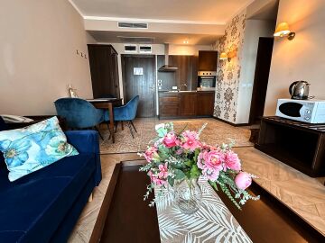 Апартаментът се продава в отлично състояние, напълно реновиран, с ново и модерно обзавеждане, качествено оборудване, напълно готов за нанасяне. Разпределението е следното – входно антре, уютна всекидневна с кът за хранене и кухненски бокс, слънчева спалня, баня с тоалетна и вана, балкон с хубаво обзавеждане и прекрасна гледка към басейна на комплекса.