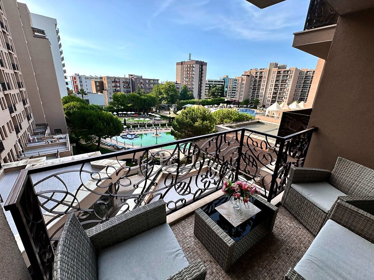 Предлагаме за продажба прекрасен двустаен апартамент с гледка към басейна в комплекс „Роял Бийч Барсело“, разположен на няколко метра разстояние от плажната ивица, в непосредствена близост до централната алея на курорта Слънчев бряг. Там може да се насладите на разнообразие от магазини и ресторанти, летни атракции, плажни барове.