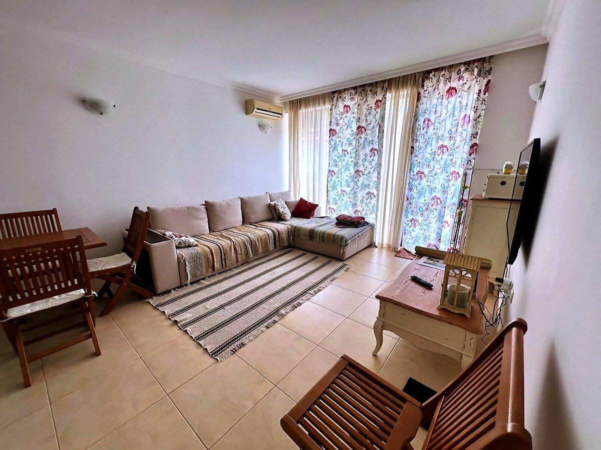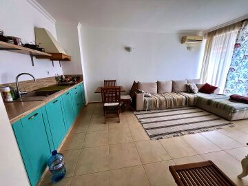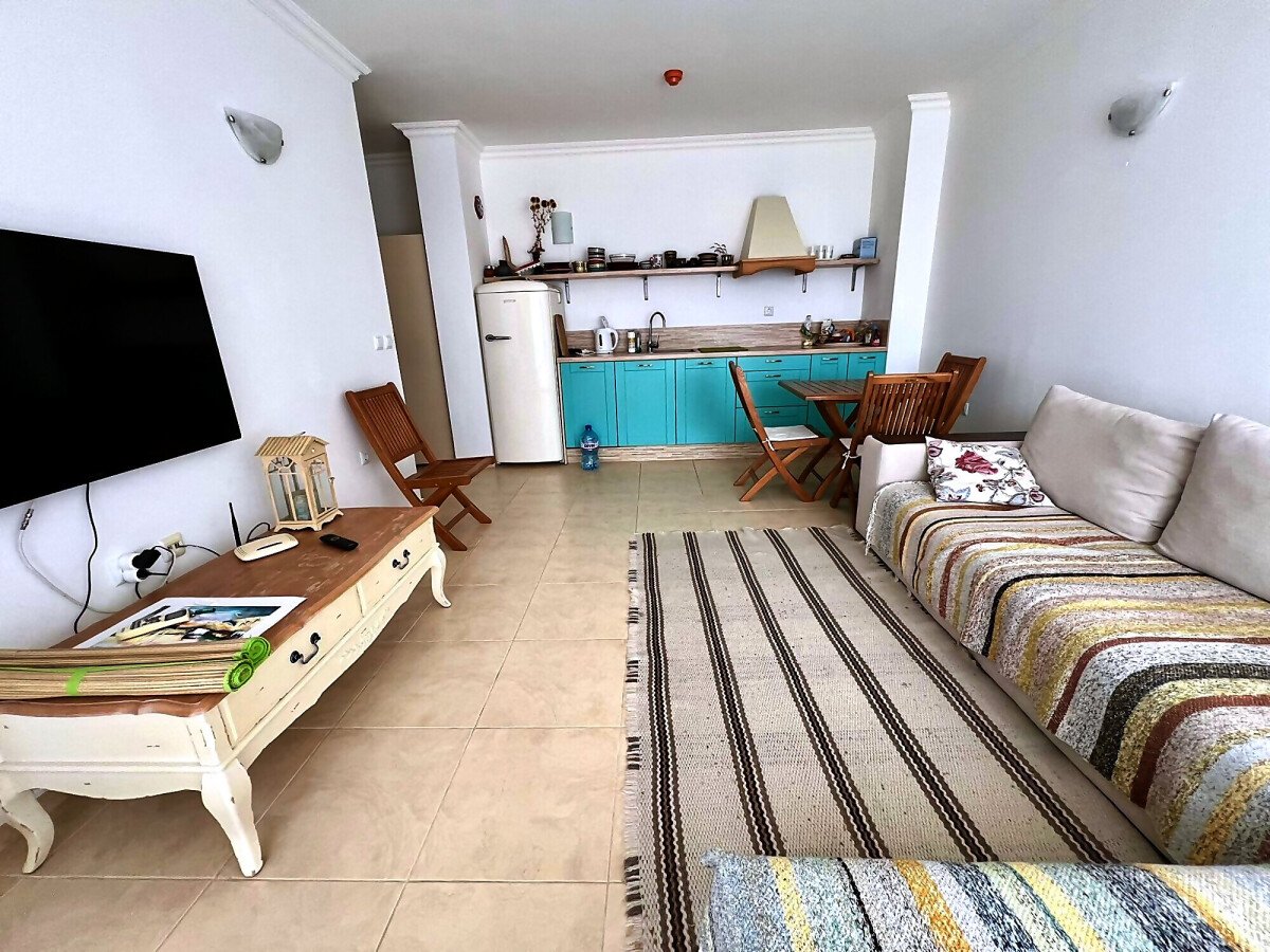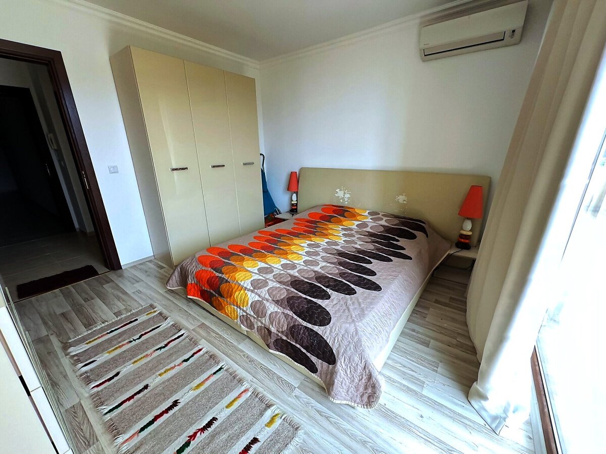Апартаментът е с площ от 60 кв.м. и се състои от входно антре, светла и просторна всекидневна с кухненски бокс и зона за хранене, уютна спалня, баня с тоалетна и душ кабина, голяма тераса с невероятна гледка към морето и басейна. Имотът е напълно обзаведен и оборудван с всичко необходимо за комфортно живеене или отдаване под наем.