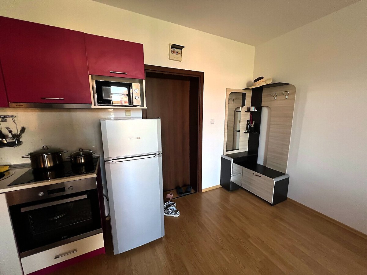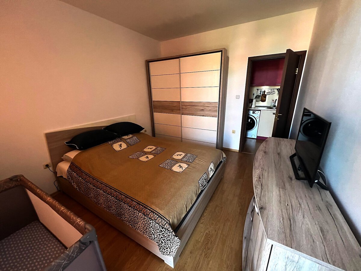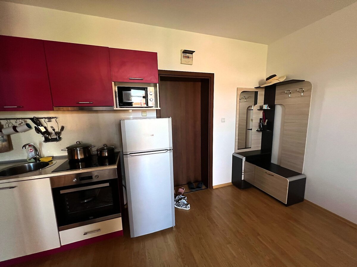 Апартаментът се продава в отлично състояние, напълно готов за живеене, със следното разпределение – всекидневна с обособен кухненски бокс, холна част и малък кът за хранене, баня с тоалетна, уютна спалня, балкон с чудесна гледка към озеленената част на комплекса и тенис корта.